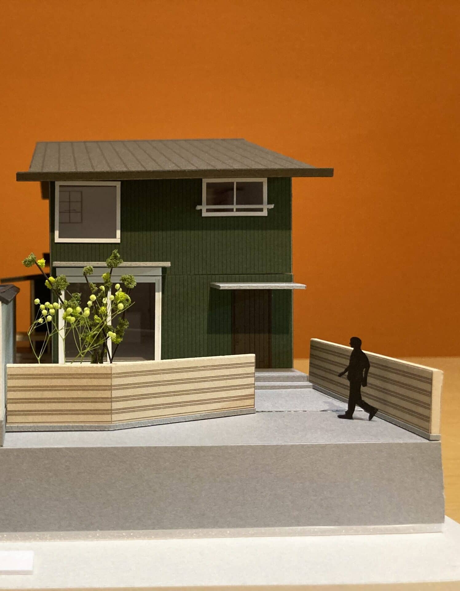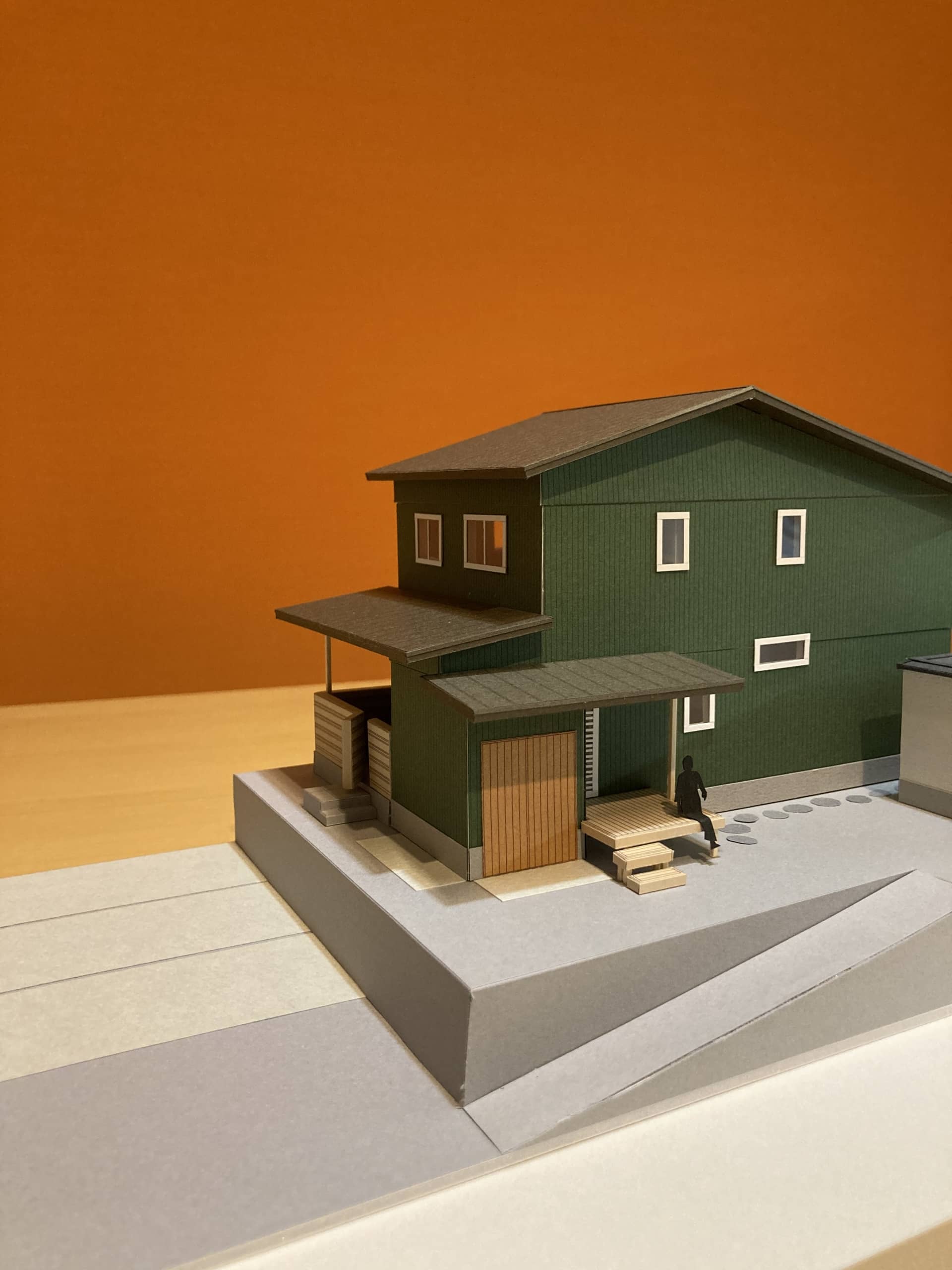 南北に長い土地に建つ、モスグリーンの外壁の2階建てのお住まいです。