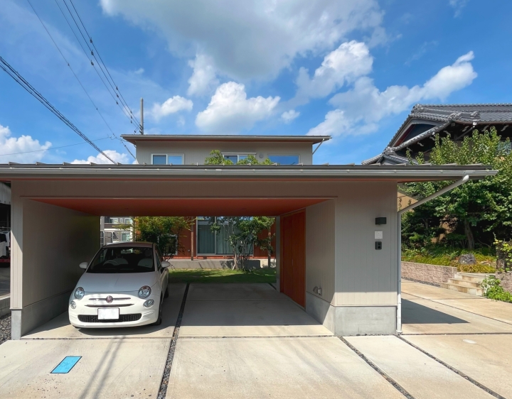 建物と同じ色味で統一されたビルトインガレージが出迎えてくれる、スタイリッシュな外観✨
