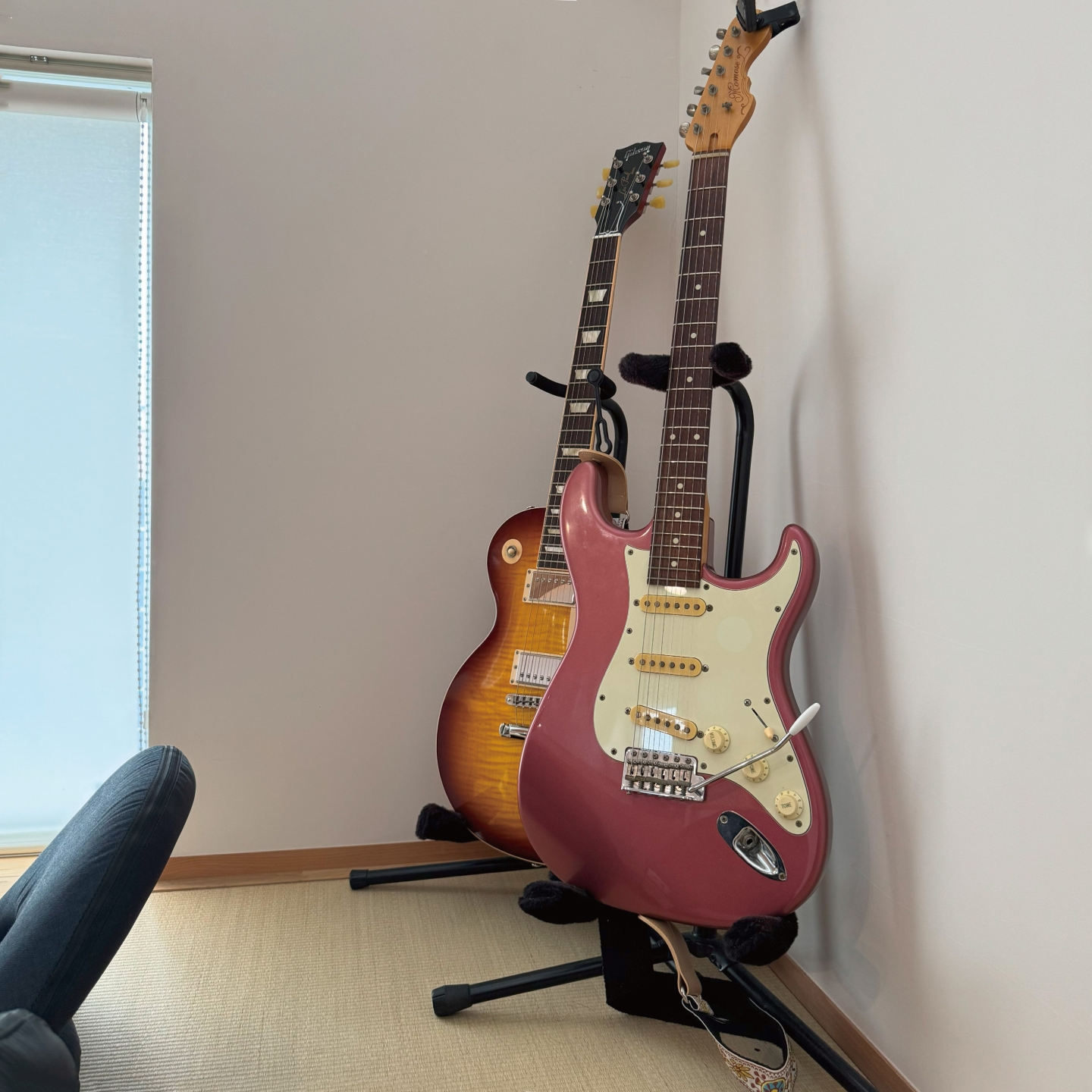 一方、反対側の壁にはギターハンガーと大きなアンプ。ご主人のこだわりが感じられる、お気に入りのギターが堂々と存在感を放っていました。