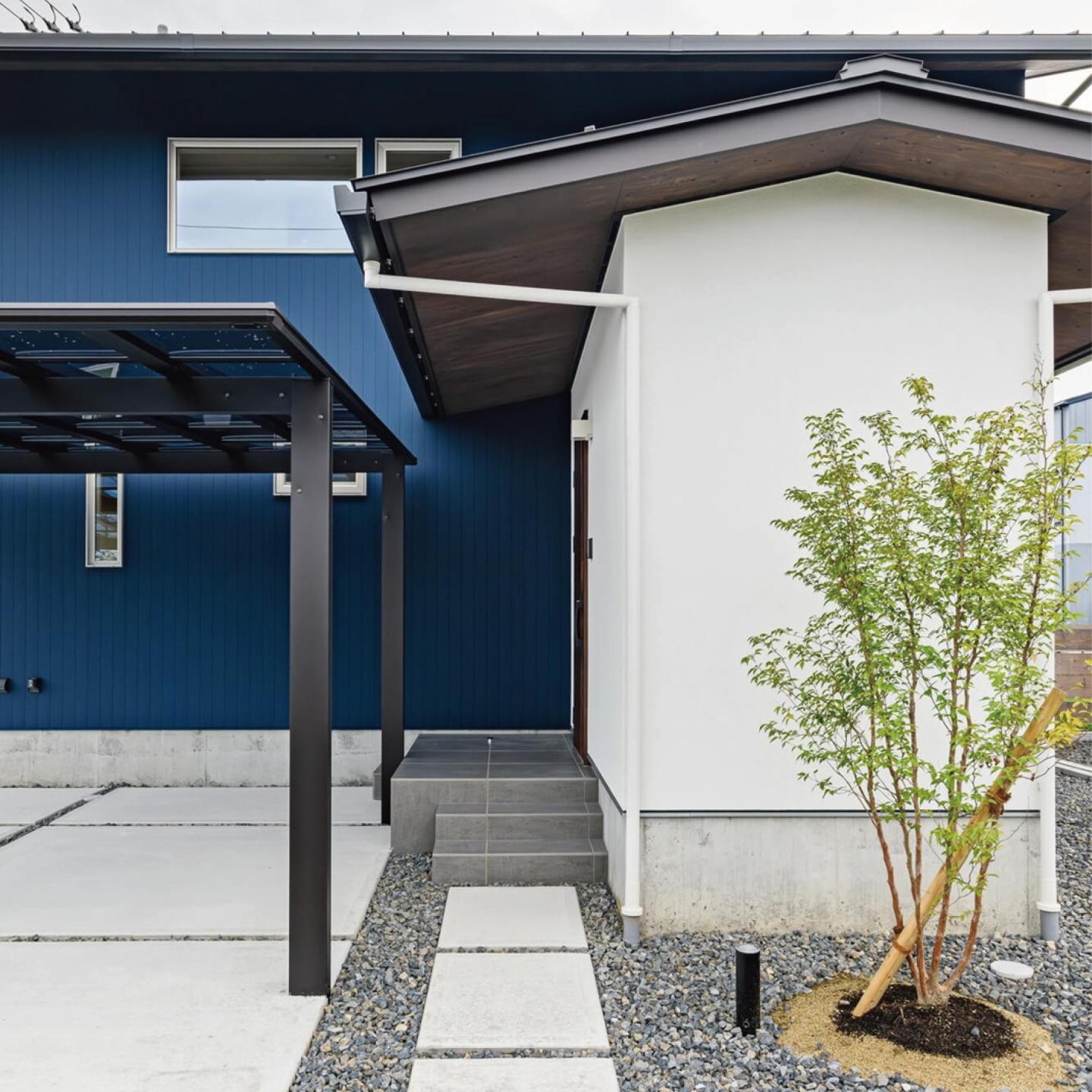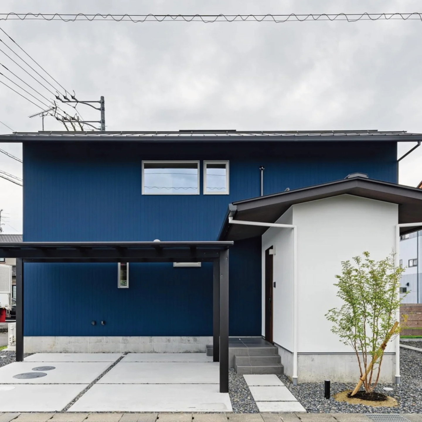 周囲の景色に調和しつつも存在感のある、鮮やかな青色のガルバリウム外壁に、白い塗り壁がアクセントとして効いたモダンな外観が印象的です。