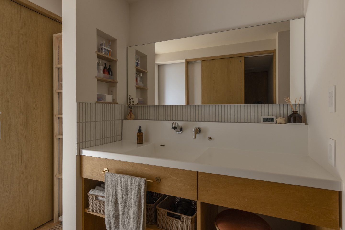 格子扉のすぐ隣には、帰宅してすぐに手を洗うことができる造作洗面も。素材や高さ、細部の納まりまで丁寧に考えられた設えからは、この住まいを形づくるために重ねられた細やかな設計の積み重ねが伝わってきます。