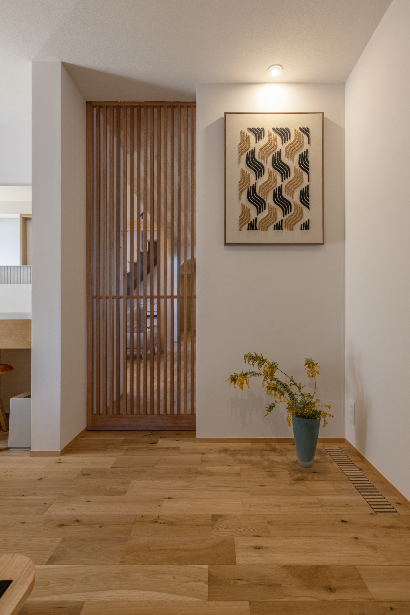 さらに、リビングへと続く木製格子の扉が空間に奥行きとリズムを生み出し、玄関全体をいっそう洗練された印象へと引き立てていました。