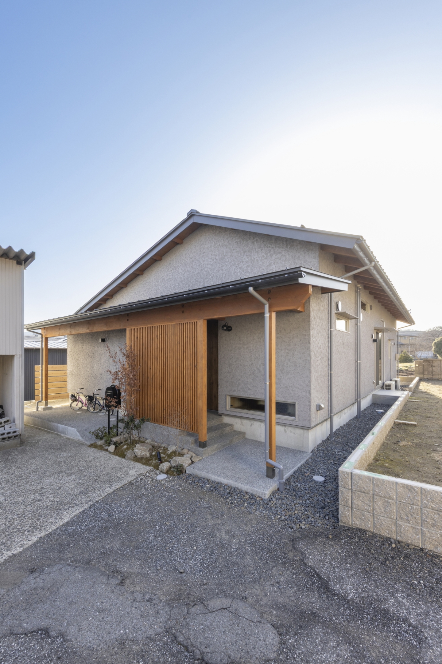 外壁には、シラス台地の火山灰を原料とした自然素材の外壁材「そとん壁」。そこに木製格子が調和し、和モダンの落ち着いた佇まいを生み出しています。やさしい雰囲気をまといながらも、どこか凛とした重厚感を感じさせる平屋のお住まいです。
