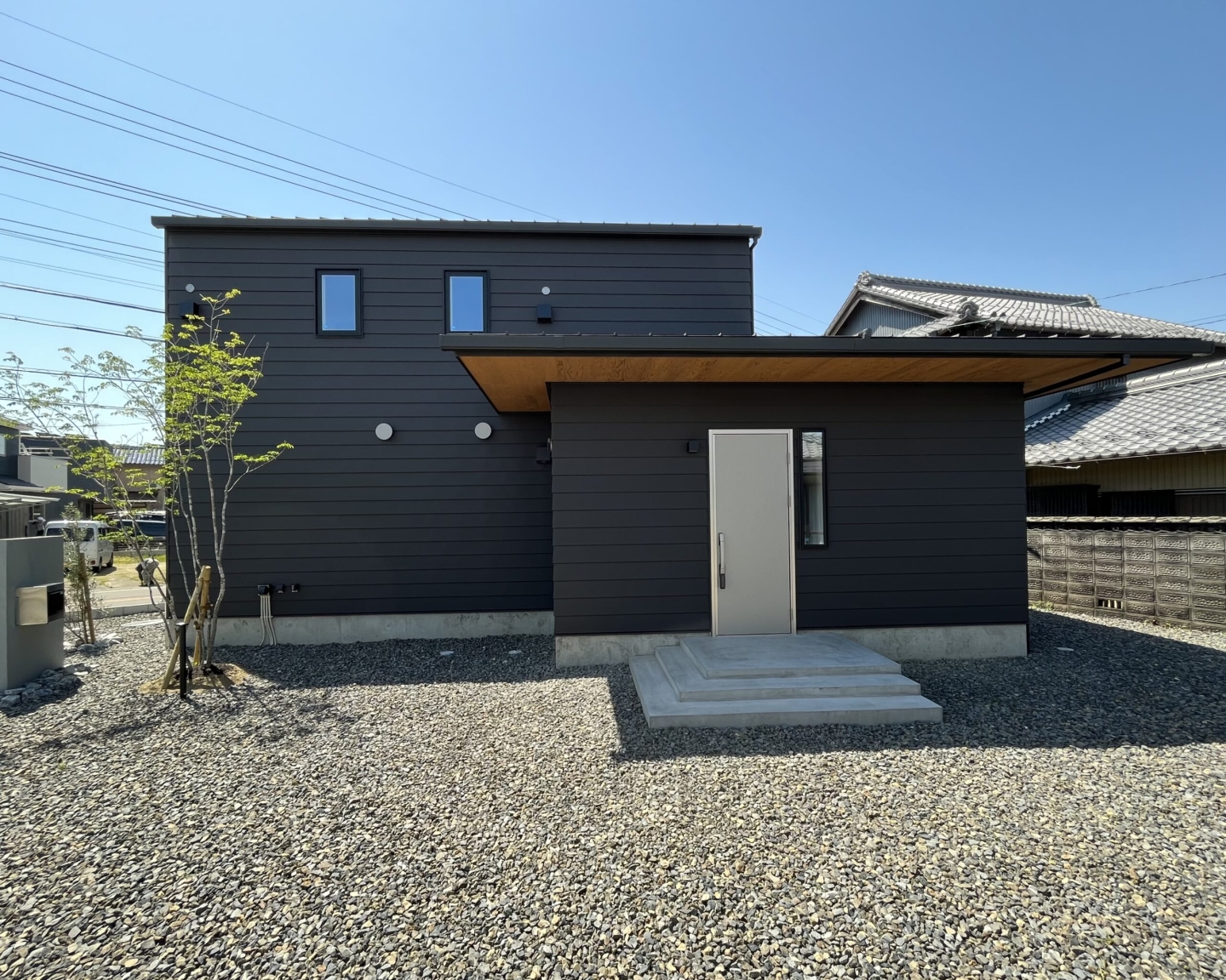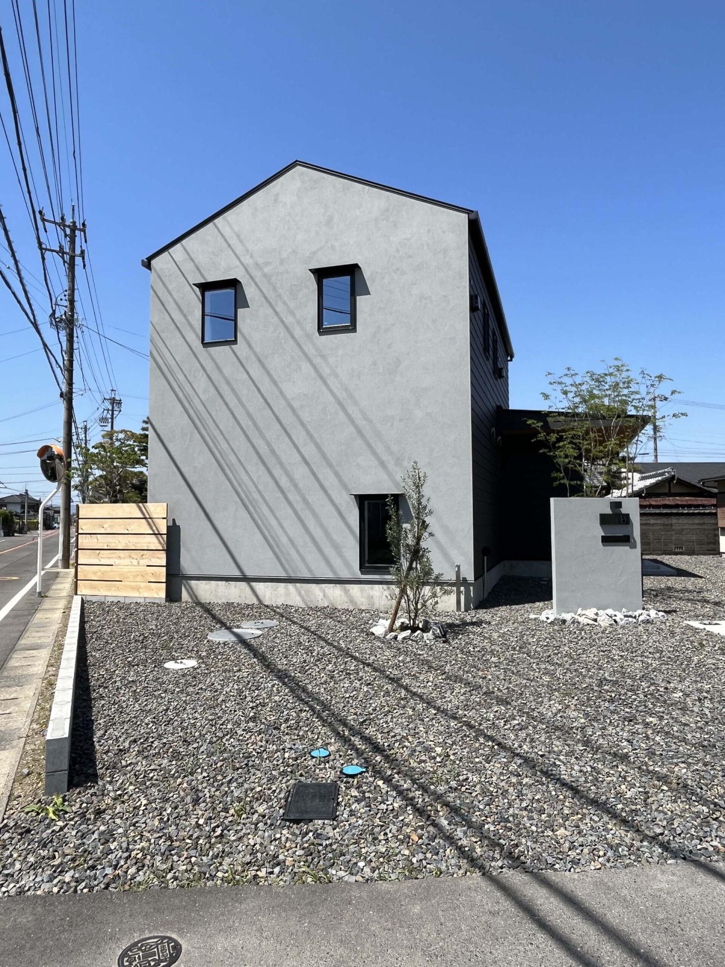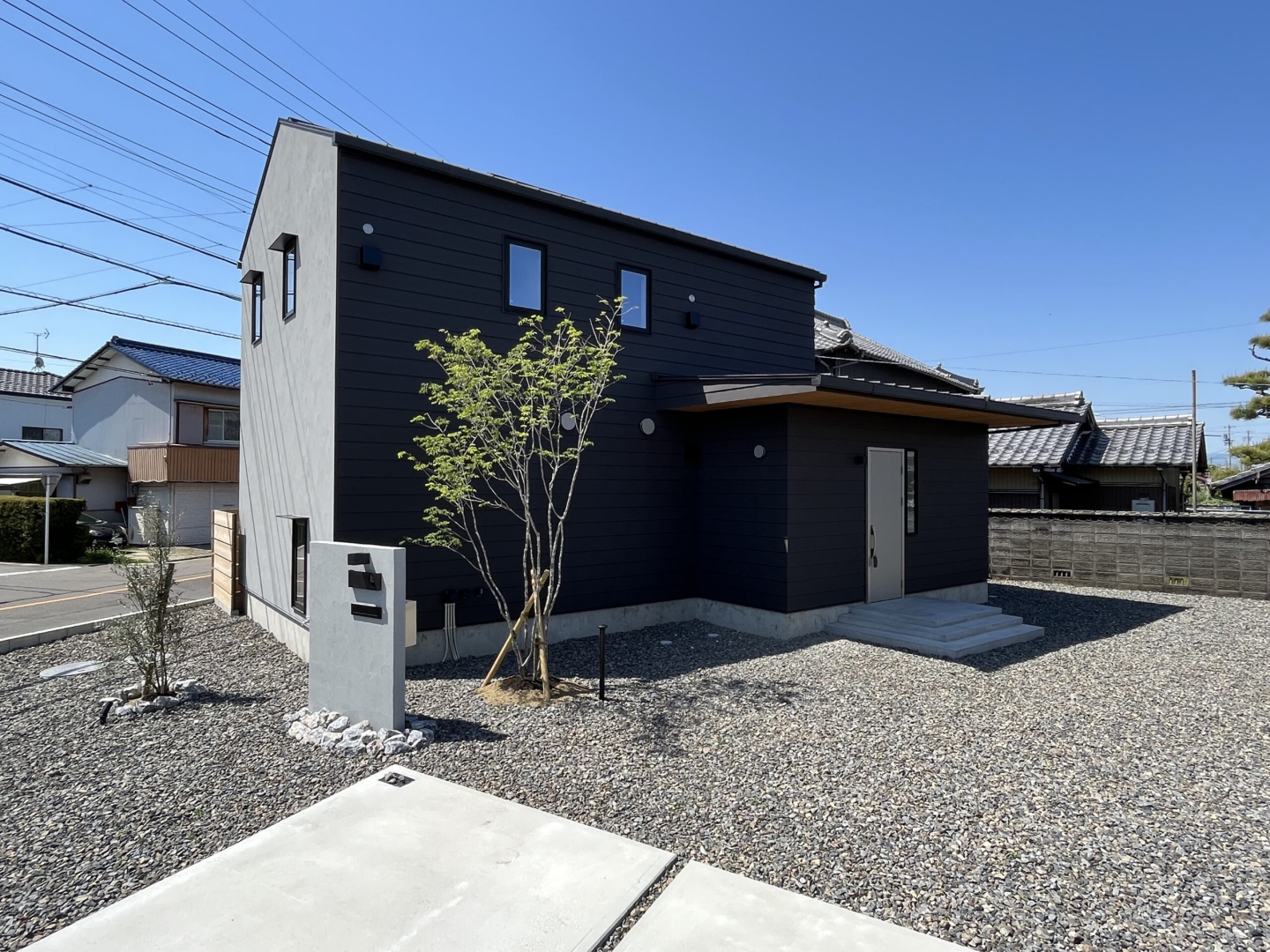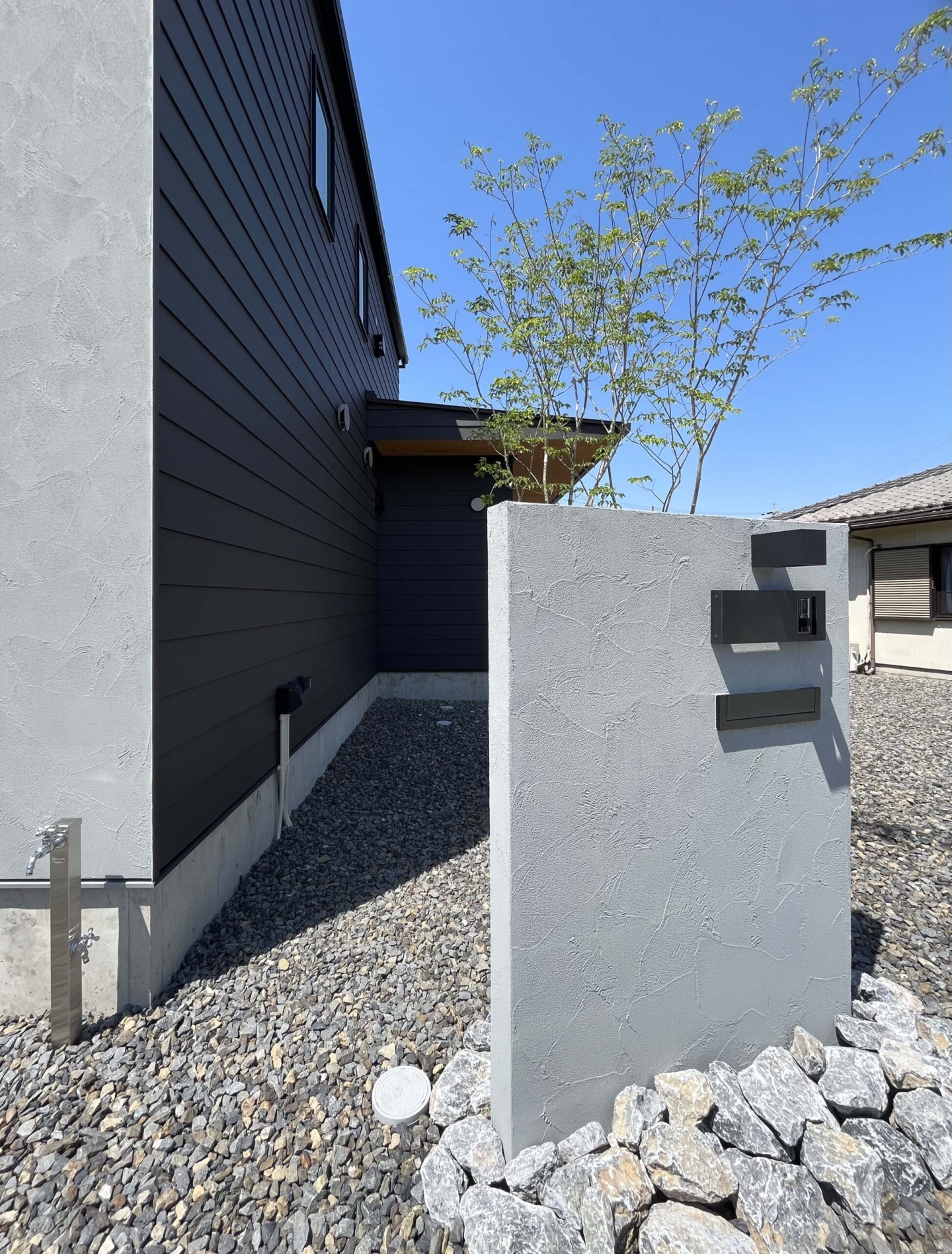 外観にはブラックのガルバリウムとシャークグレーの塗り壁を採用。シックな印象に仕上がりました。