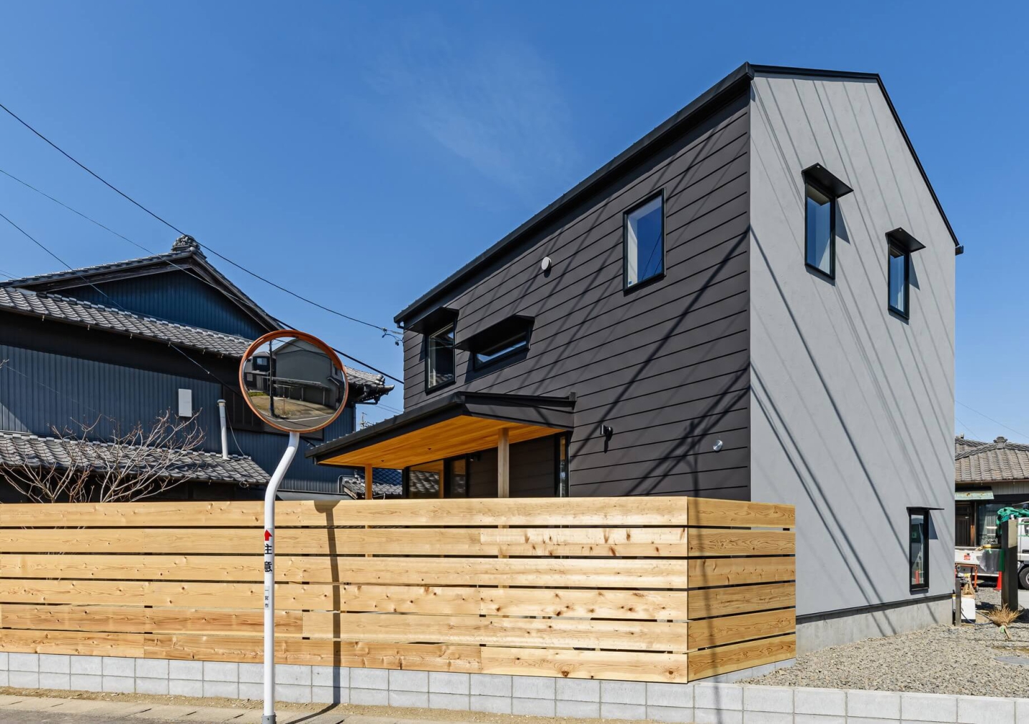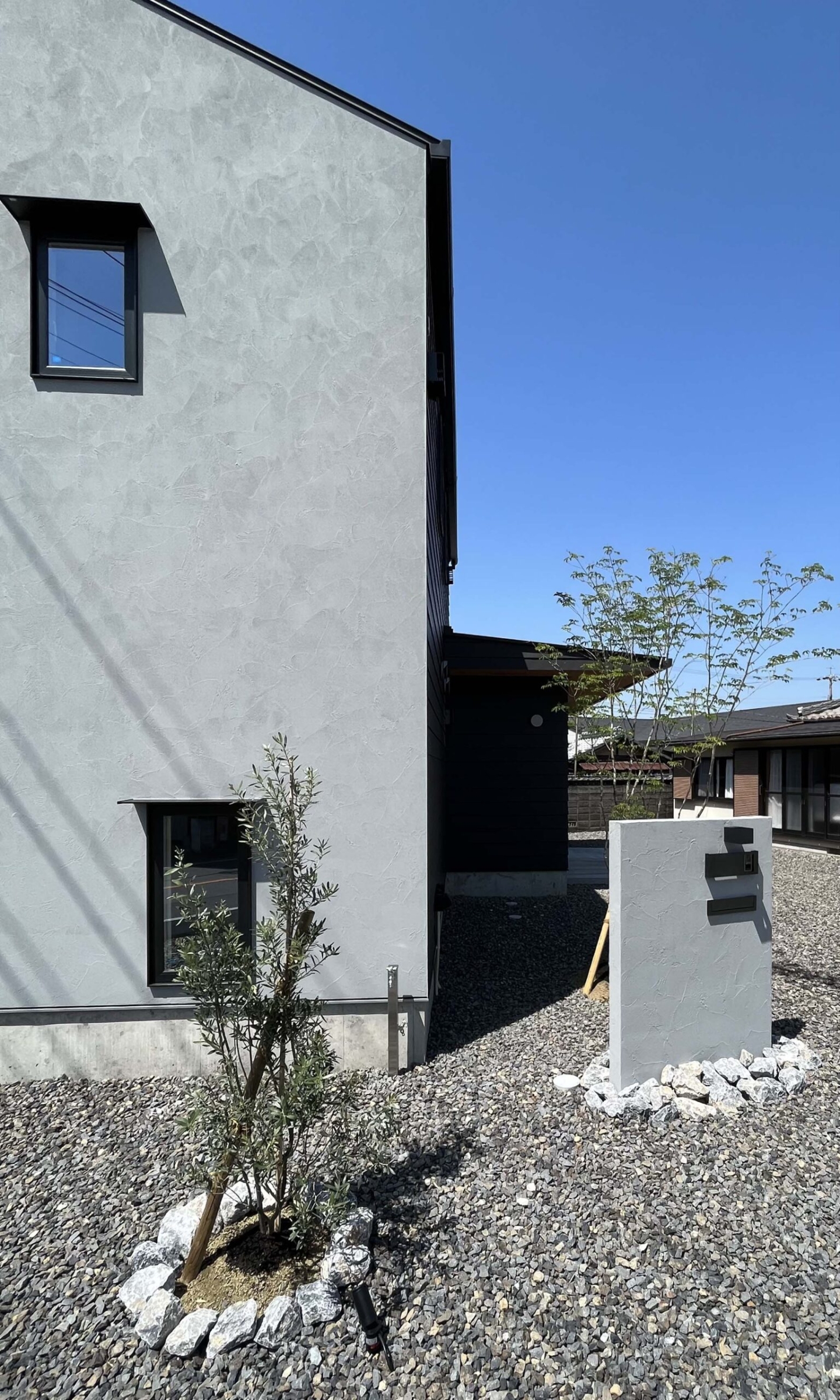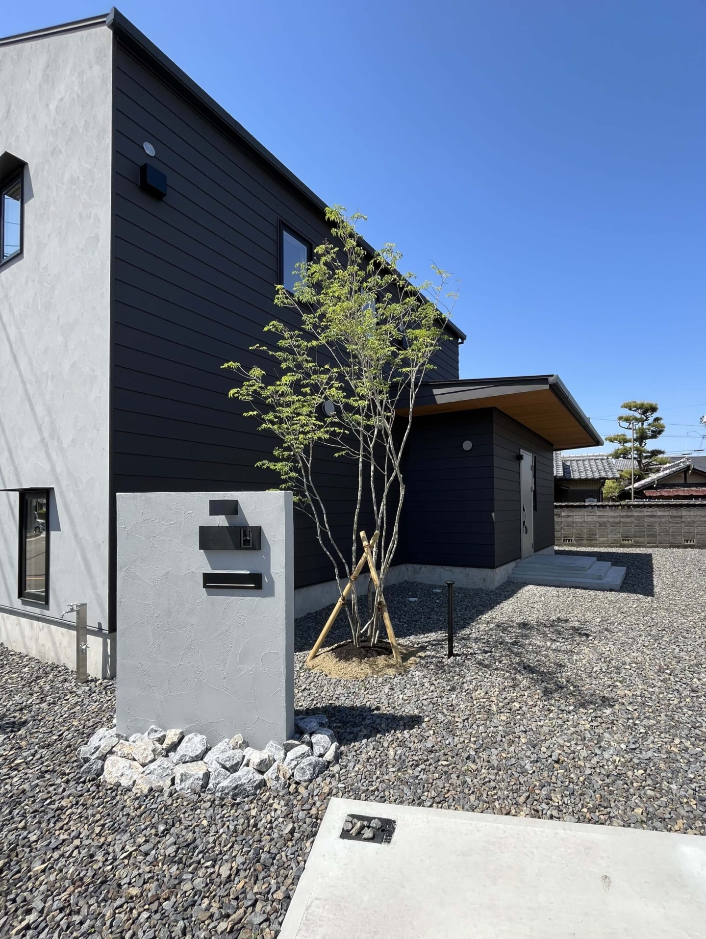 外観にはブラックのガルバリウムとシャークグレーの塗り壁を採用。シックな印象に仕上がりました。