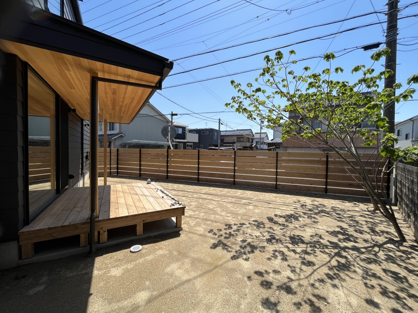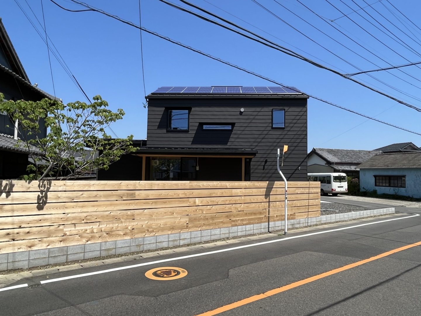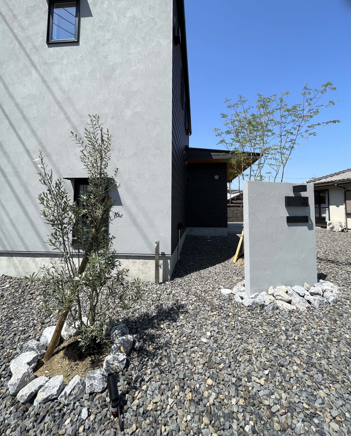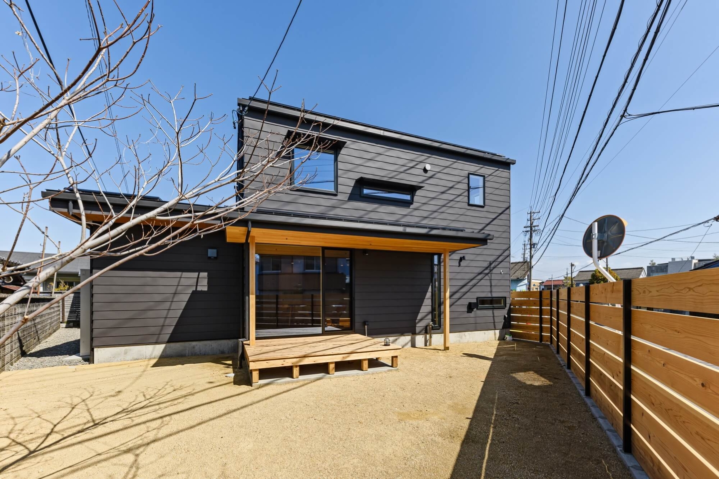 外観にはブラックのガルバリウムとシャークグレーの塗り壁を採用。シックな印象に仕上がりました。