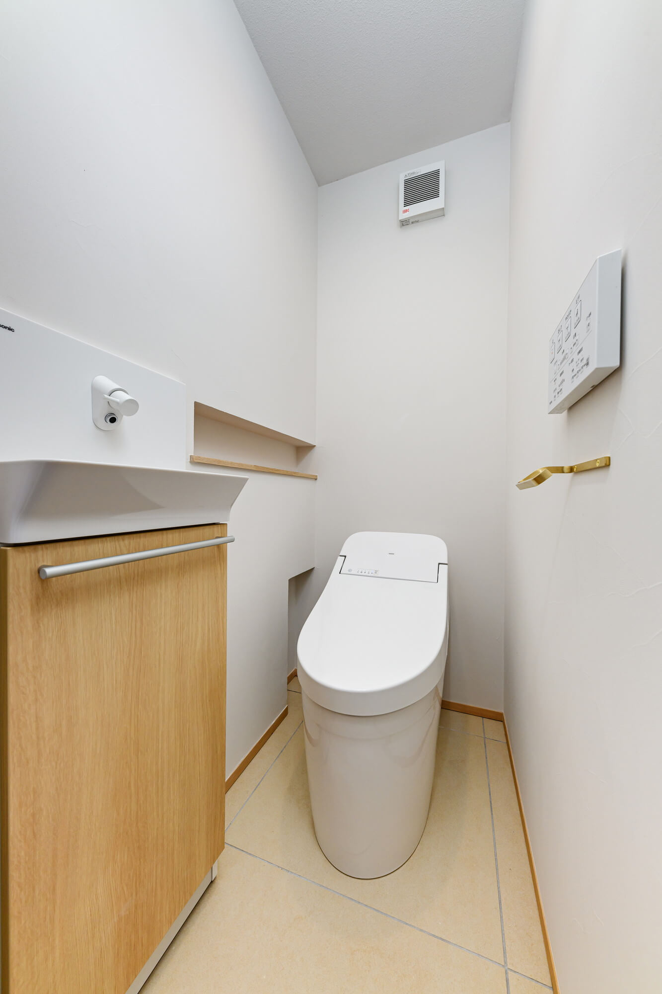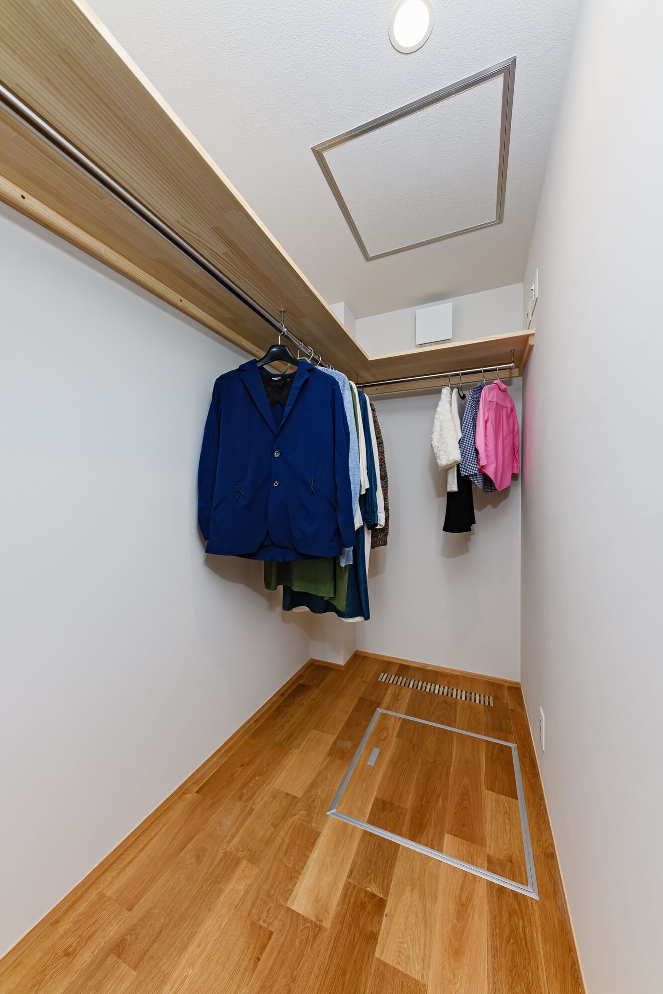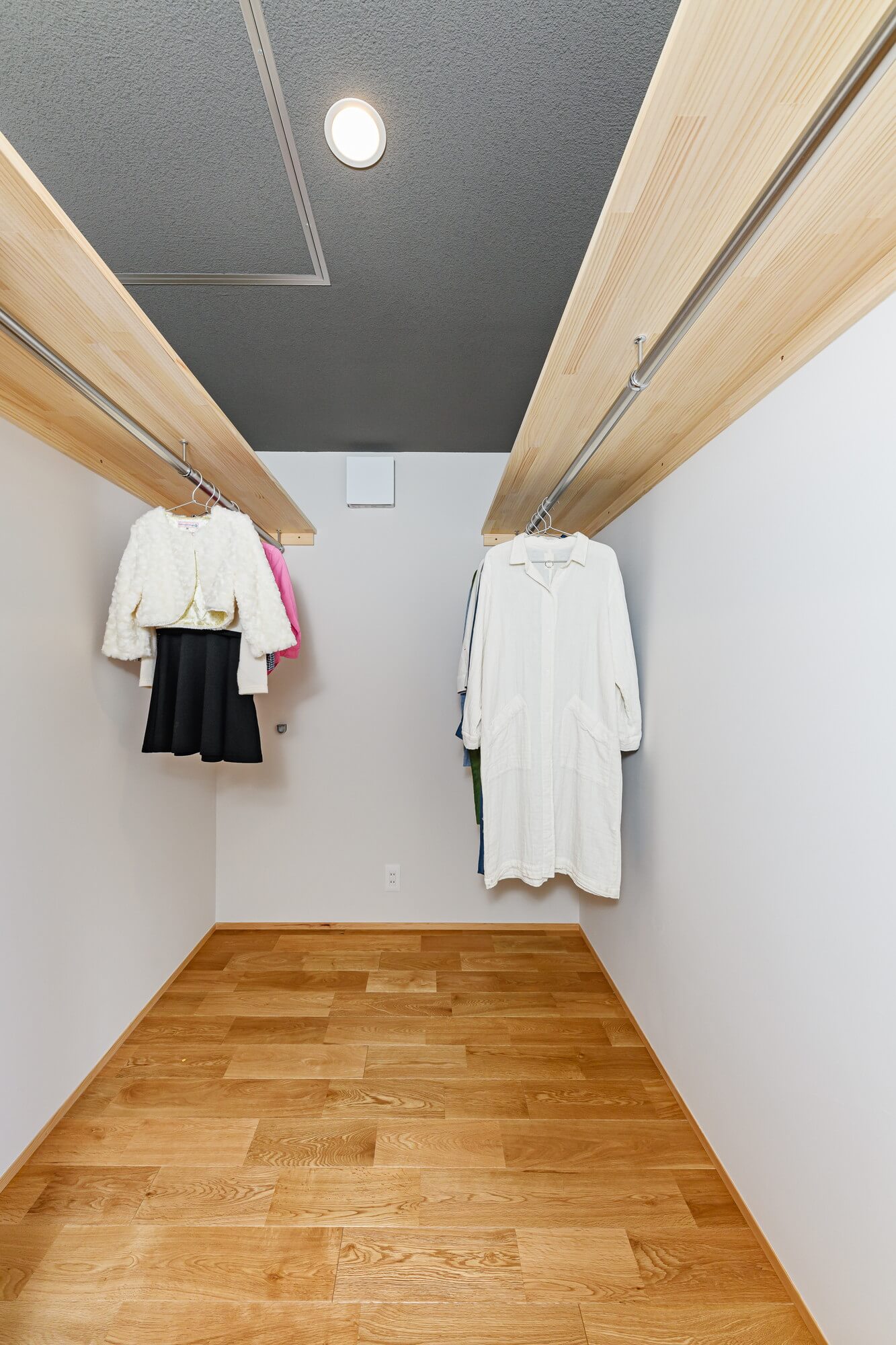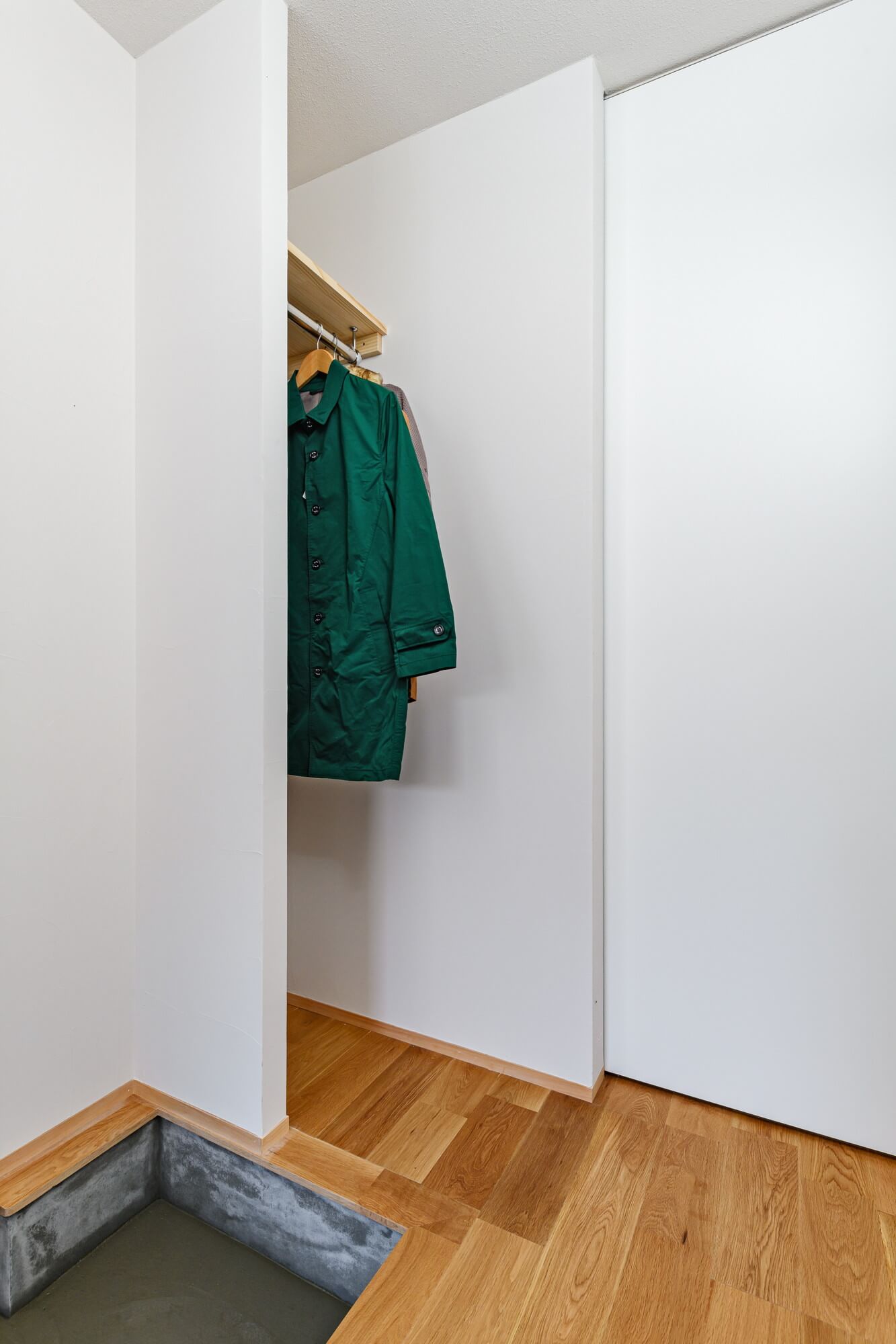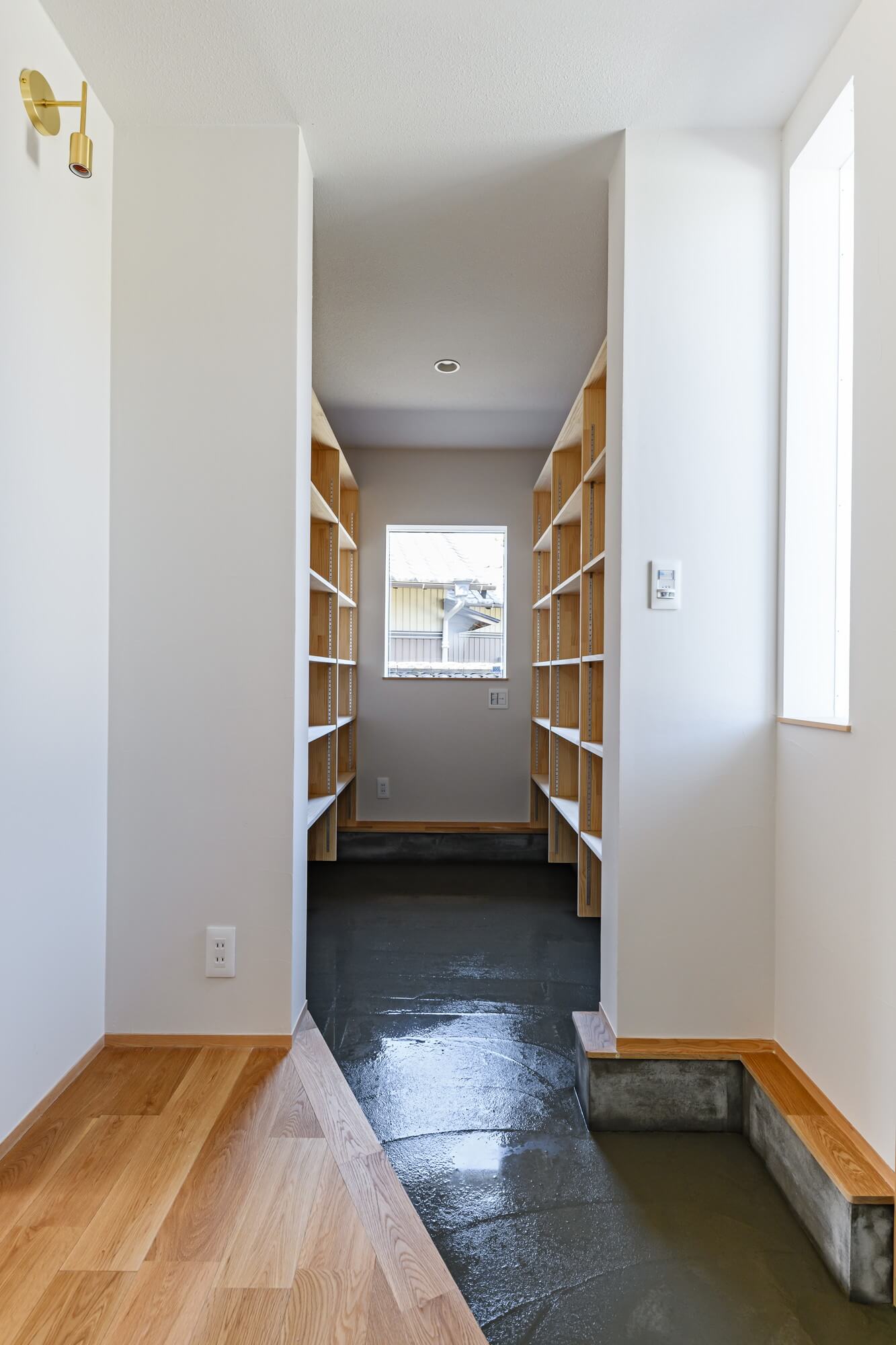 玄関には天井まで高さがある造作棚を設置し、スッキリと片付きます。