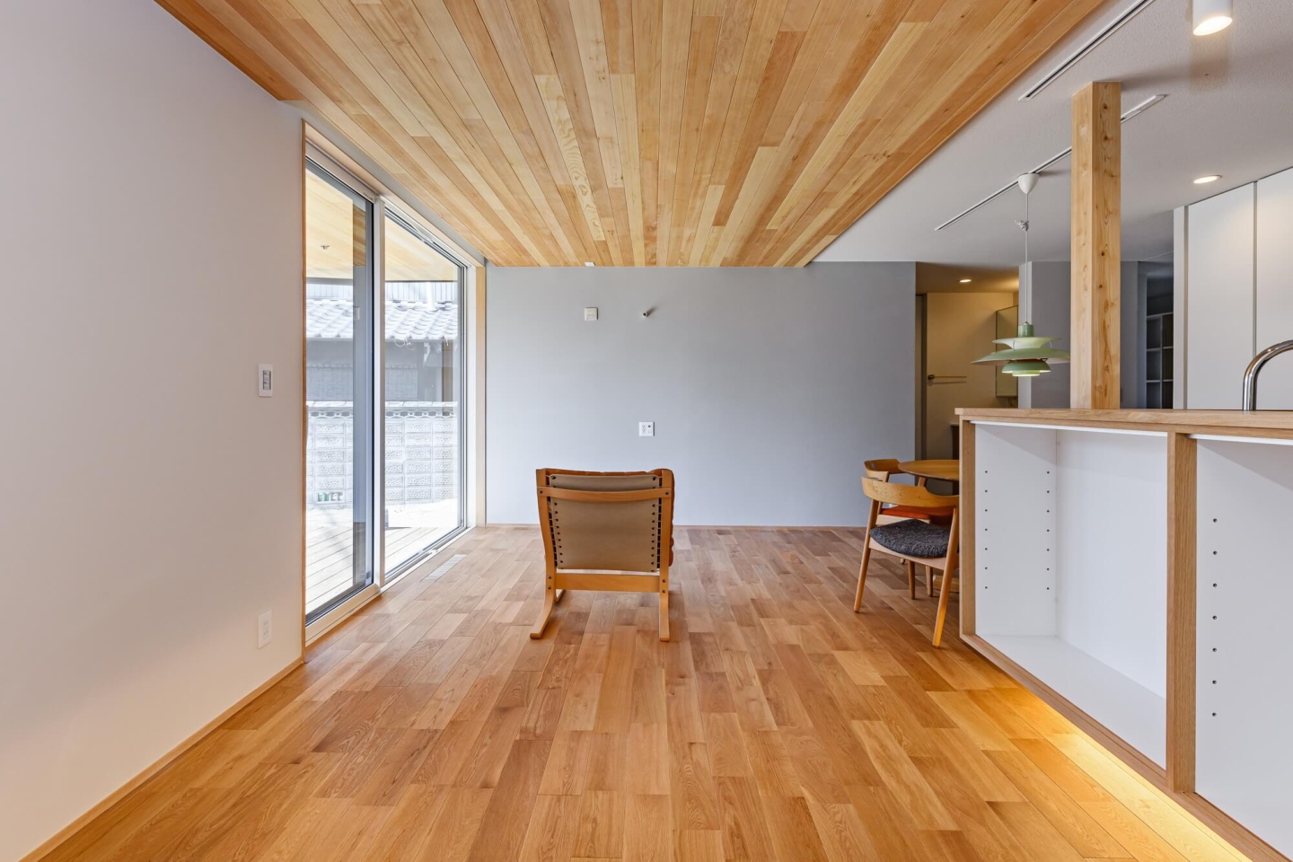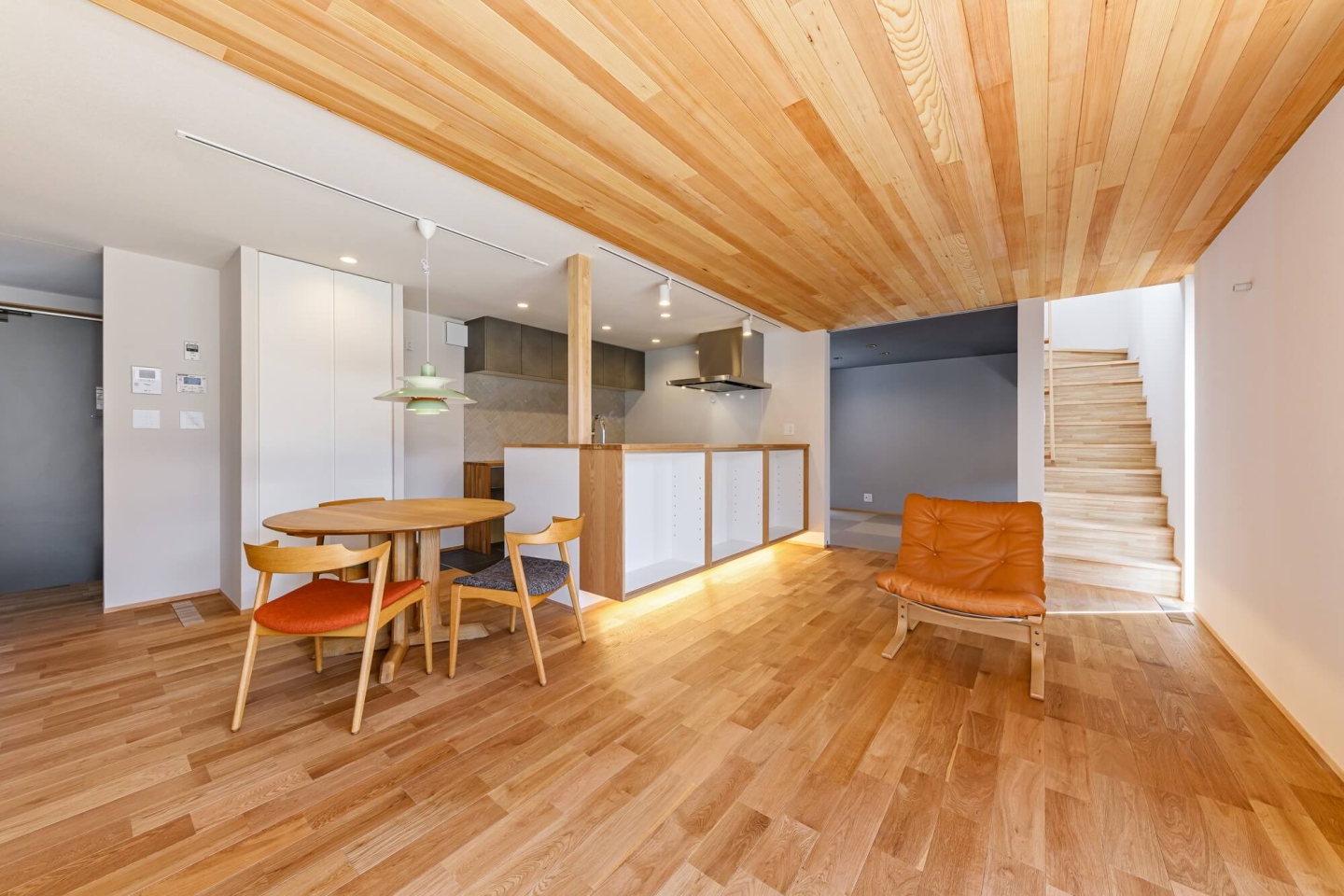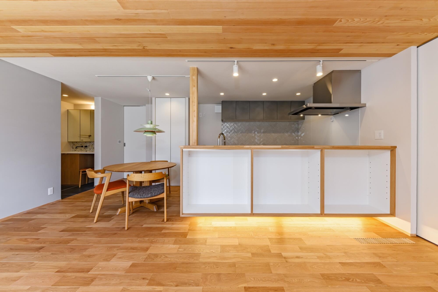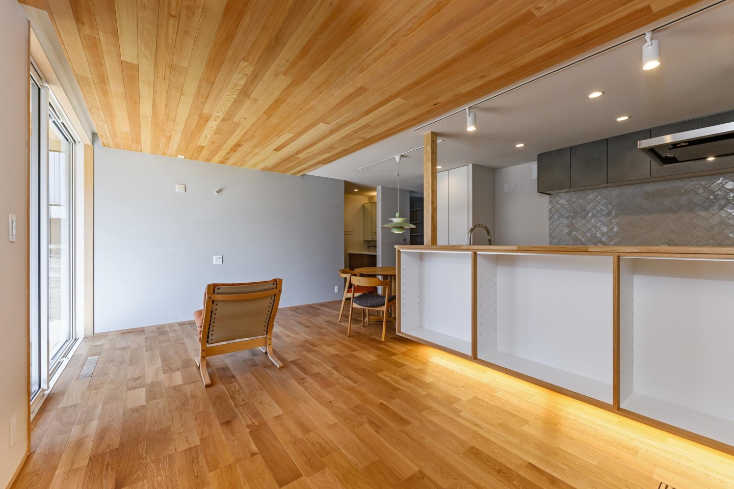 LDKは木とグレー系ぬりかべのコントラストがオシャレな空間に。キッチンのカラーや背面のタイルも同系色のものを選択して統一感を持たせました。