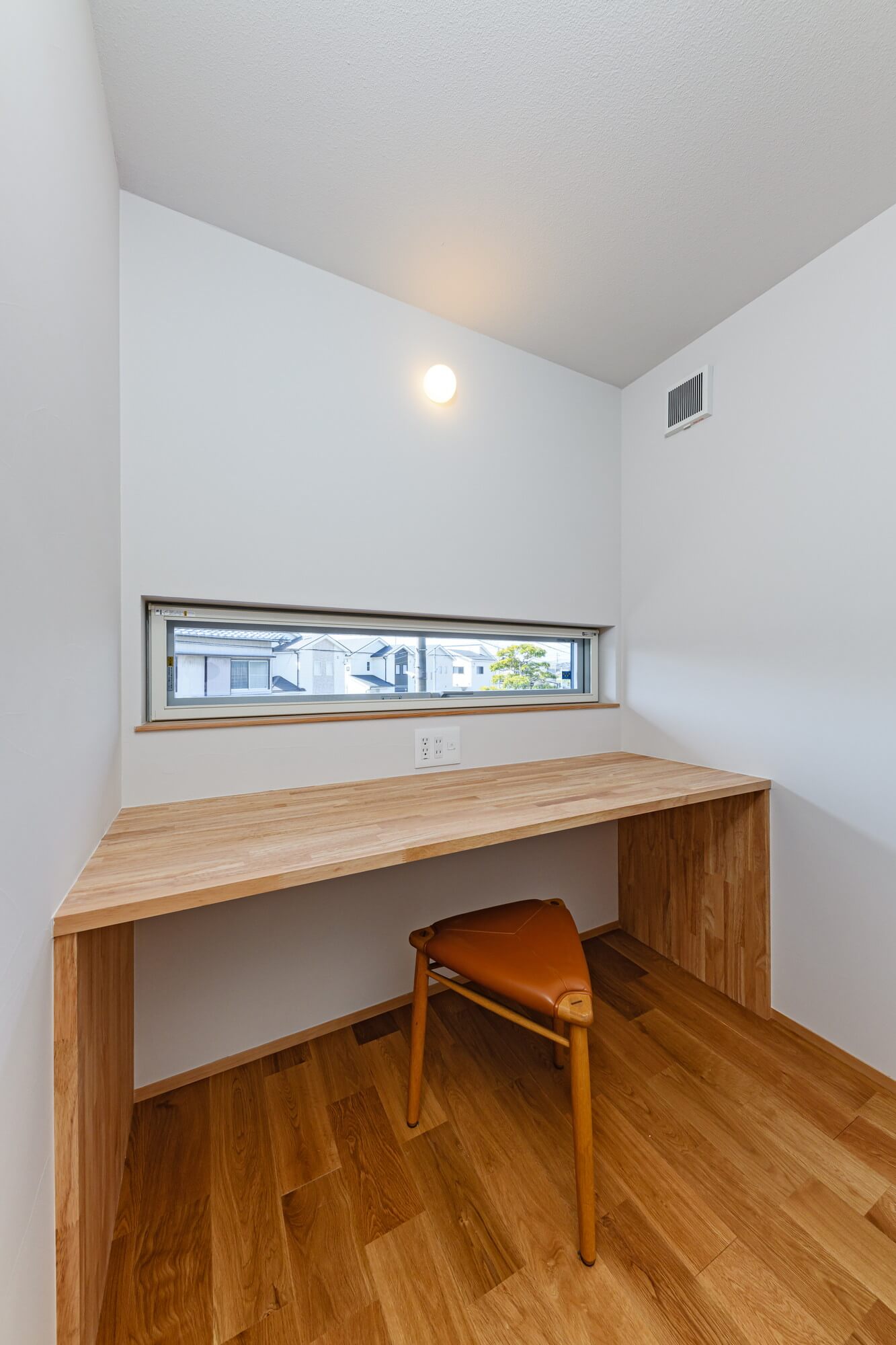 2階には1.5帖の書斎を配置。外の景色を眺めながら時には息抜きもしつつ、作業をすることが出来ます。