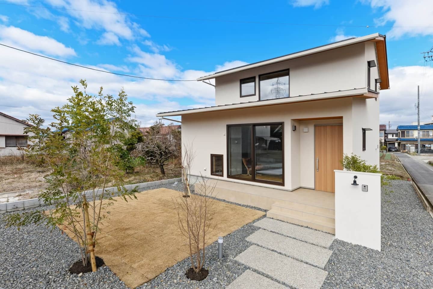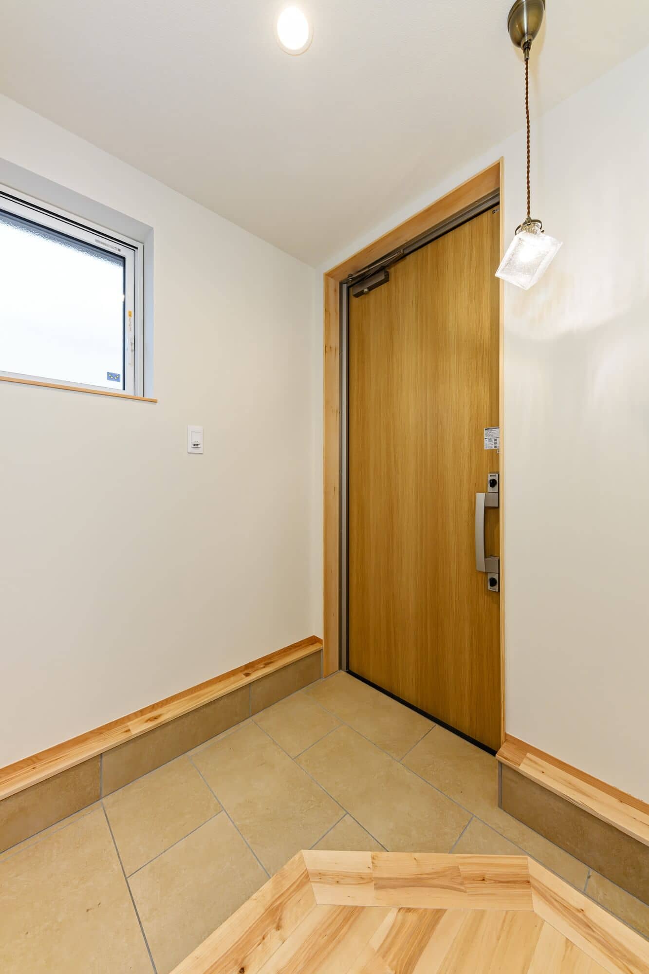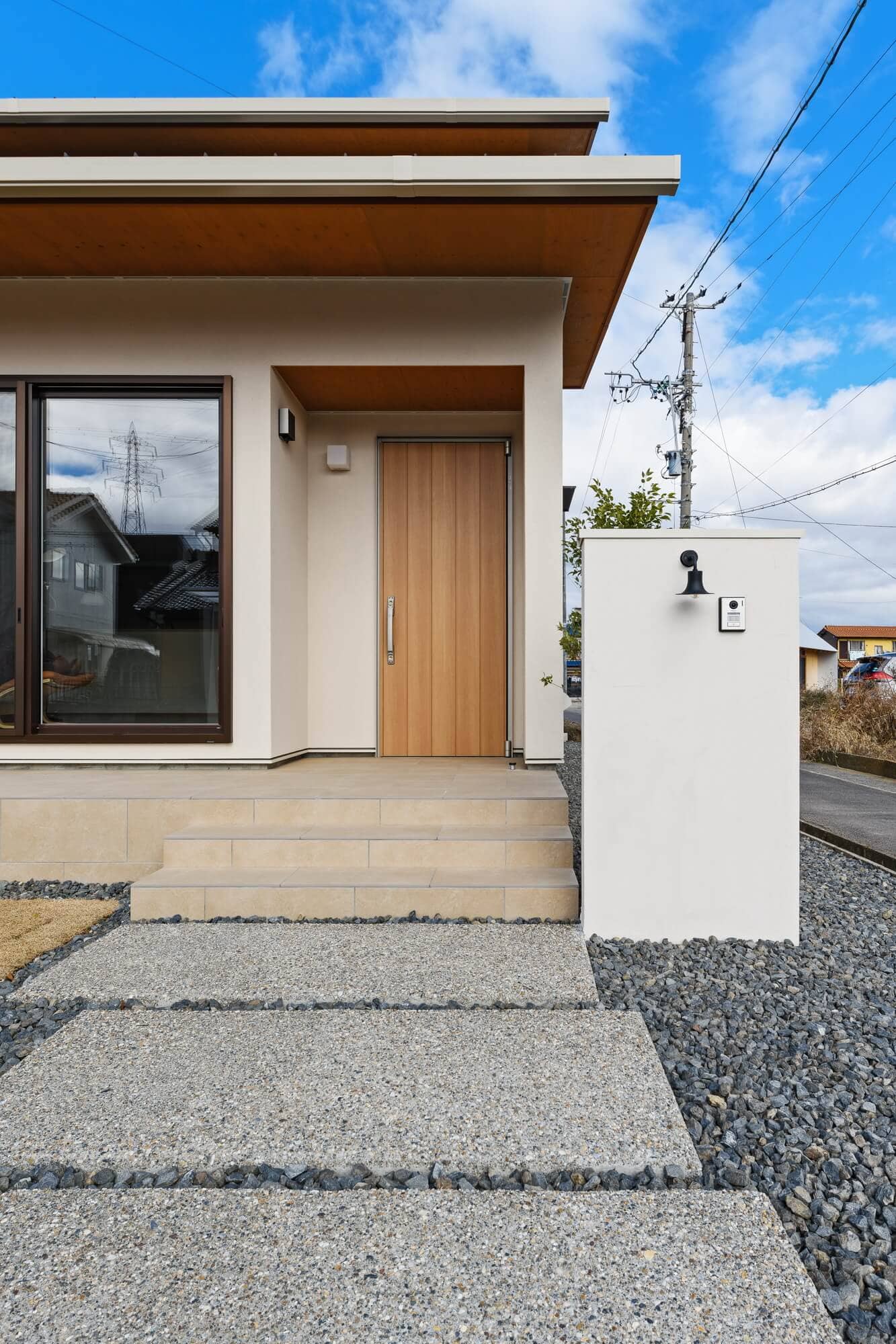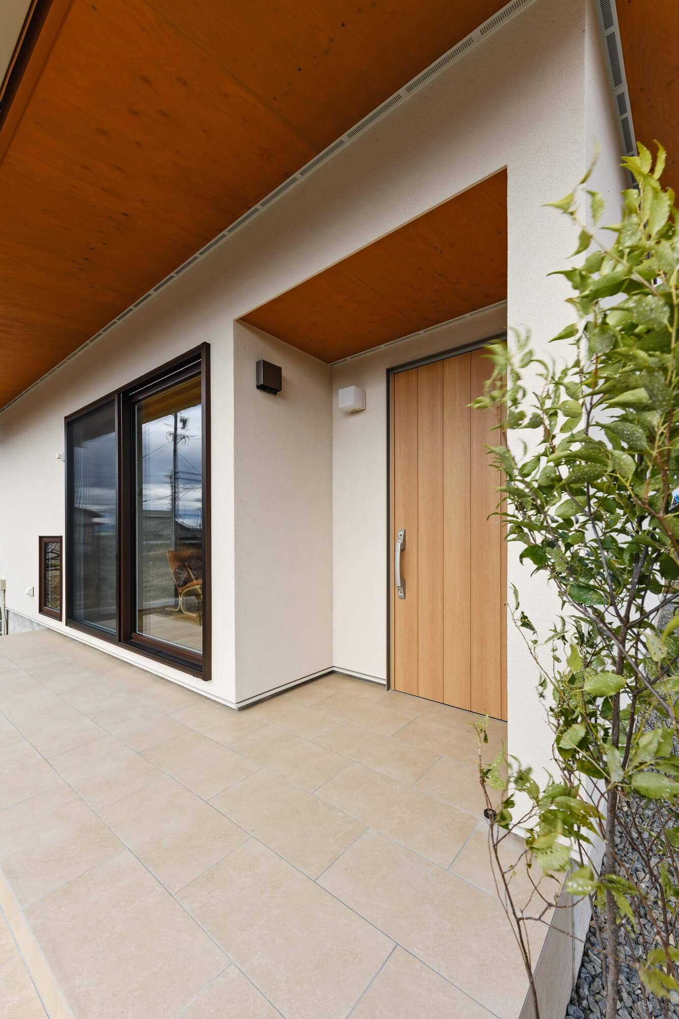 玄関は、デッキとポーチが一体となった作りをしています。デッキのカラーにベージュ、玄関ドアにも木のぬくもりが感じられるものを採用し、外観の色味にもこだわりました。