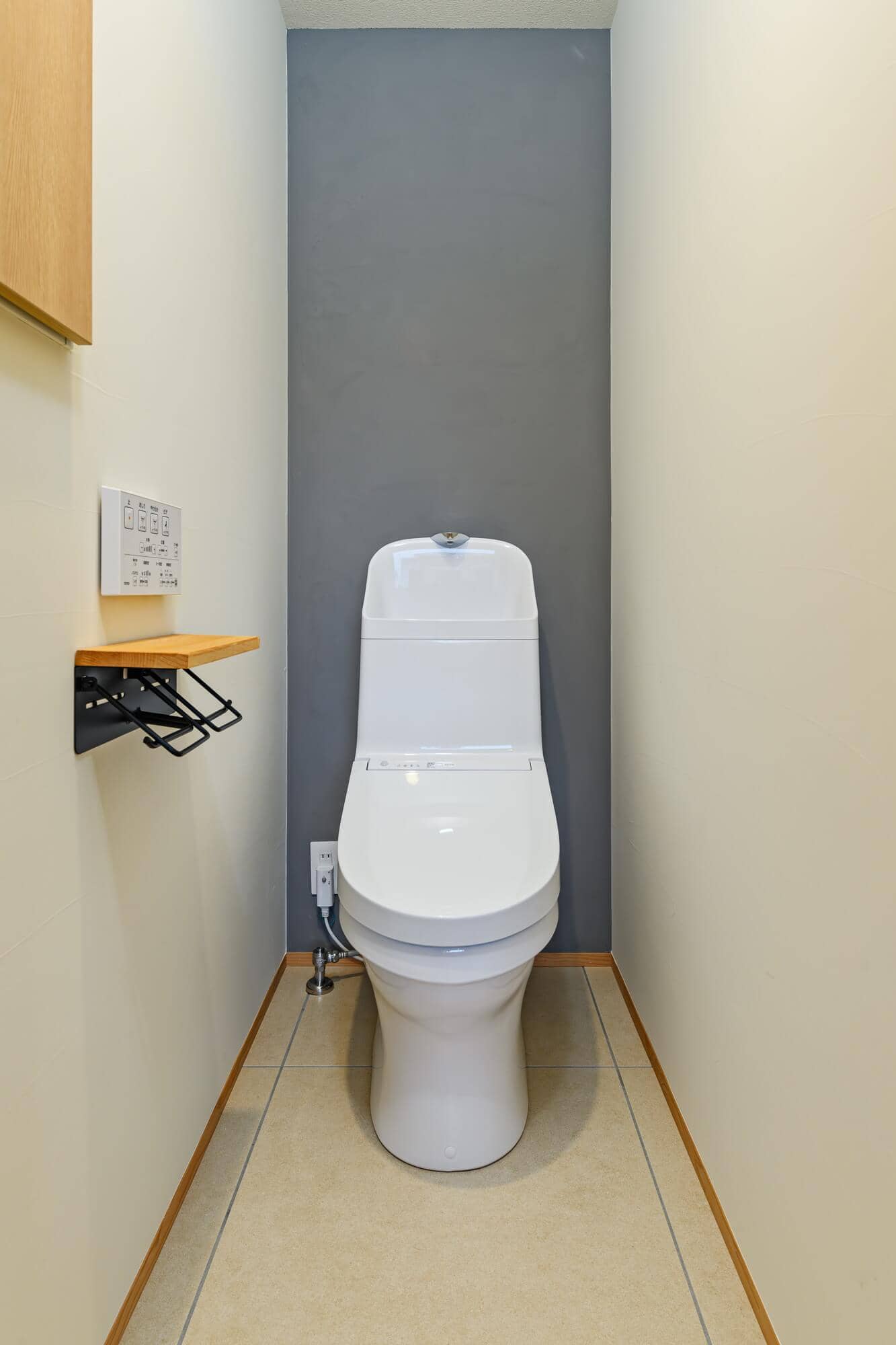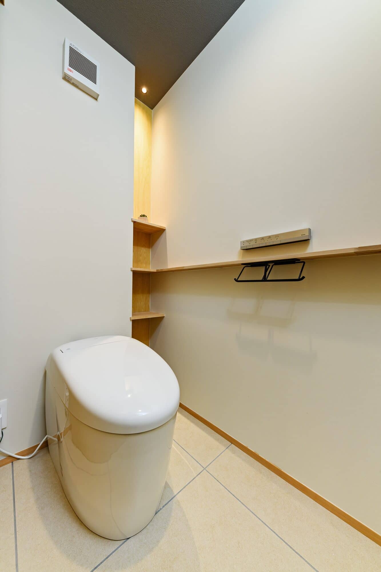 トイレは少し広めで、将来に渡り使いやすい空間を意識してつくりました。収納も配置したので、スッキリと片付きます。