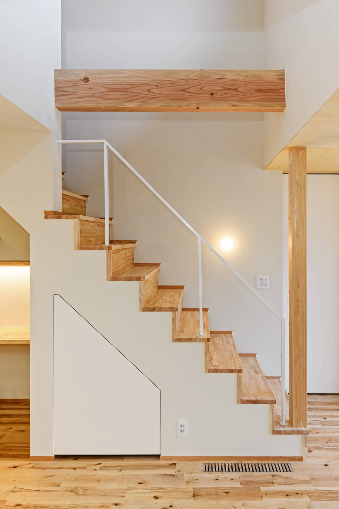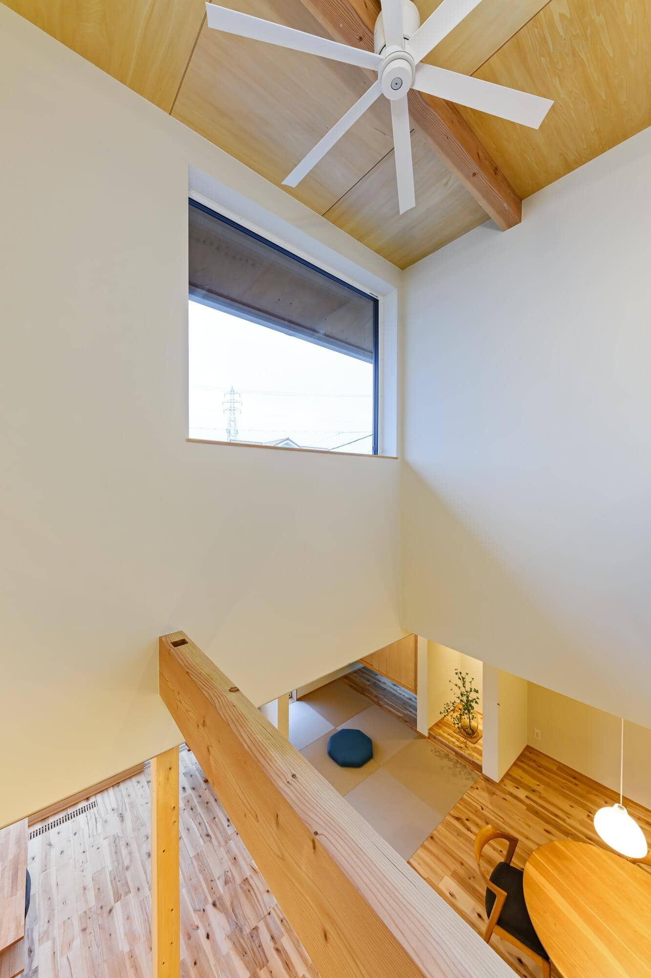 室内の塗り壁はホワイト系の色をメインカラーとし、リビングにも吹き抜けを配置したので、明るく過ごすことのできる室内になりました。