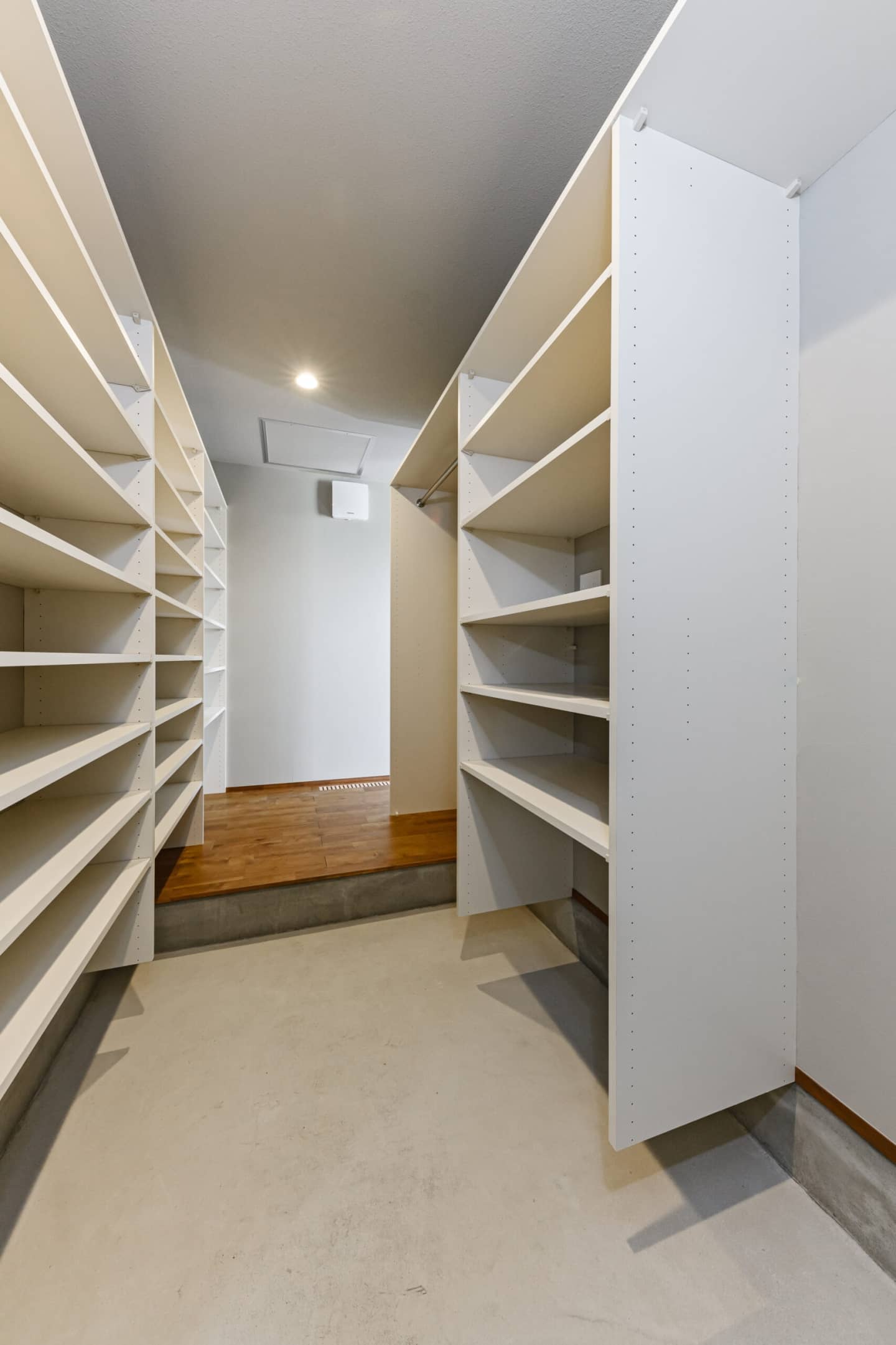 玄関には広々収納を設置。土間から使う部分と上がってから使う部分を作り、多目的に収納できるスペースになりました。