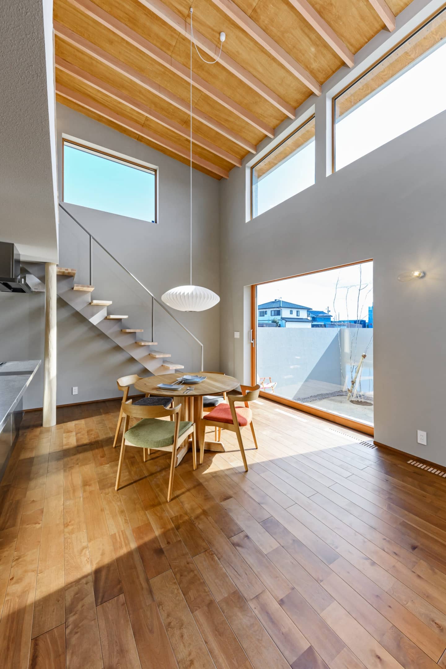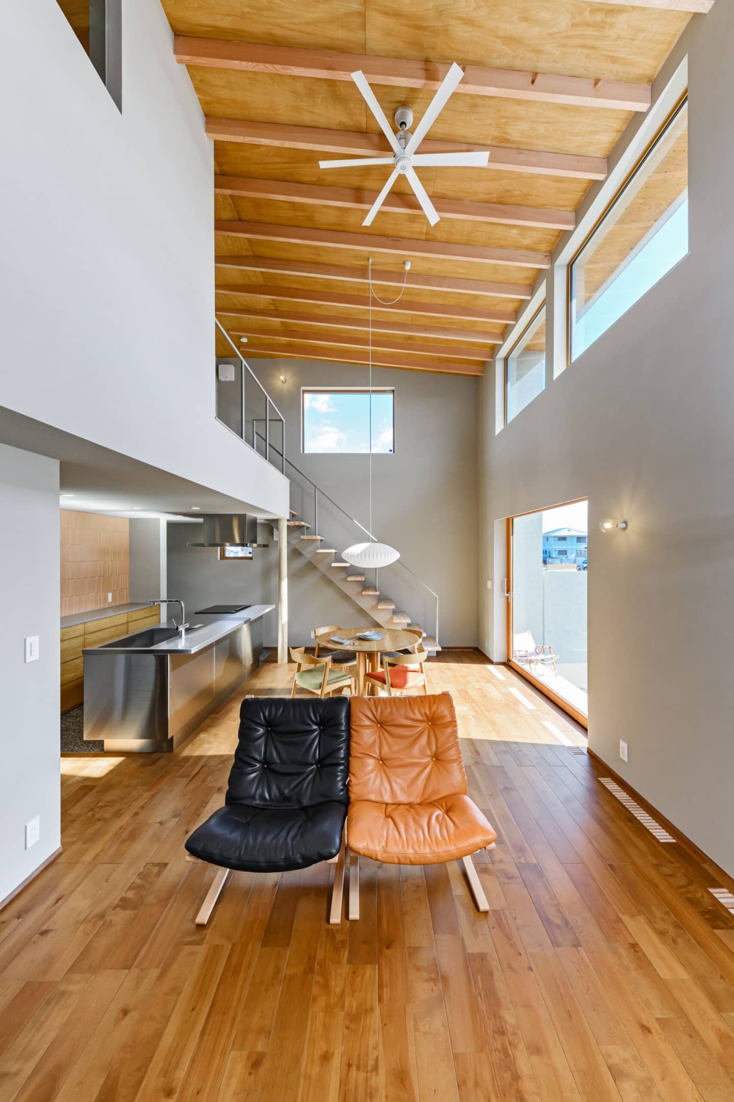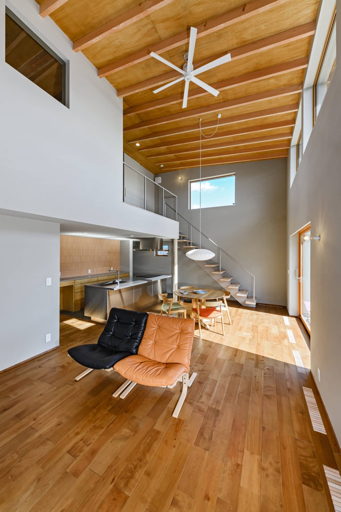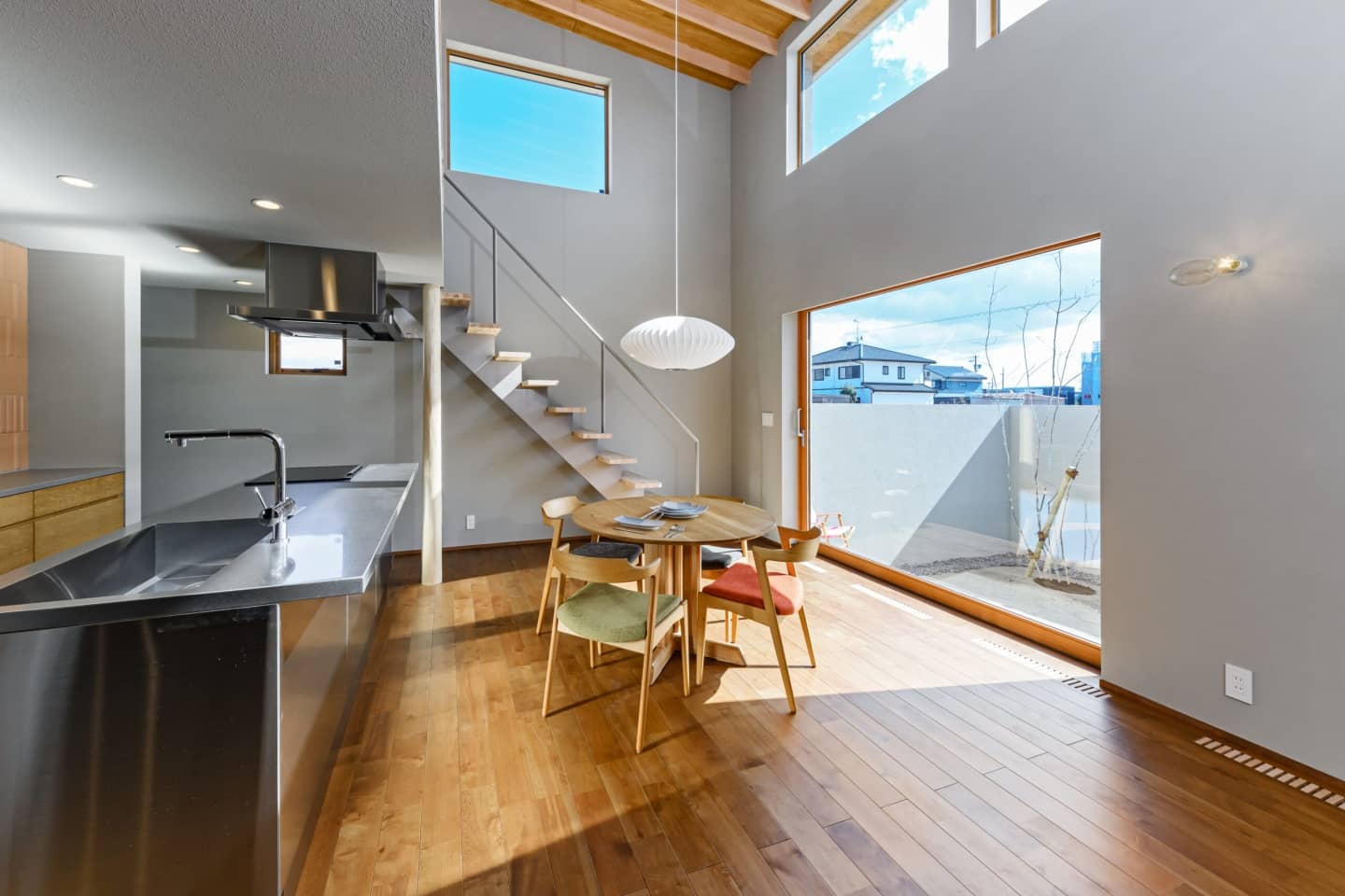 大きな吹抜けのリビングには1本引きの大きな木製サッシを使用し、開放感を演出しています。キッチンからは全体が見渡せて水廻りへの動線もスムーズに。庭もよく見えます。