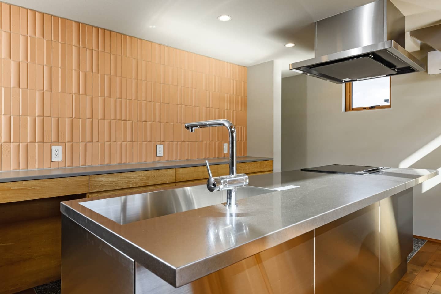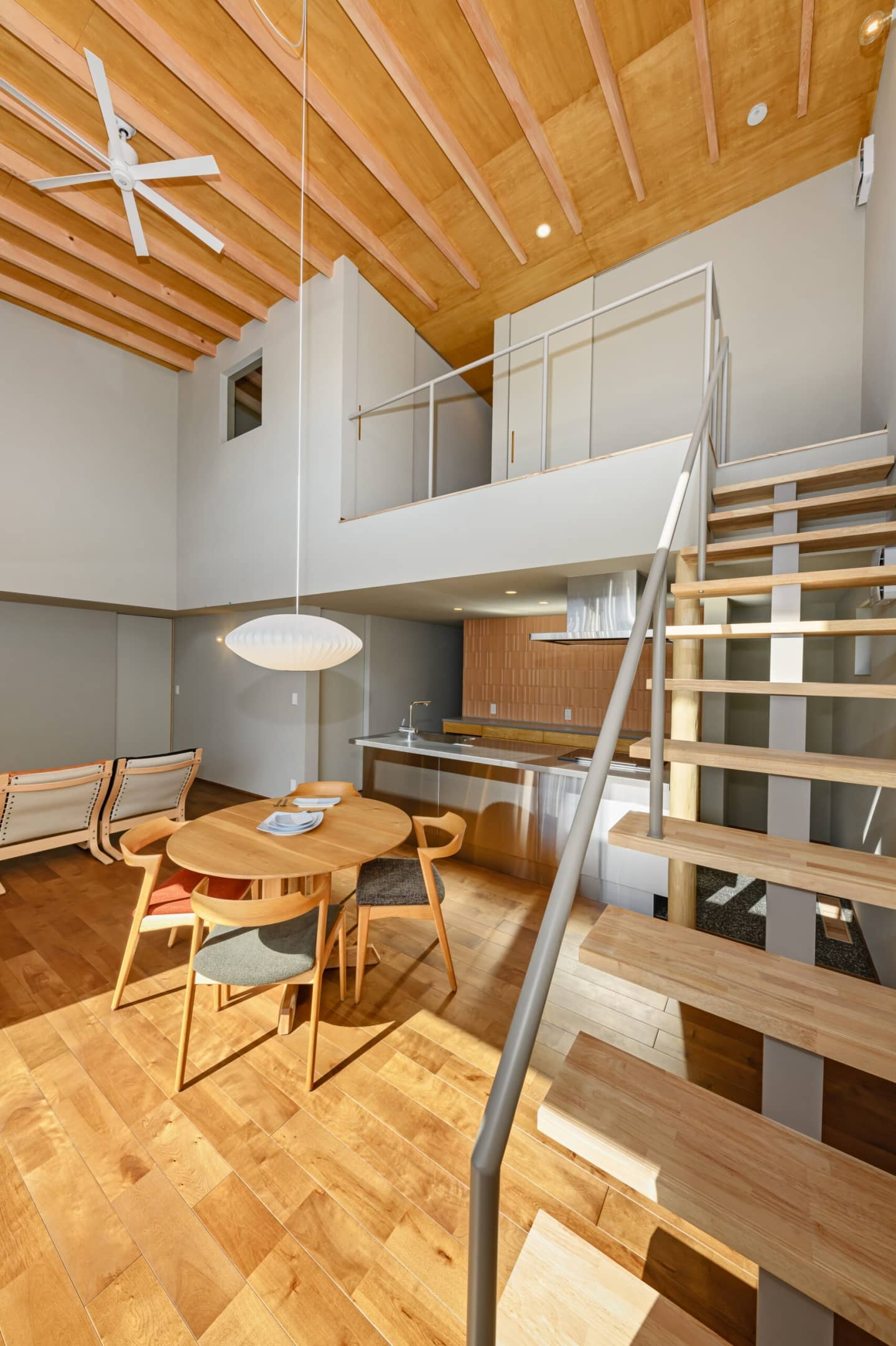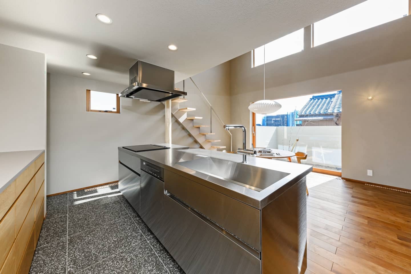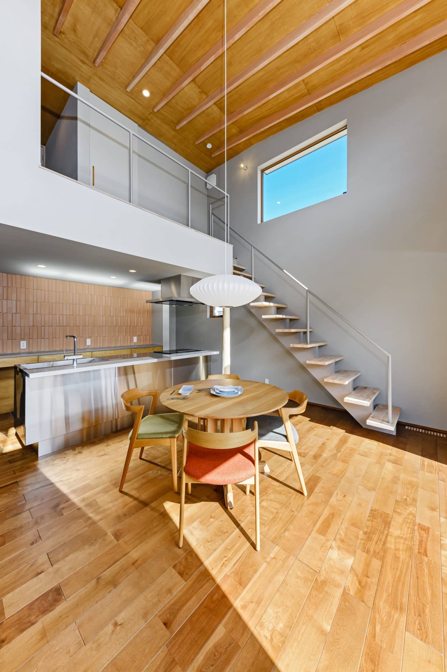 大きな吹抜けのリビングには1本引きの大きな木製サッシを使用し、開放感を演出しています。キッチンからは全体が見渡せて水廻りへの動線もスムーズに。庭もよく見えます。