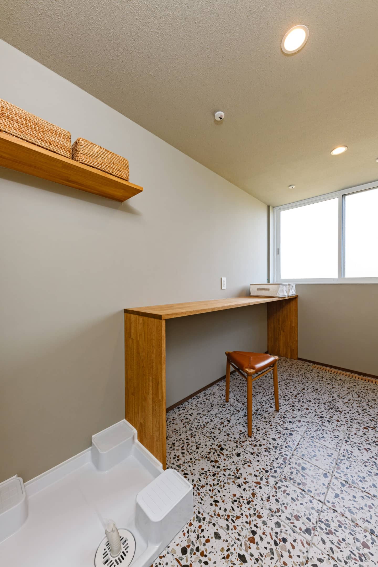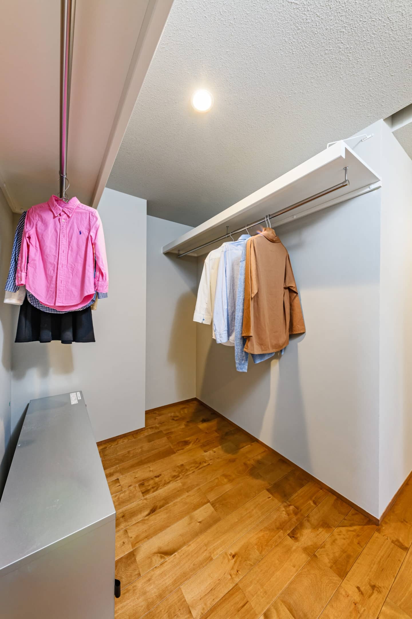 洗面脱衣室は部屋干し設備も完備し、サンルームとして使用することも出来ます。WICLともつながっているので洗濯物の片付けが楽になりました。