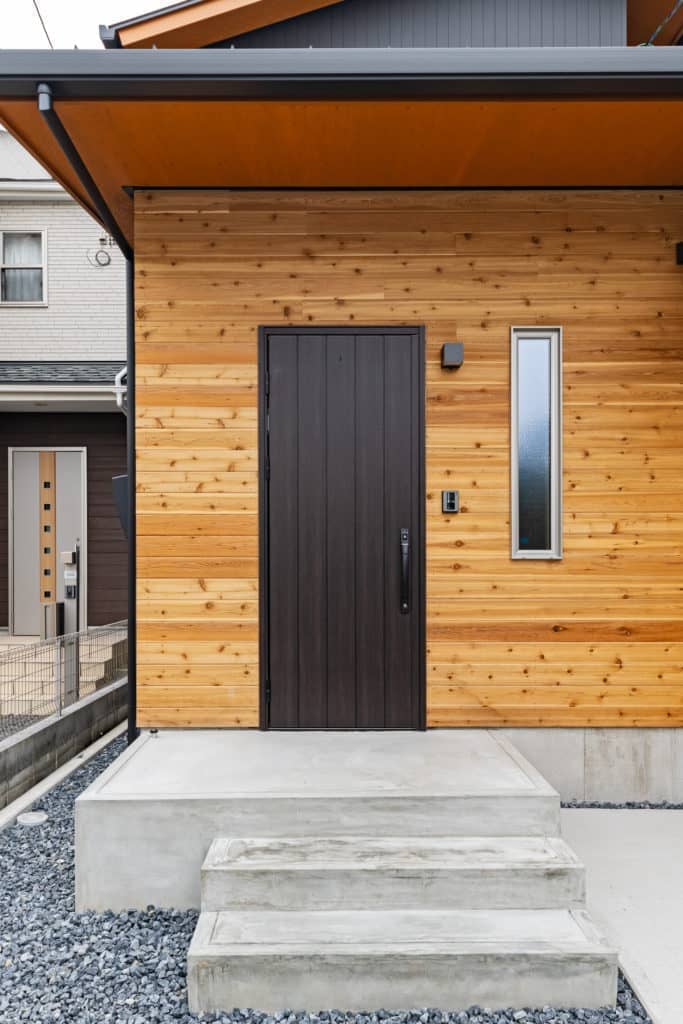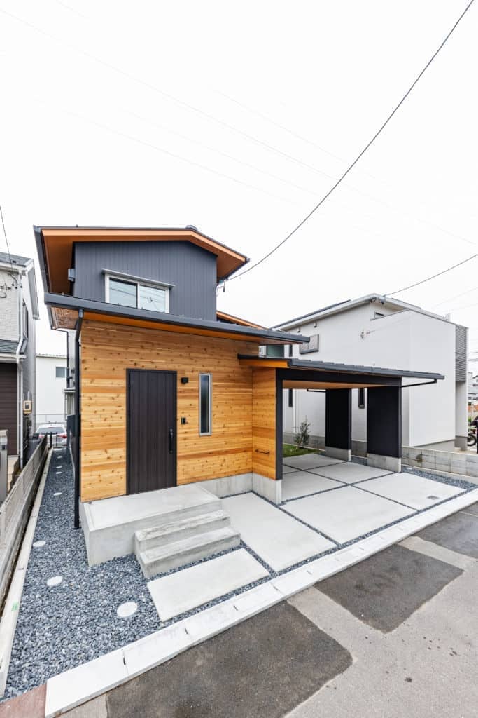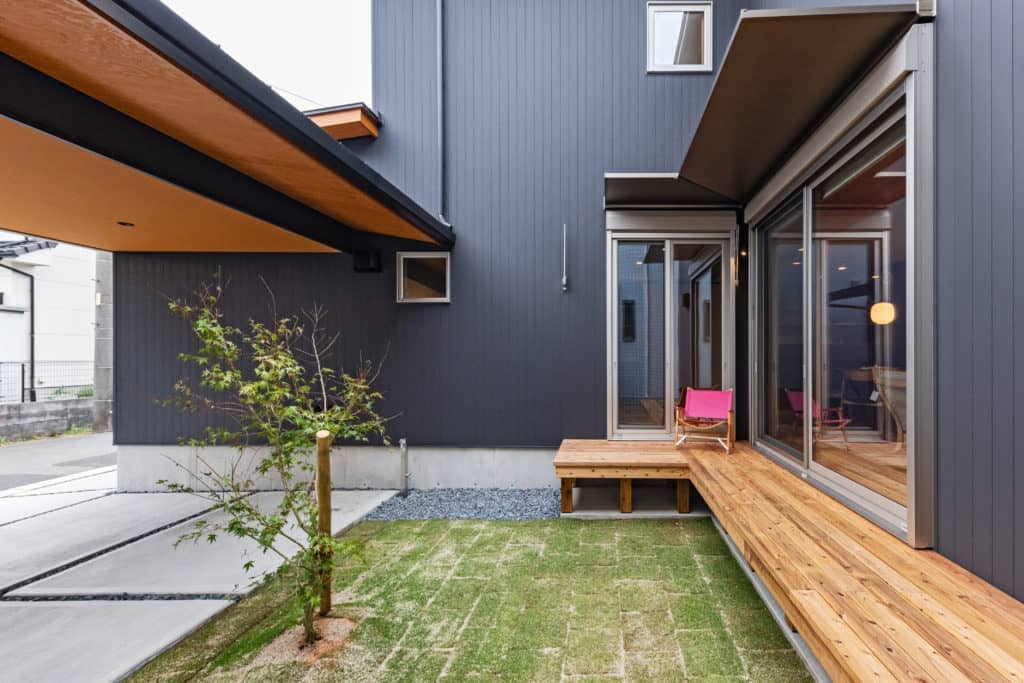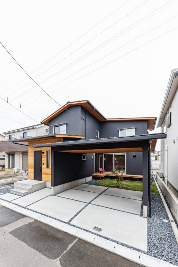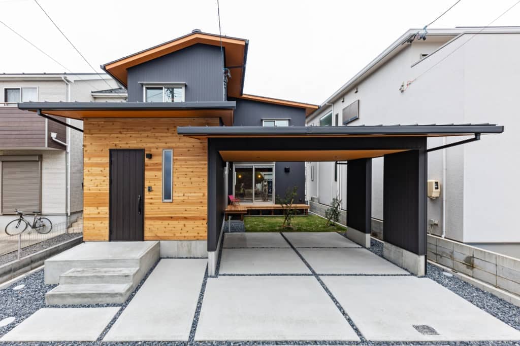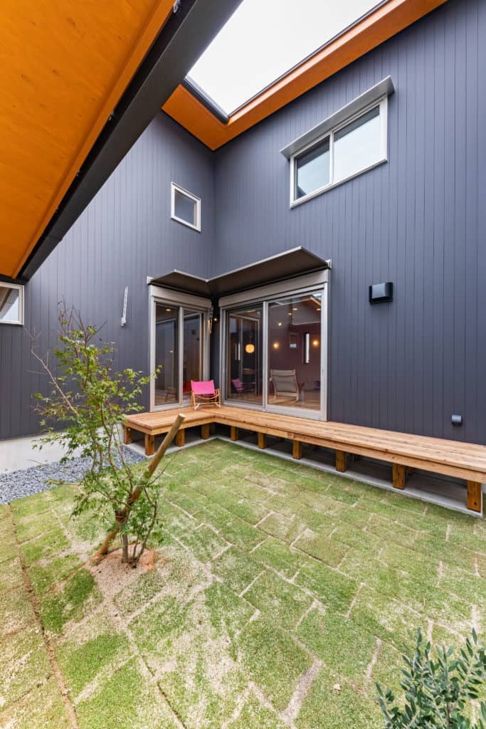 コンパクトですがしっかり中庭空間も確保しつつ、2台の屋根付きのビルトインガレージも。こちらはLDKの目隠しとしても機能しています。