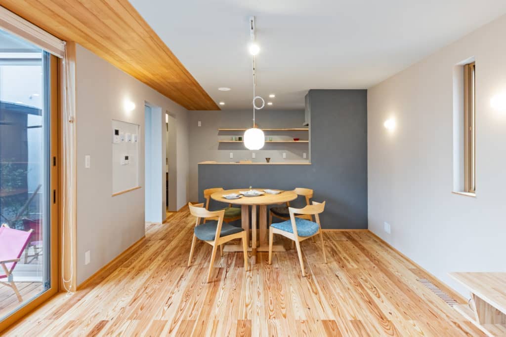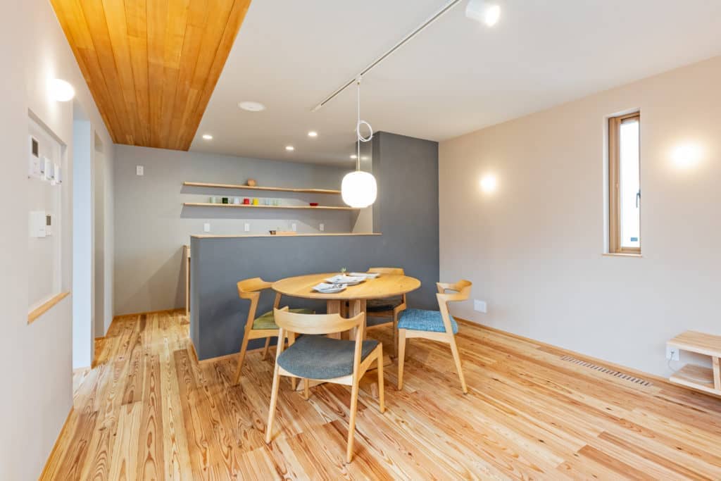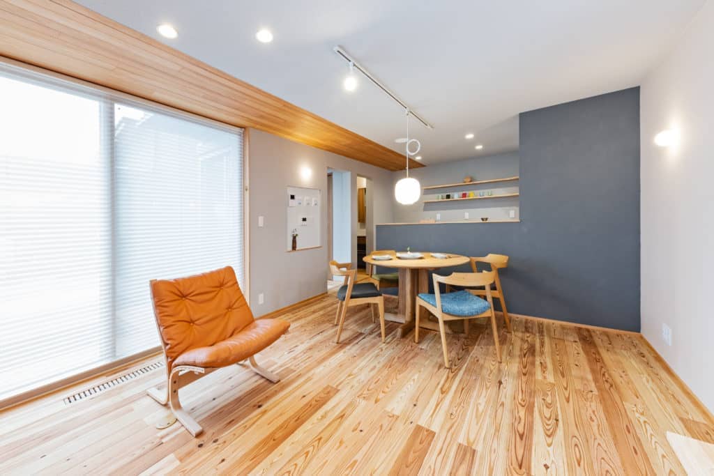 LDKはお住まいの一番奥に細長く配置する事により14.3帖という数字以上に広く見え、天井は低めに設置することで落ち着いて寛ぐことができる空間になりました。
