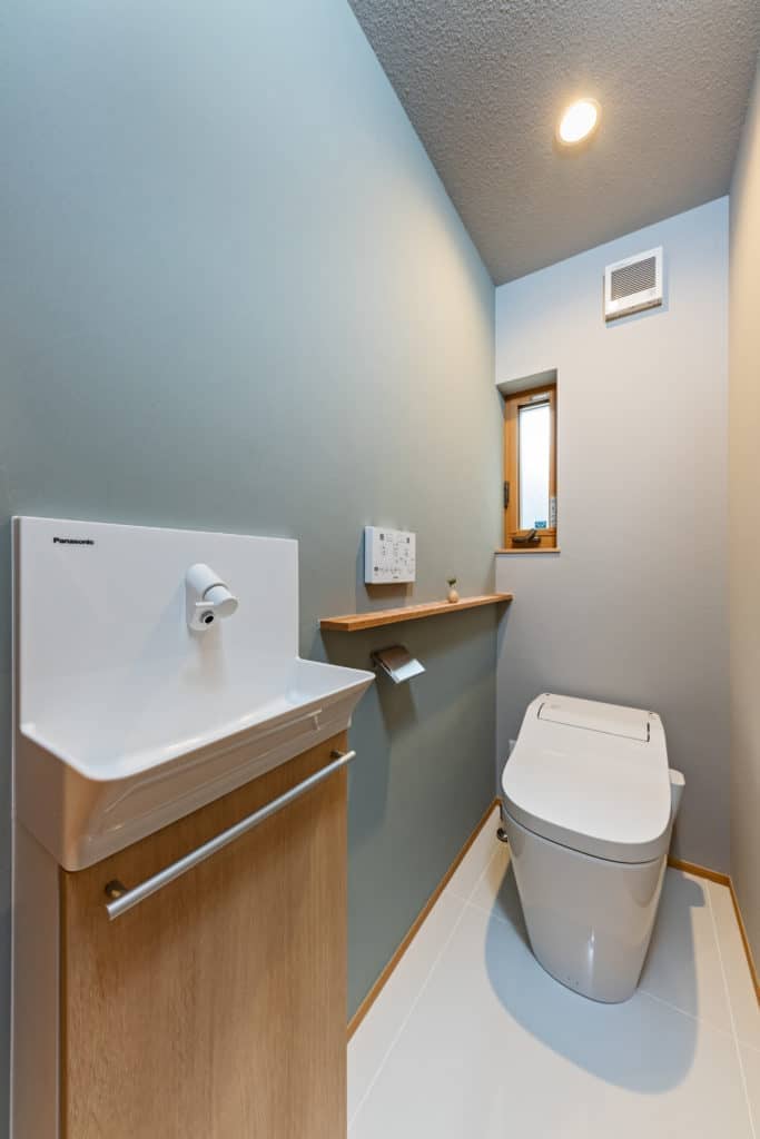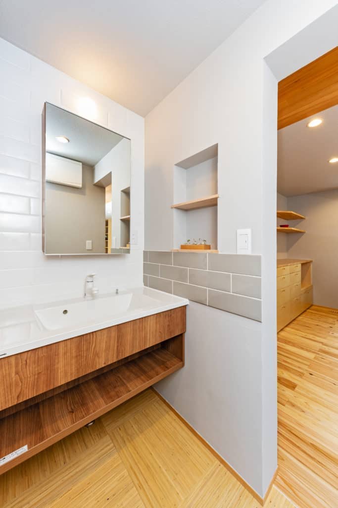 水廻りは一直線でつながり、家事動線は楽な配置に。将来の二世帯同居にも配慮し、脱衣と洗面は分けました。