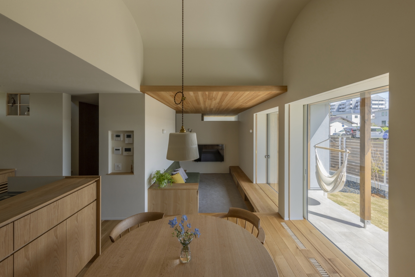 キッチンは2.2mの高さとしやや低めの設定です。ダイニングは勾配天井とし、頂点に近い部分は曲面の形状としています。リビングは30㎝床を下げ、下げた部分をウール100%のカーペット敷として造作ソファーを製作しました。天井も板張りとして変化を持たせました。