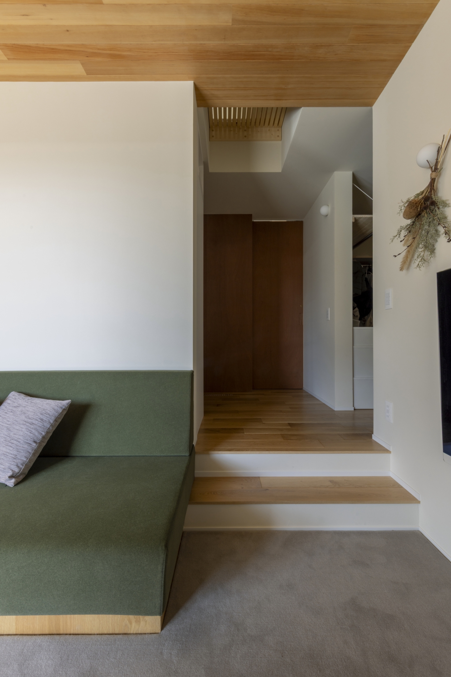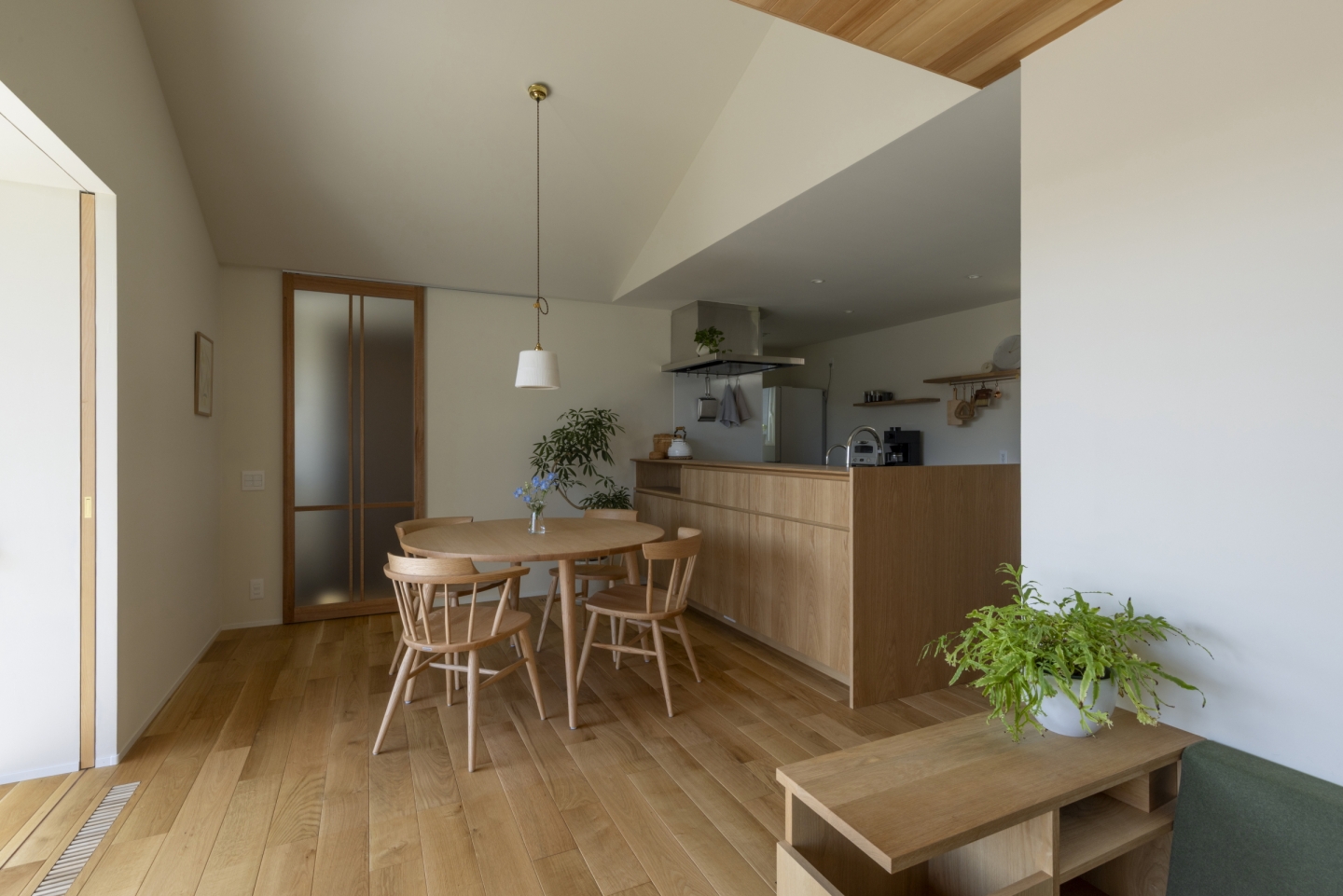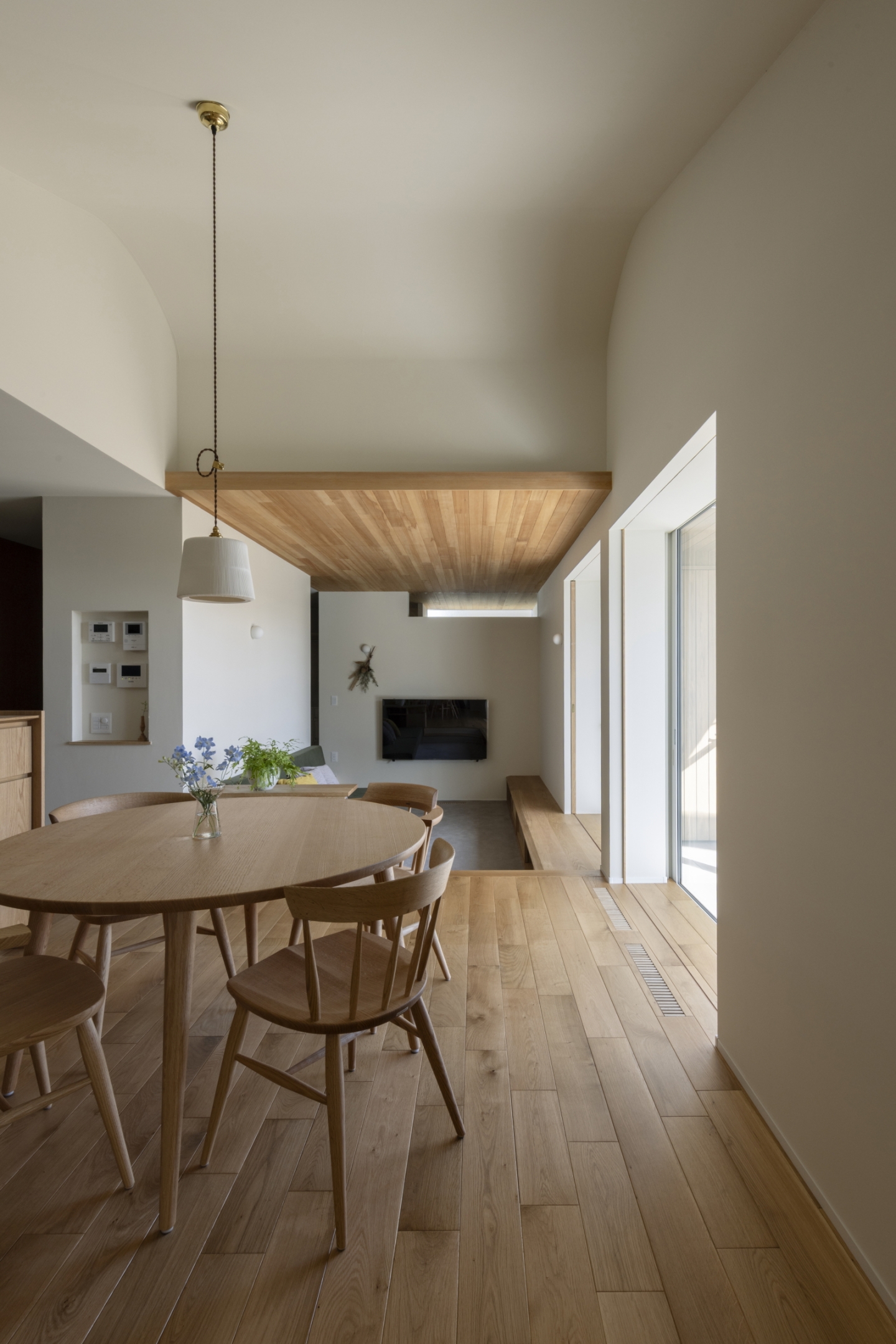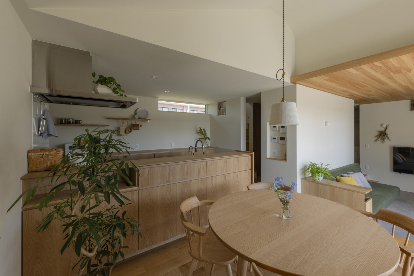 キッチンは2.2mの高さとしやや低めの設定です。ダイニングは勾配天井とし、頂点に近い部分は曲面の形状としています。リビングは30㎝床を下げ、下げた部分をウール100%のカーペット敷として造作ソファーを製作しました。天井も板張りとして変化を持たせました。
