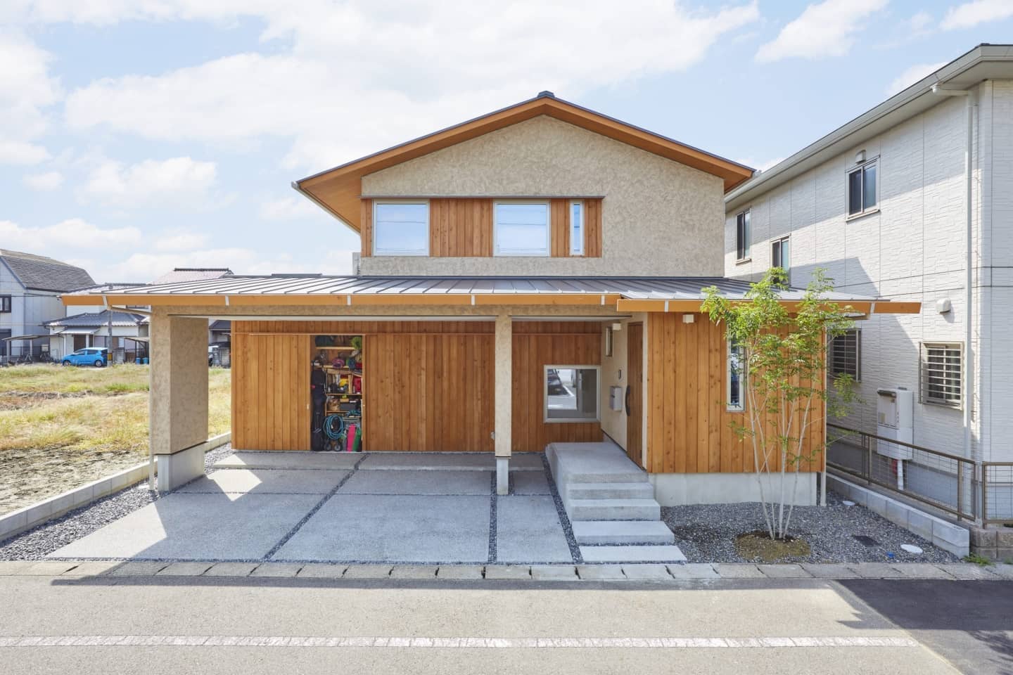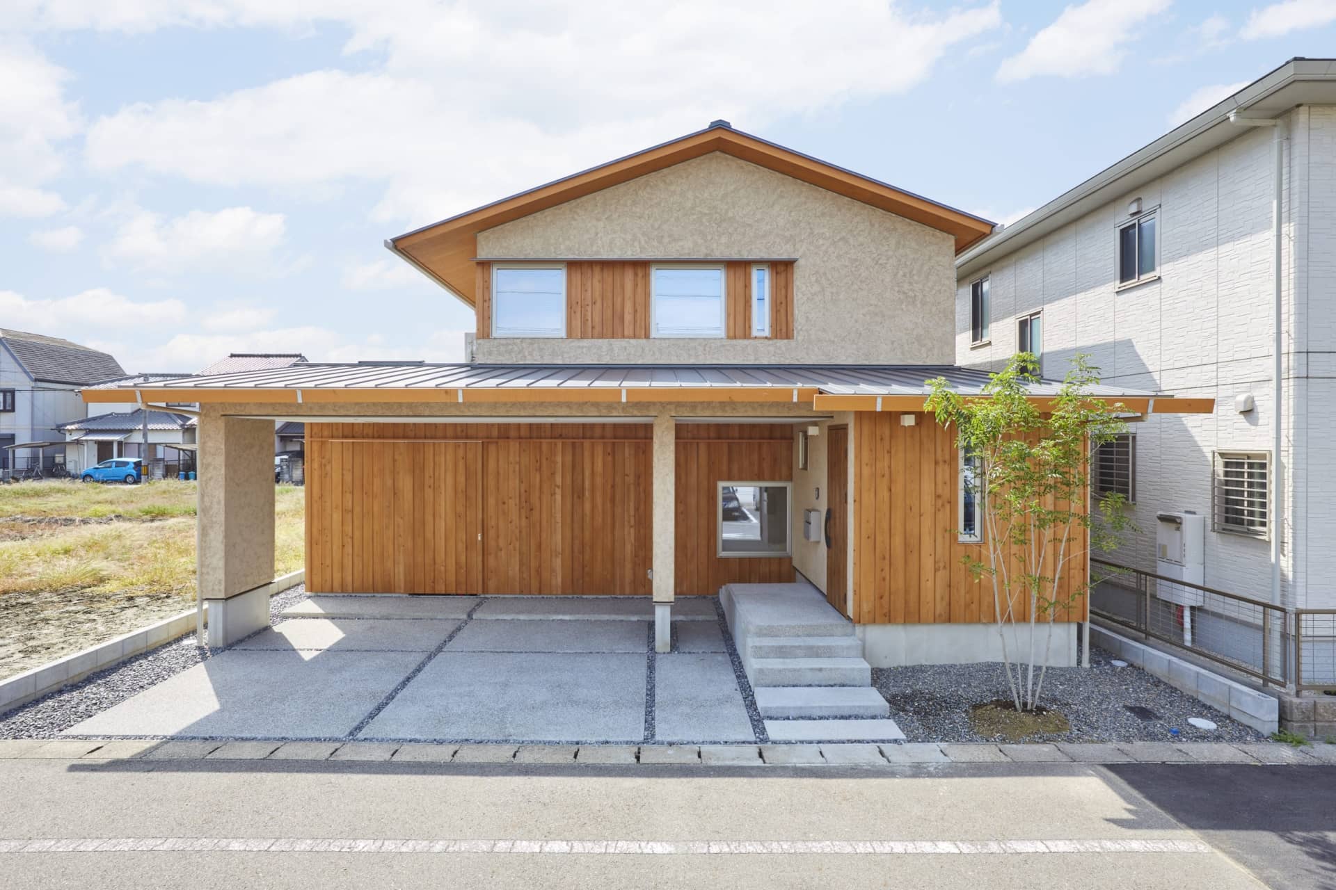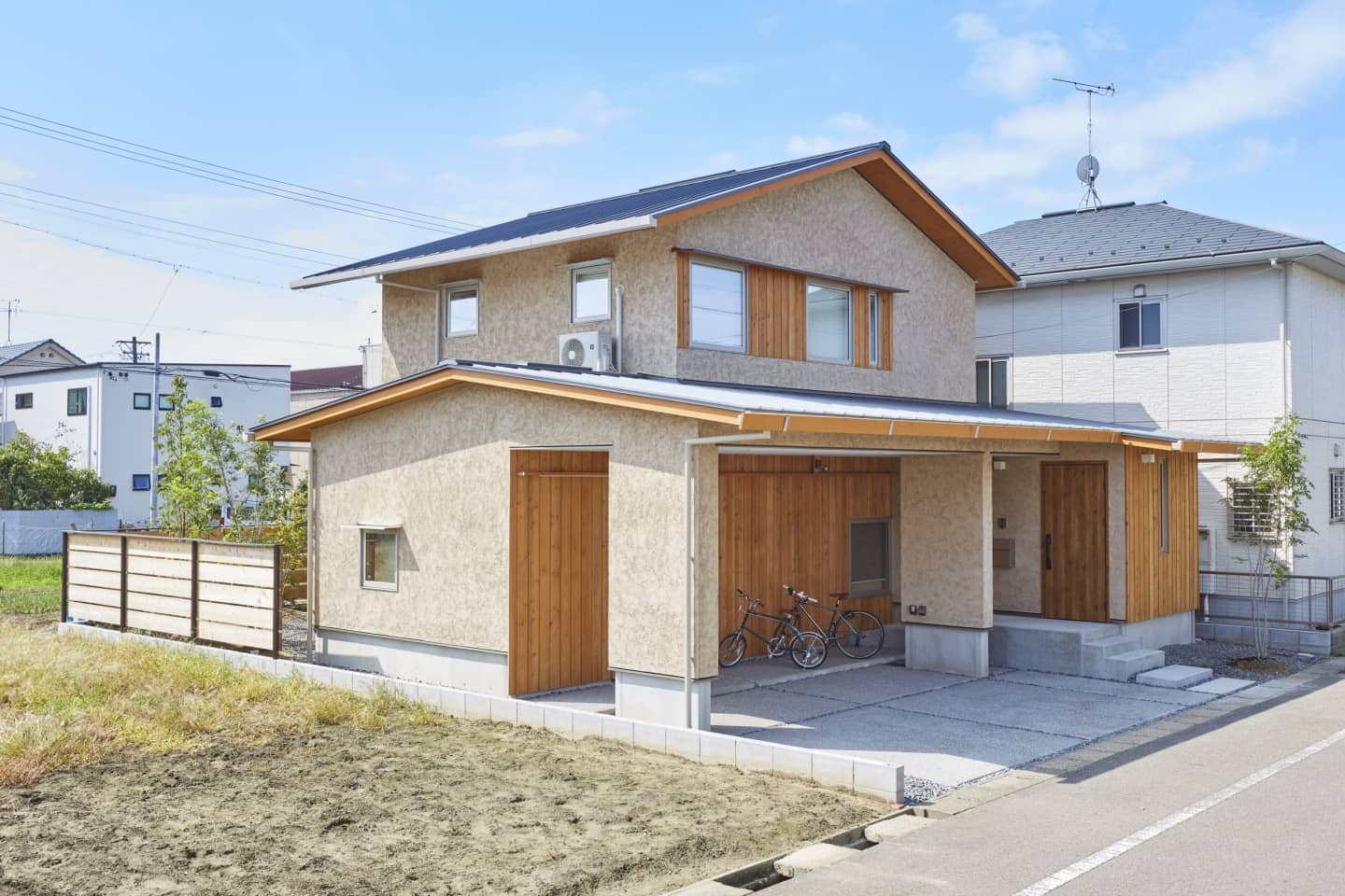 外壁はエムズ初採用の「そとん壁 スチロゴテ仕上げ」。木材と相性バッチリです。