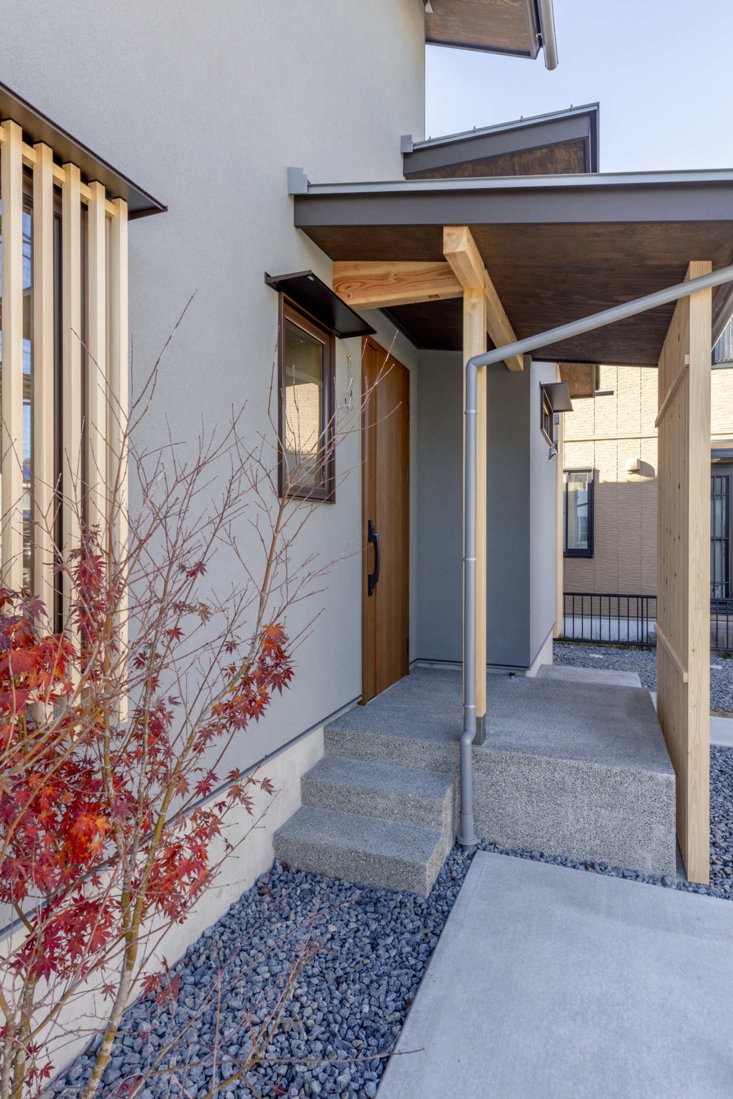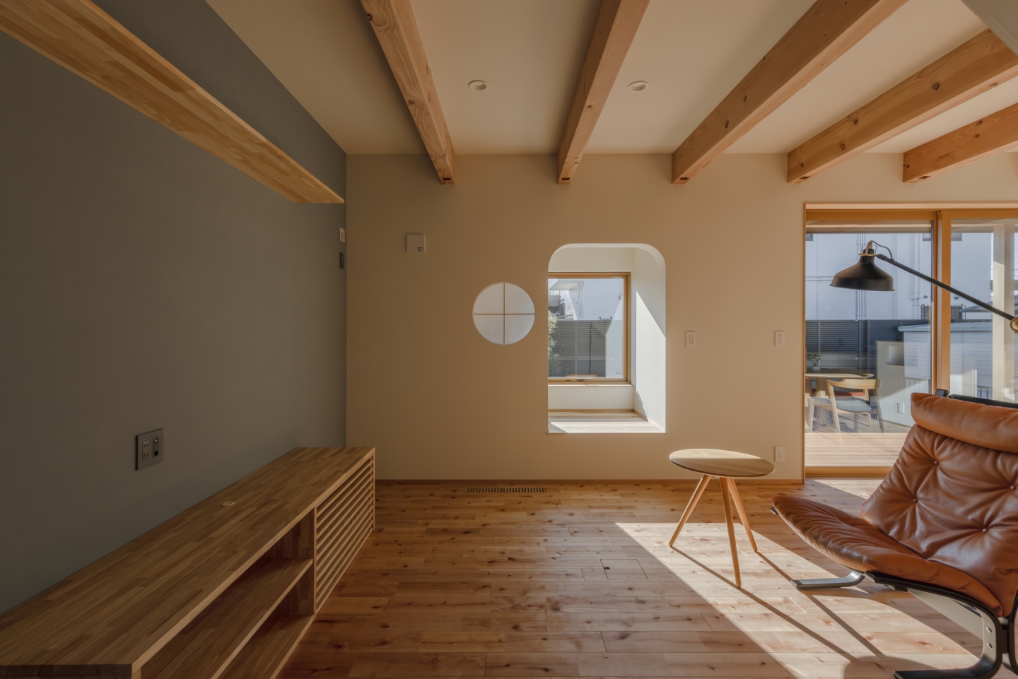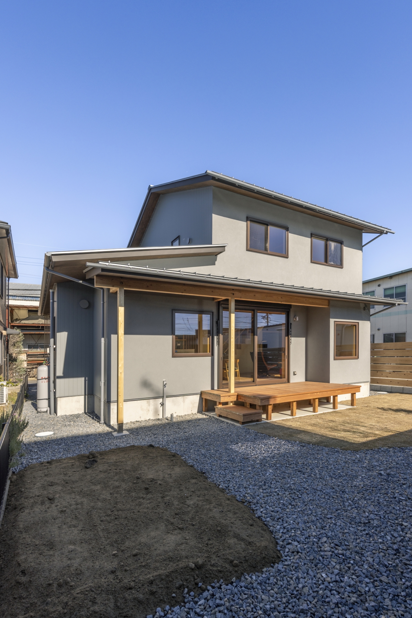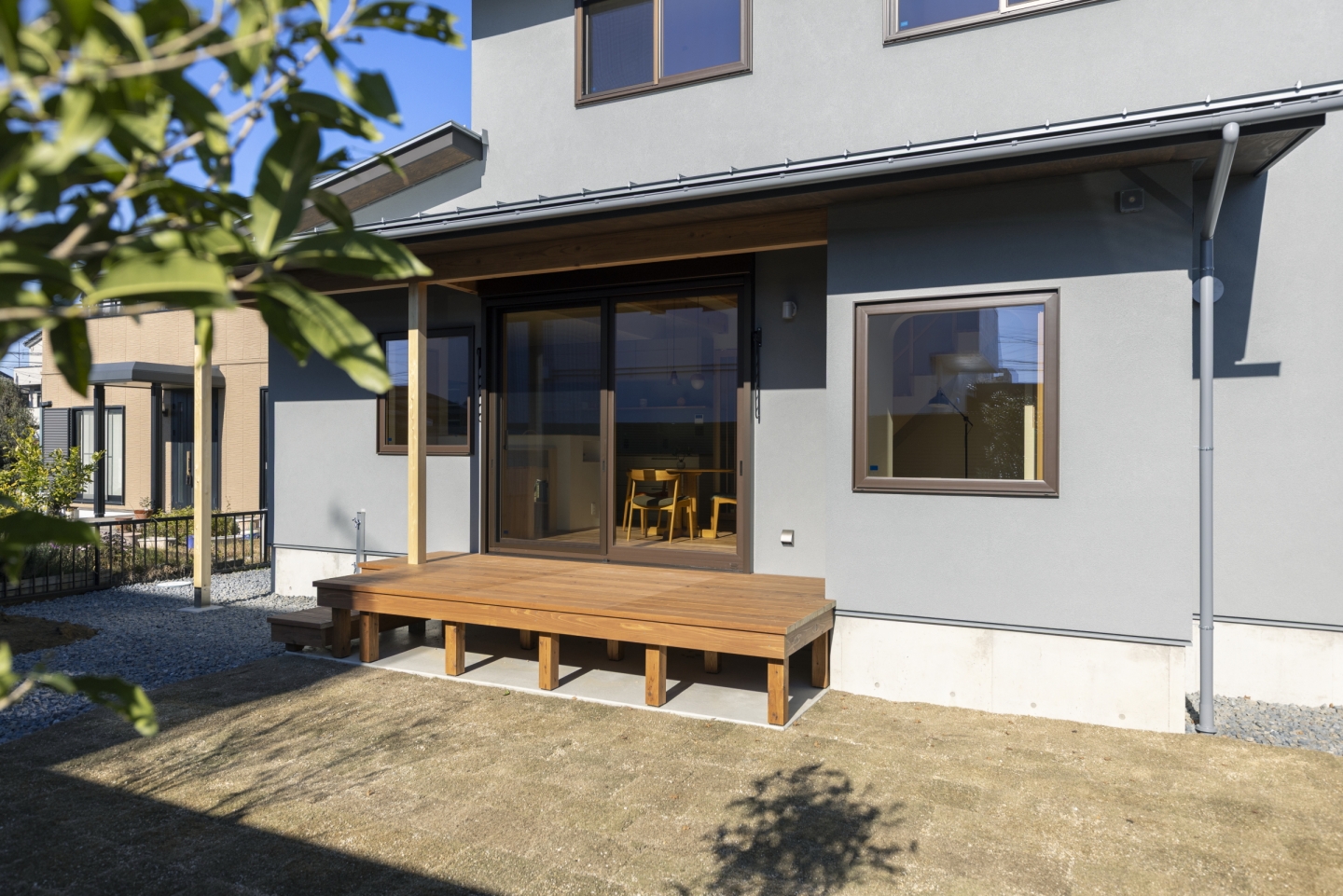 南側にはウッドデッキを設け、軒を深く出したパッシブデザインに。冬は日差しを取り込み、日向ぼっこしながらゆったりと過ごせる、室内外が緩やかにつながる心地よい外部空間となります。