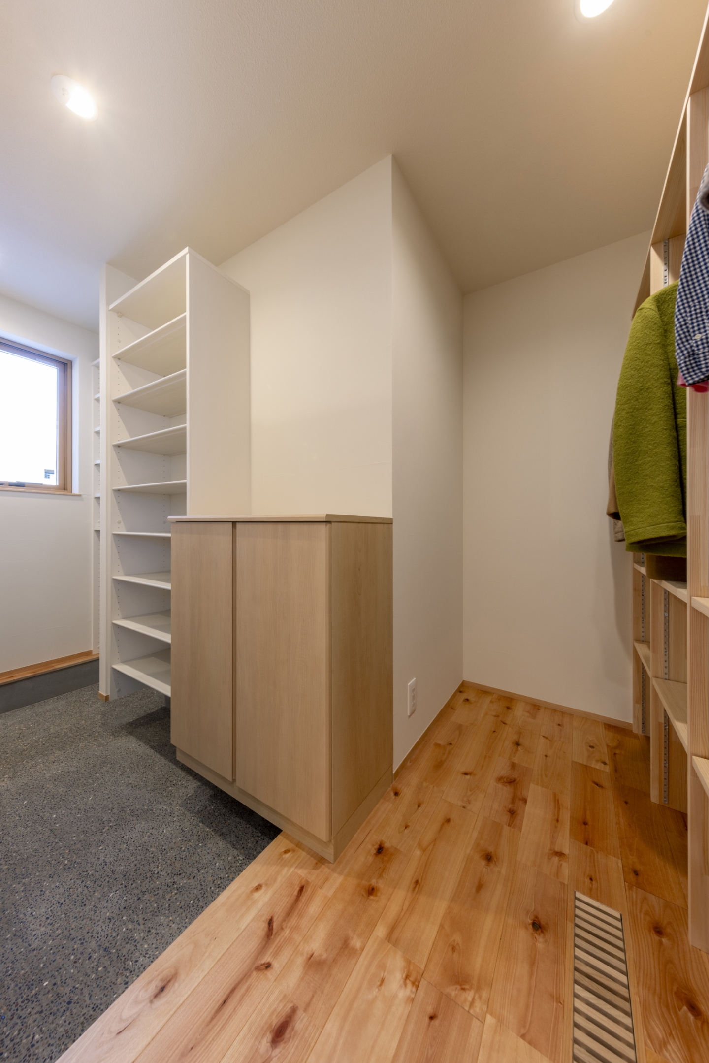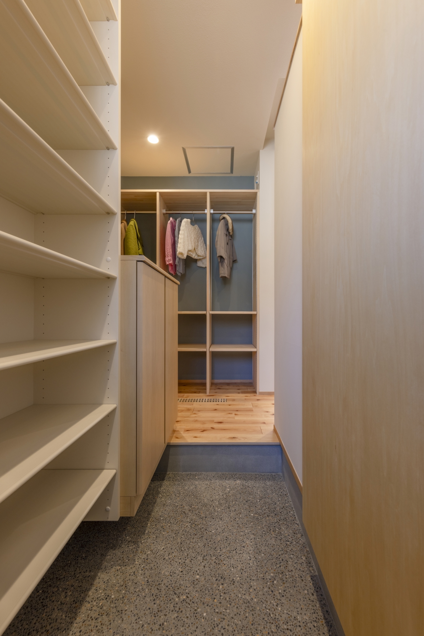 2way動線の玄関には、ファミリーロッカーを設置。帰宅後すぐに上着やバッグをしまえてスッキリ片付くので、来客時も友人を気持ちよく迎え入れることができる玄関になりました。