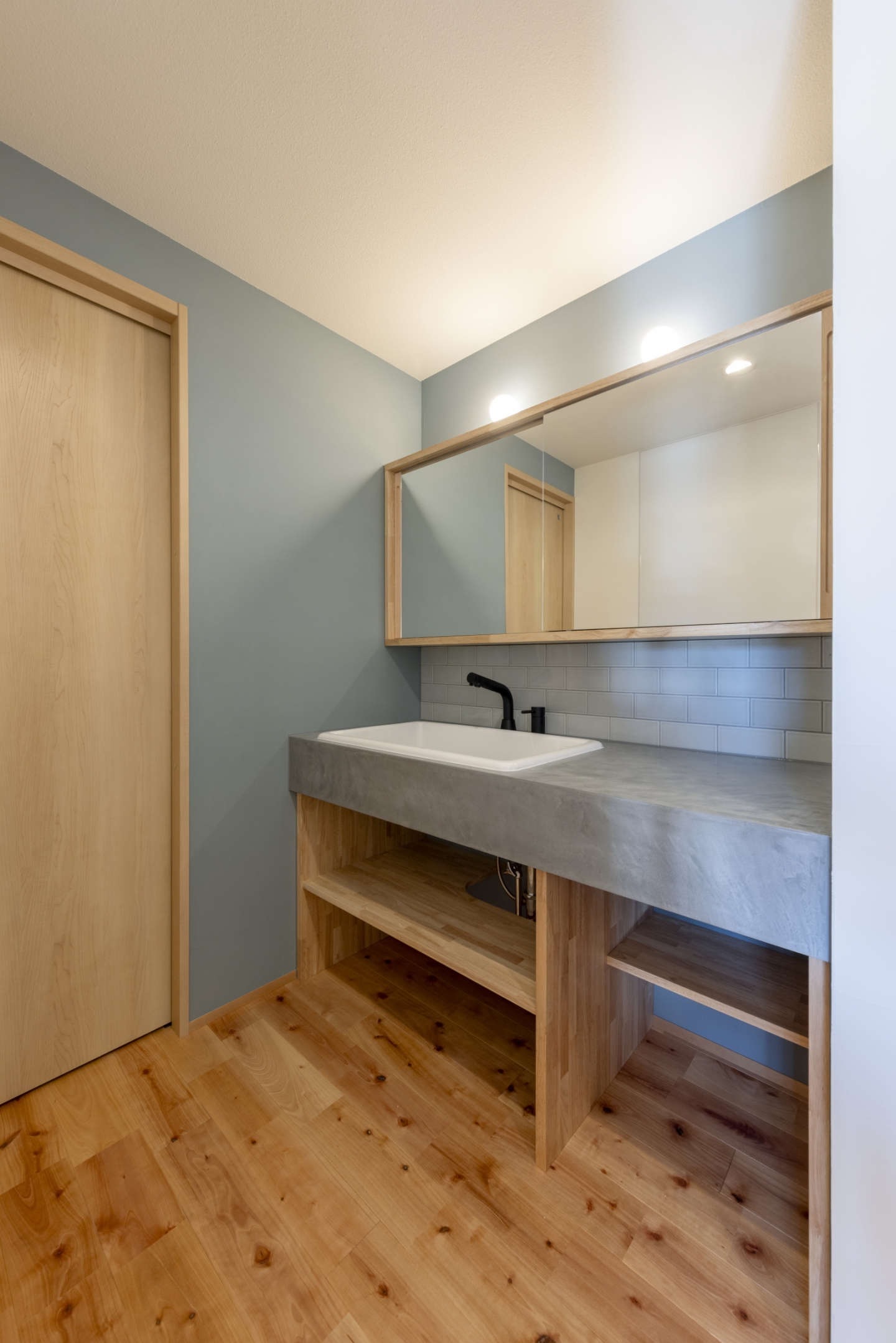 モールテックス仕上げの、こだわりの造作洗面も設置しました。