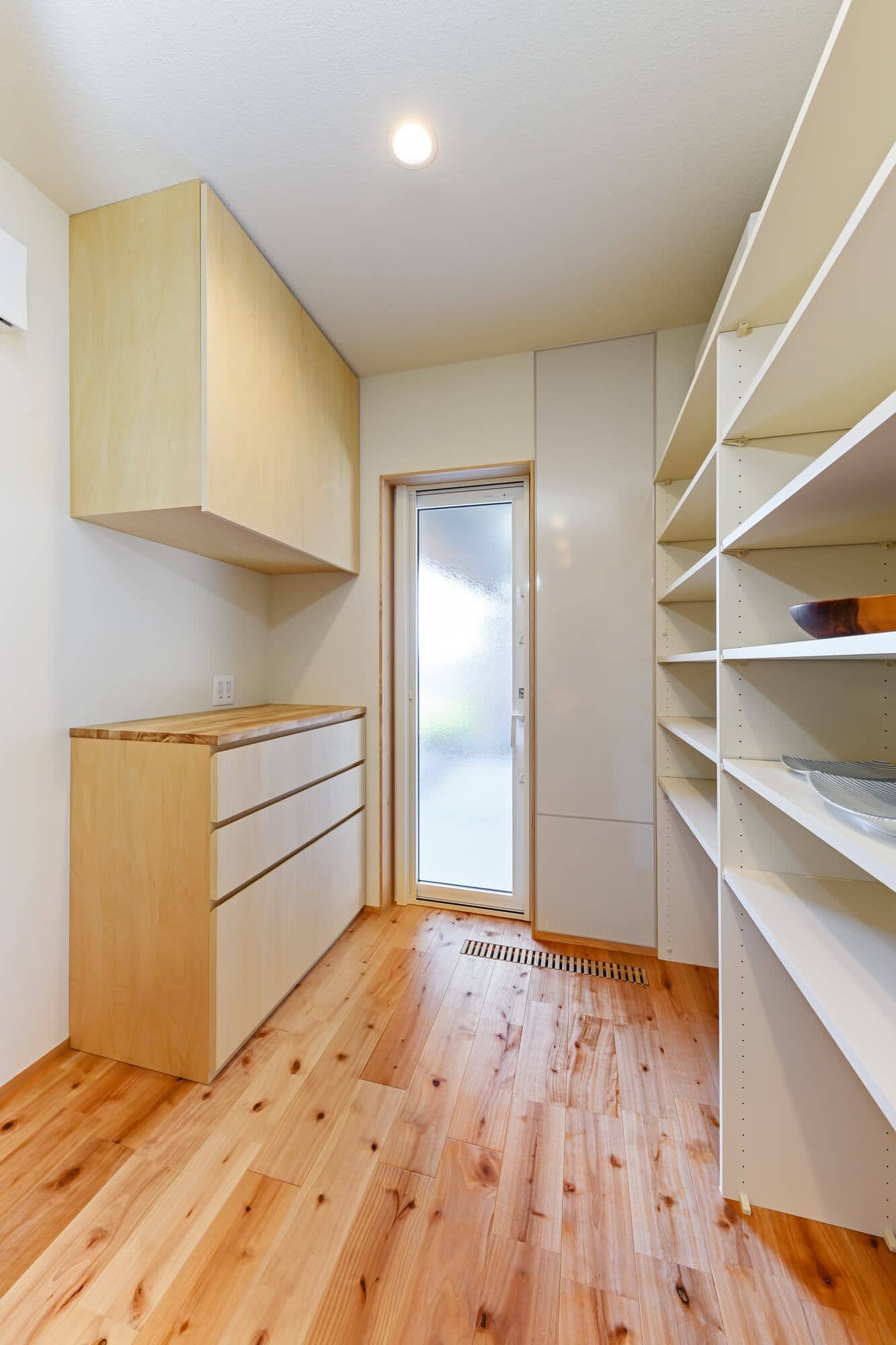 キッチン横にはパントリーもあり、家電類はこちらに入れ込んでスッキリとさせる工夫をしました。