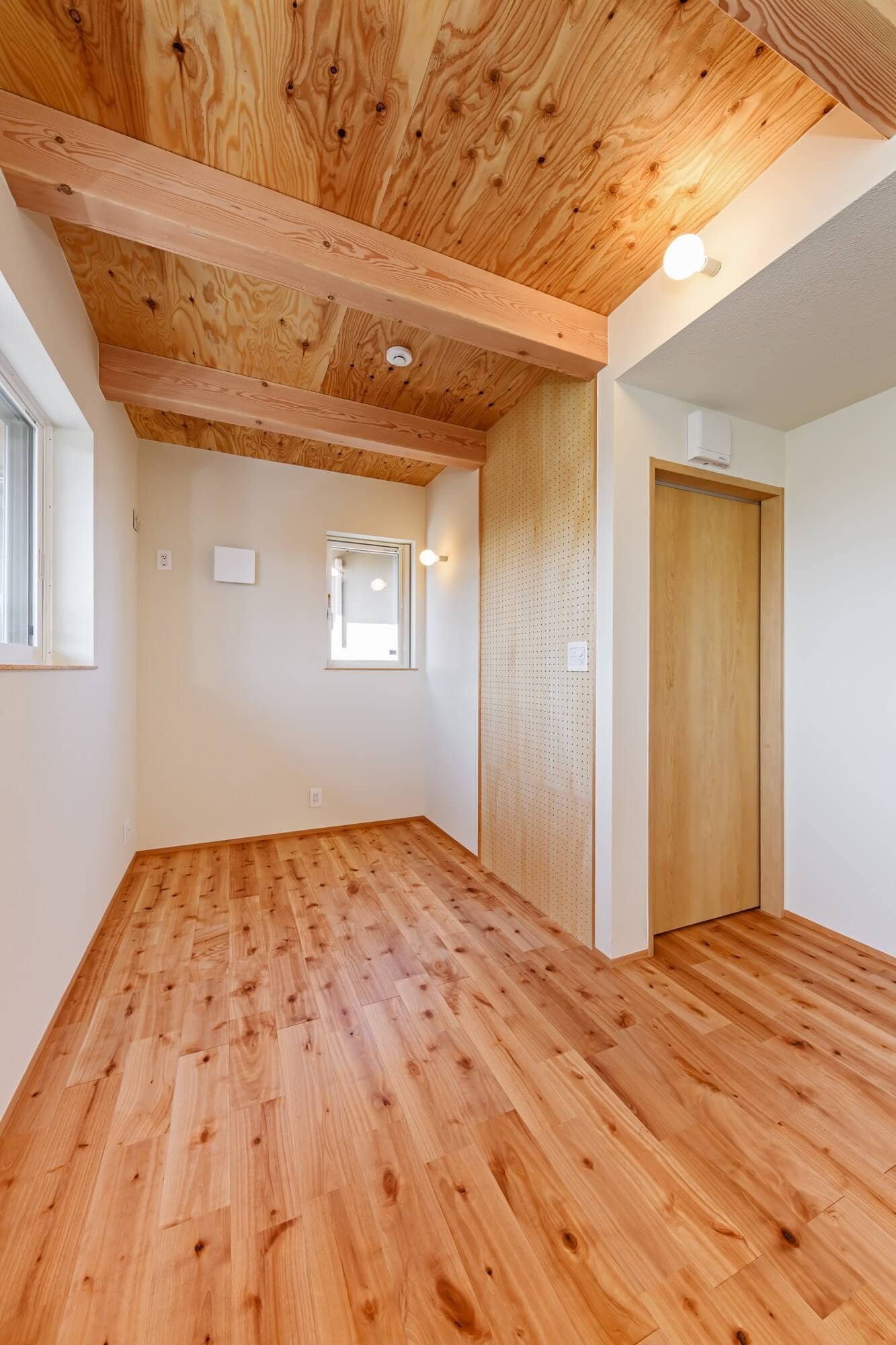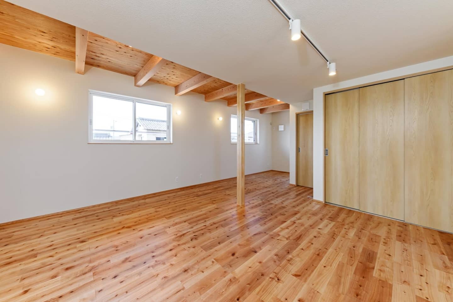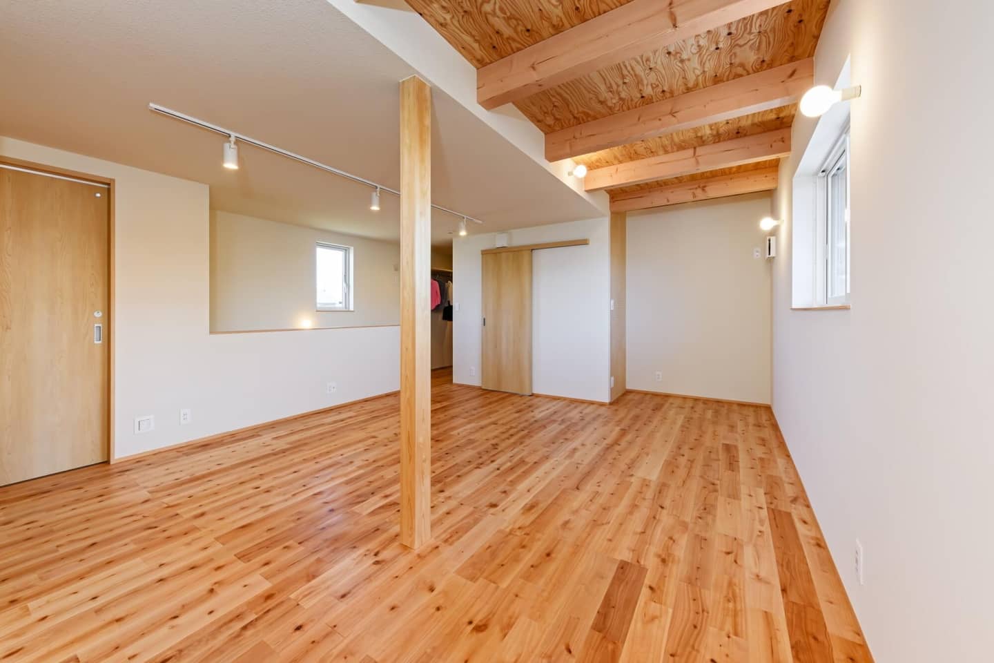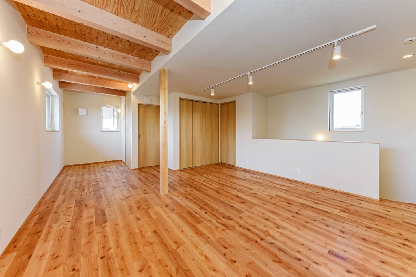 2Fは大きなフリースペースを設けて、将来の変化にフレキシブルに対応できる事と、家の中でも広々と遊べる空間を実現しました。
