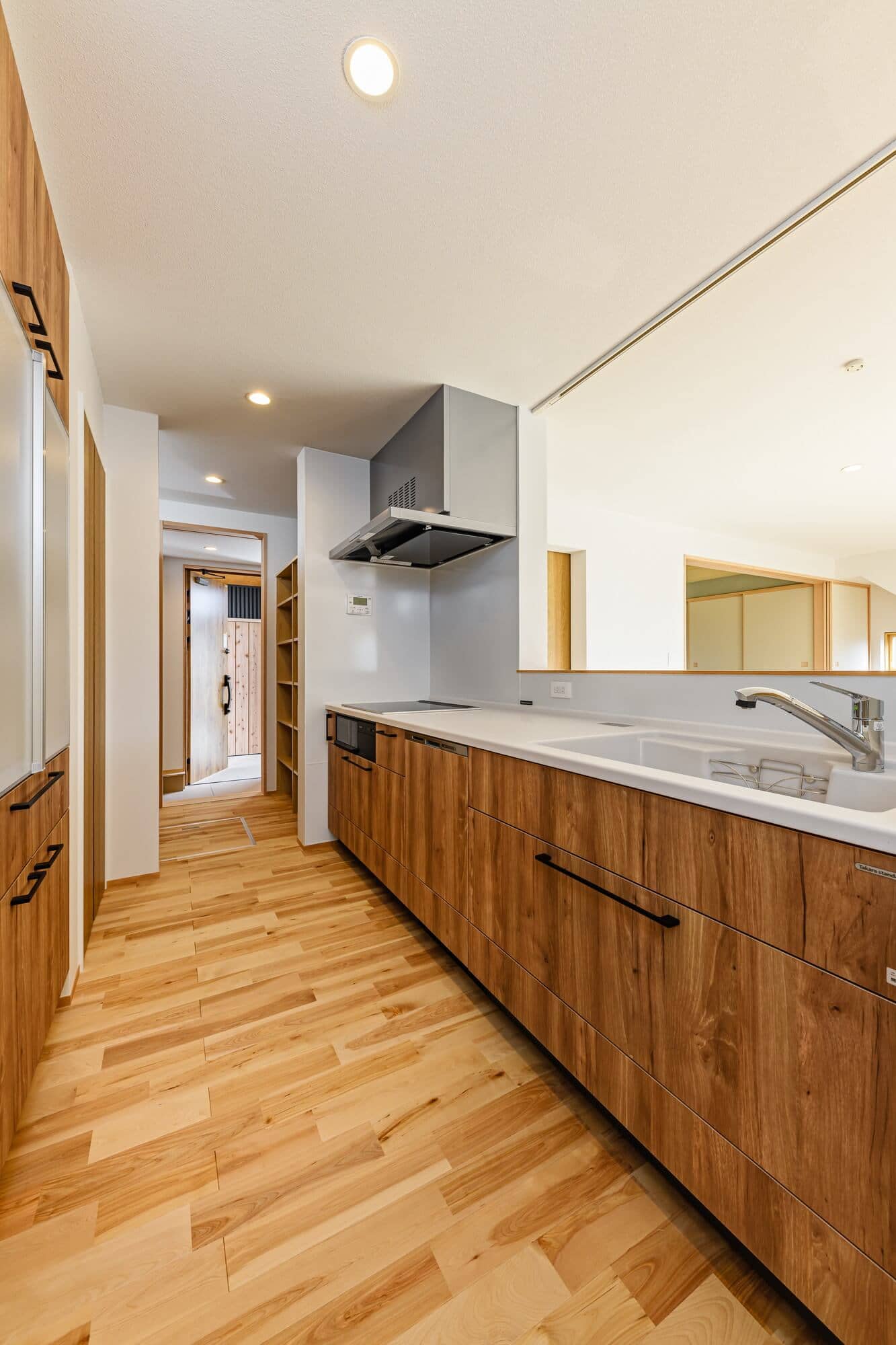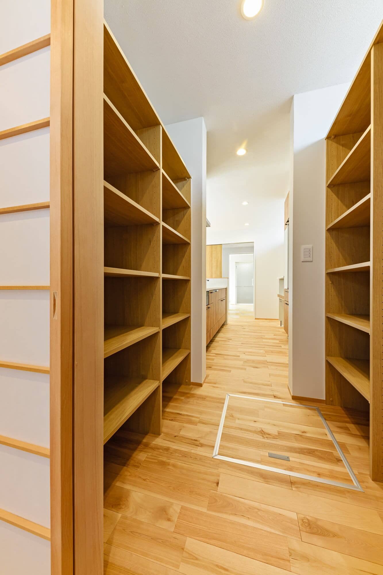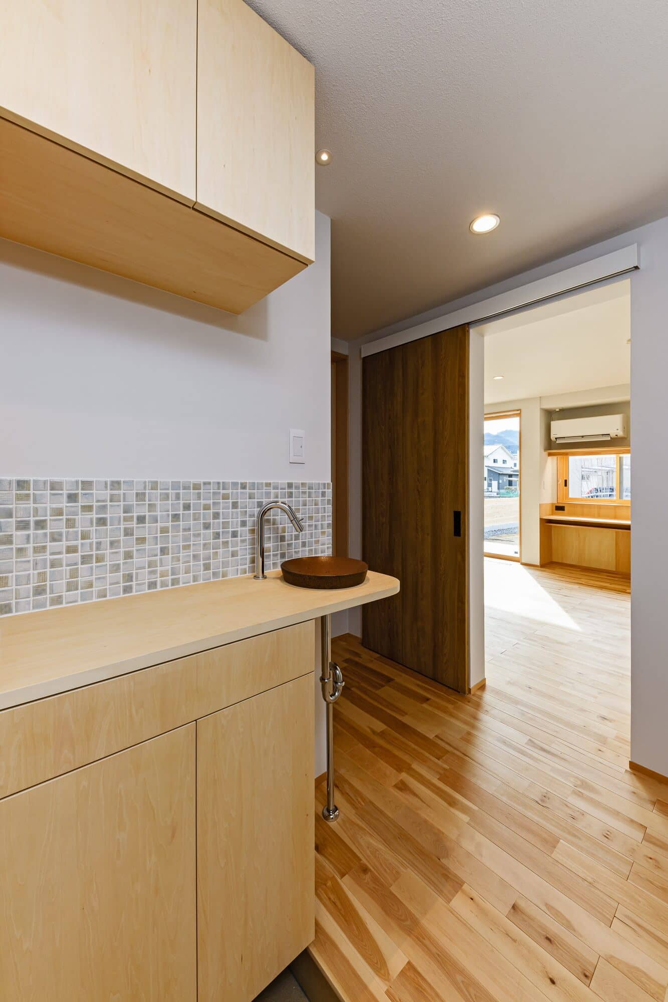 玄関から直通のパントリー→キッチン→洗面脱衣の家事動線や、人気のスロップシンク、造作下足入れに組み込んだ手洗い等、お施主様のこだわりが詰まったお住まいです。