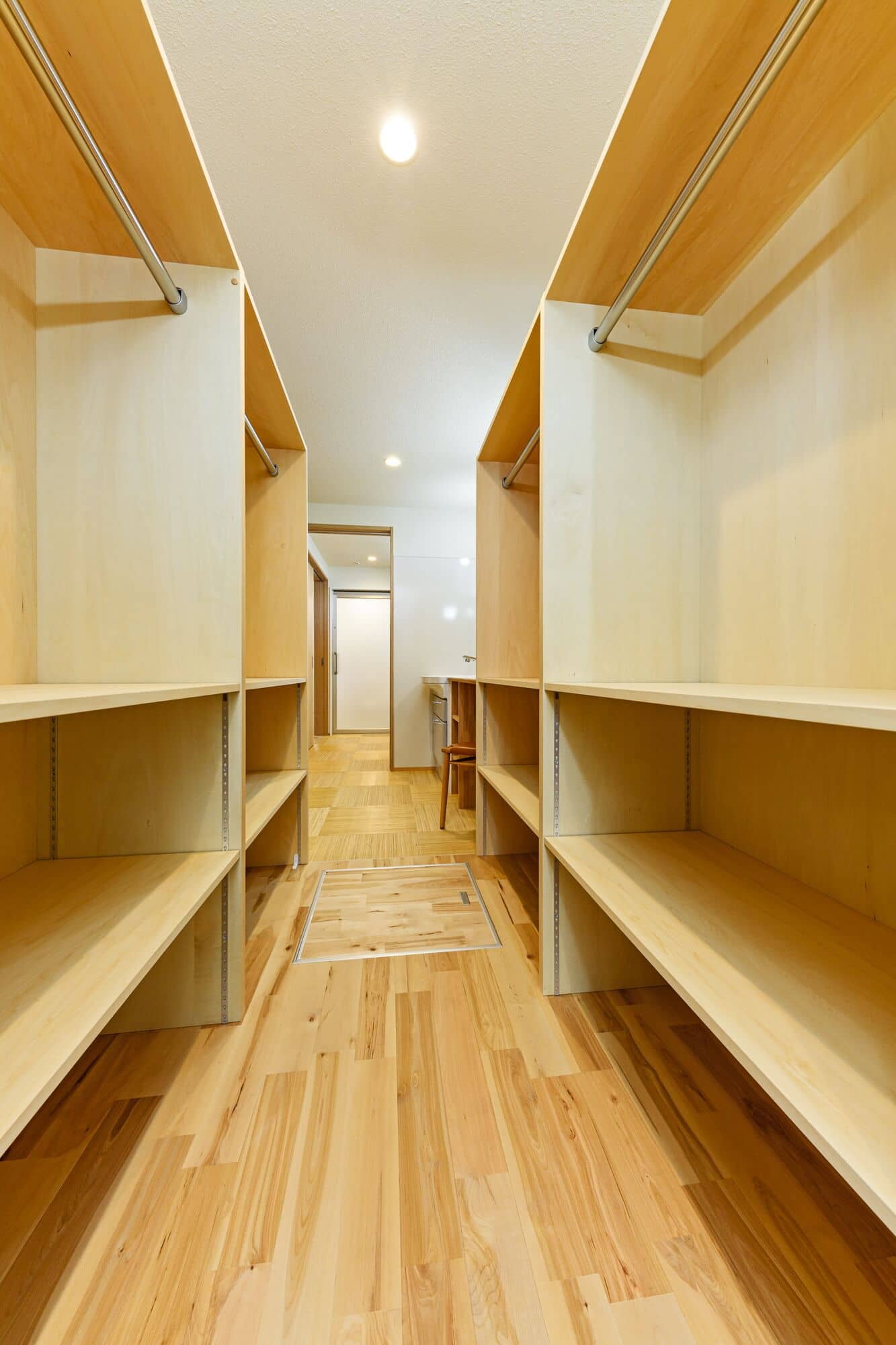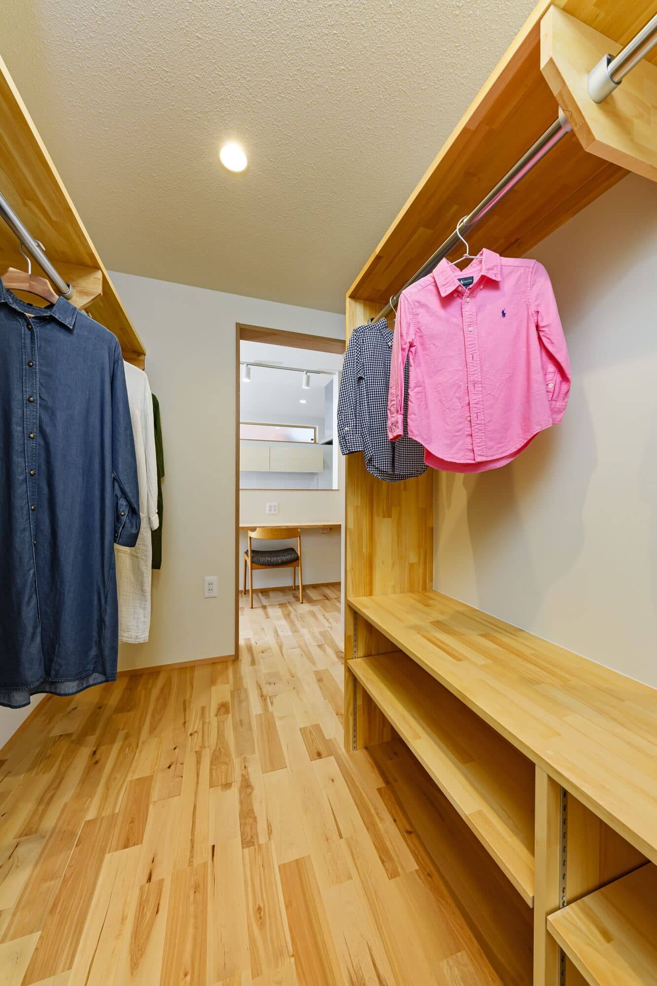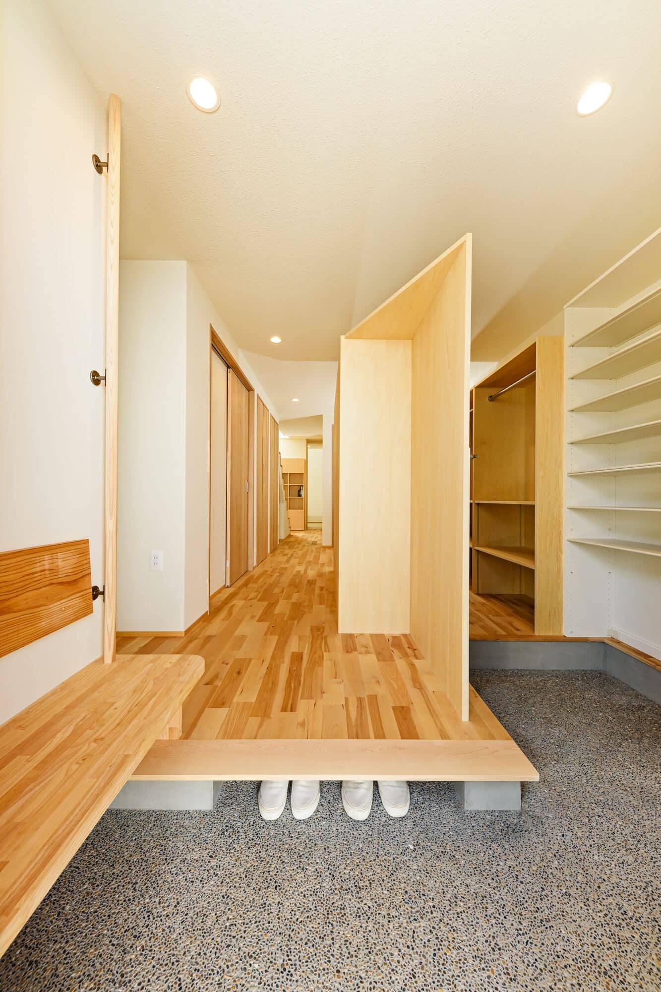 玄関からつながるファミリークローゼットは、スッキリ見せるためにパネルのみで簡易的に区切りました。