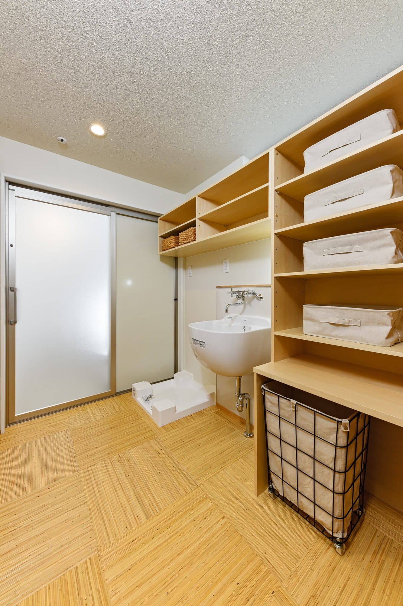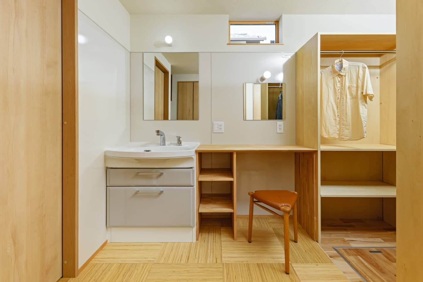 誰でも使いやすいようにオープンにした洗面台や、充実した収納、脱衣室からのキッチンへの動線は、お施主様のこだわりがつまっています。