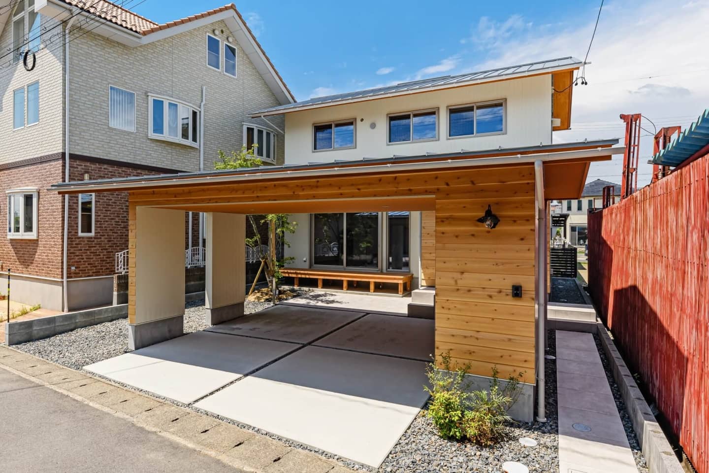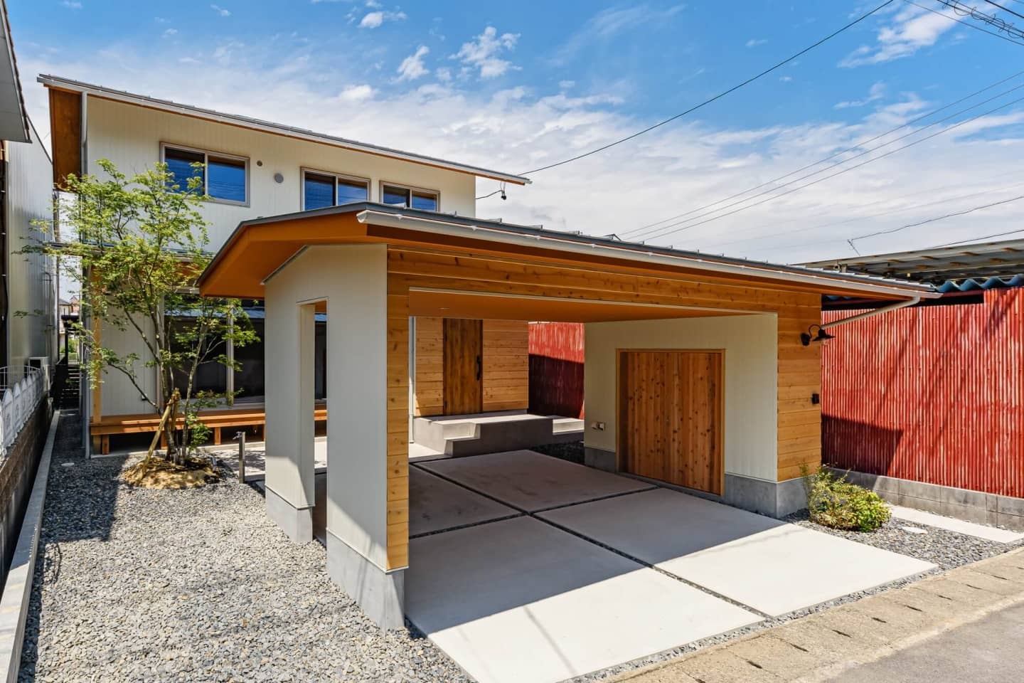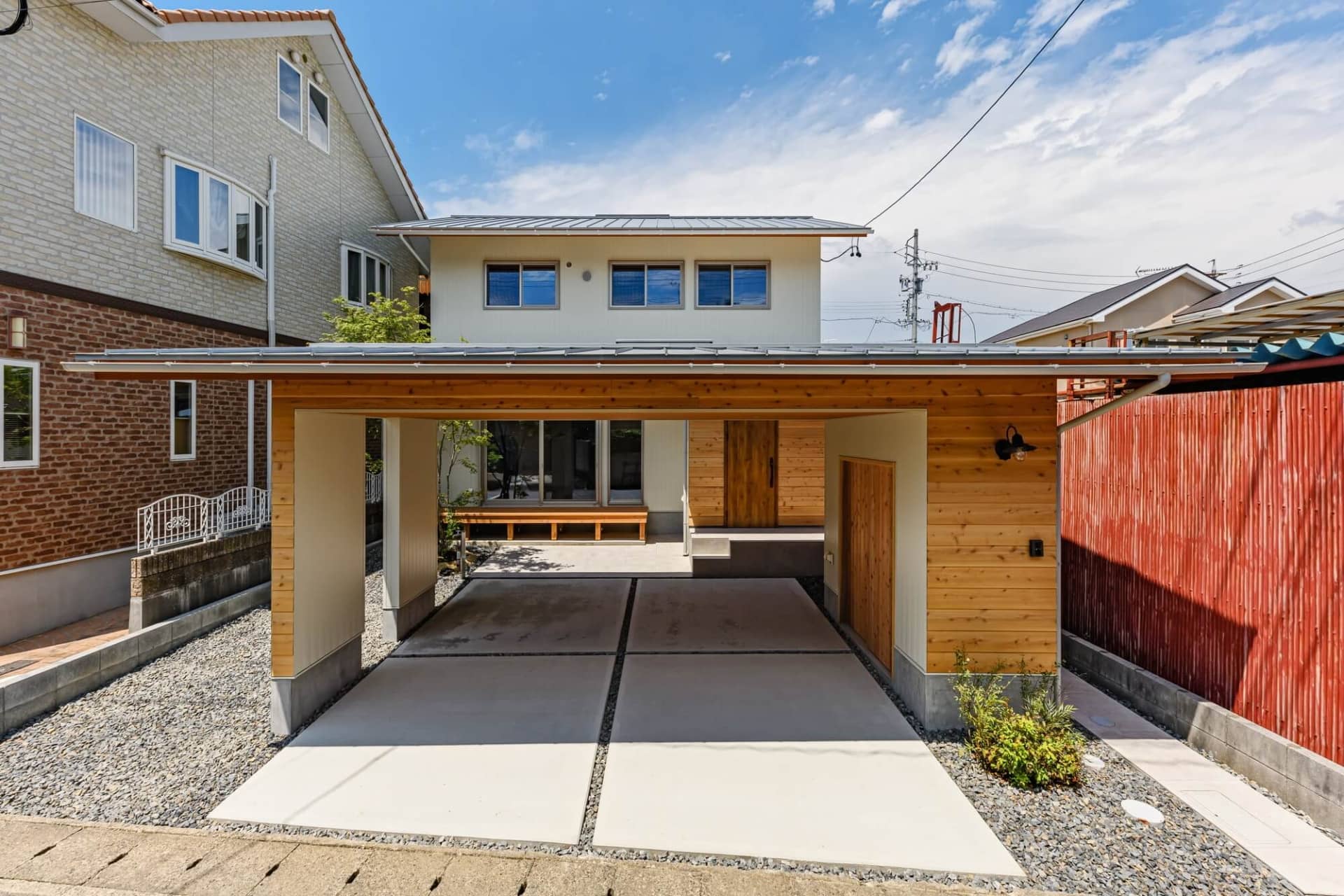 外観は外部収納も設置した2台分のビルトインガレージが印象的です。玄関へ雨にほぼ濡れずにアクセス可能です。
