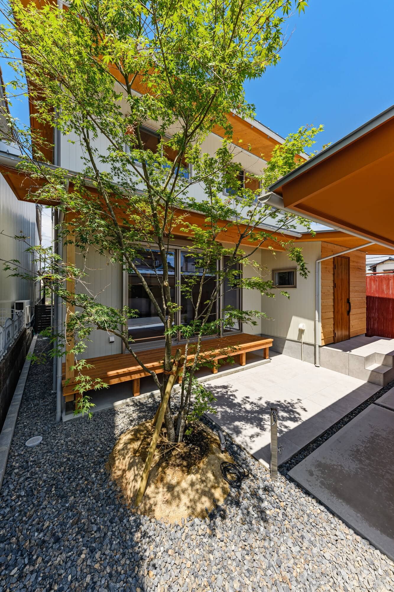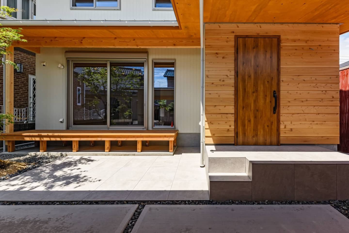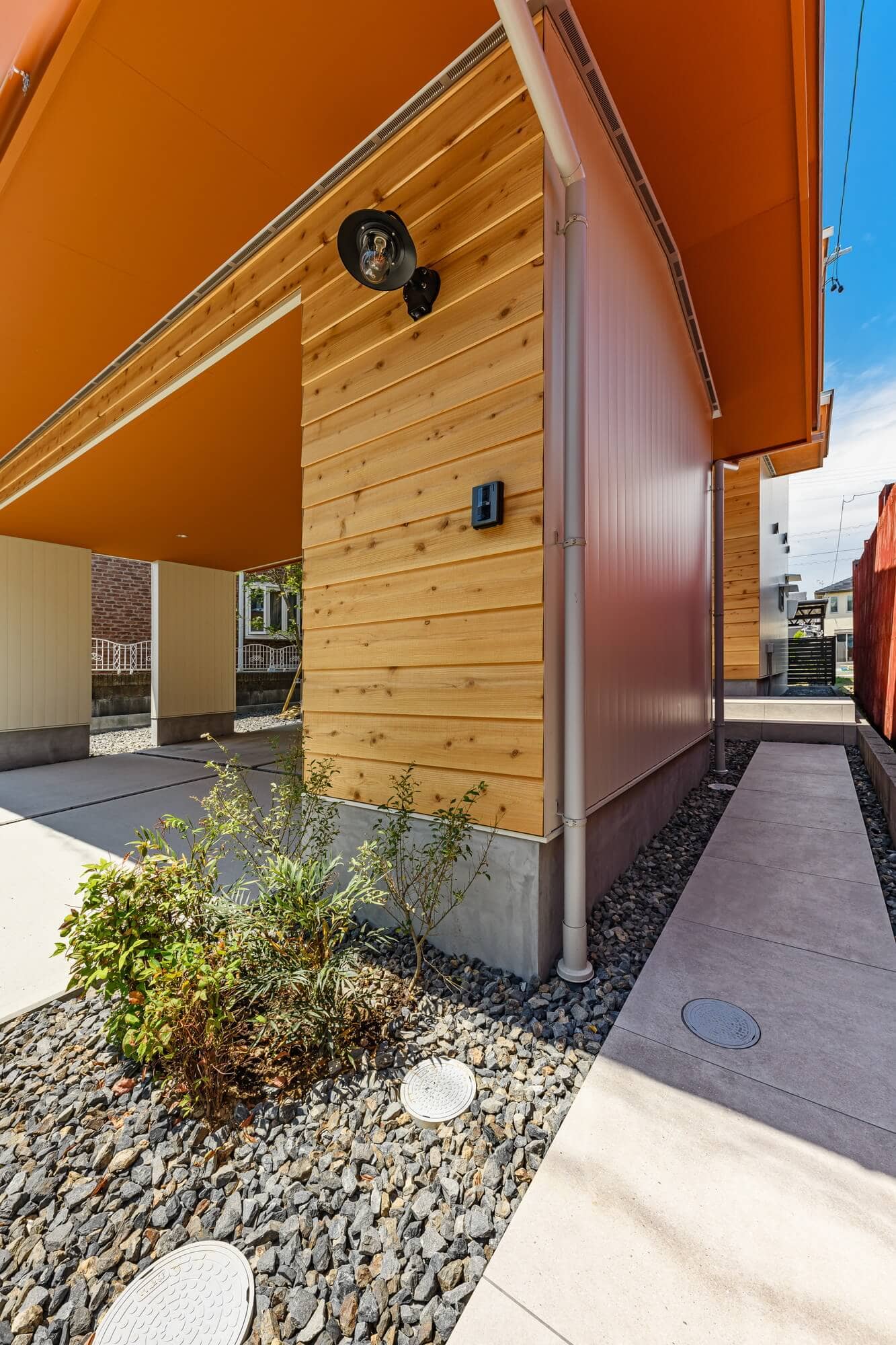 外観は外部収納も設置した2台分のビルトインガレージが印象的です。玄関へ雨にほぼ濡れずにアクセス可能です。