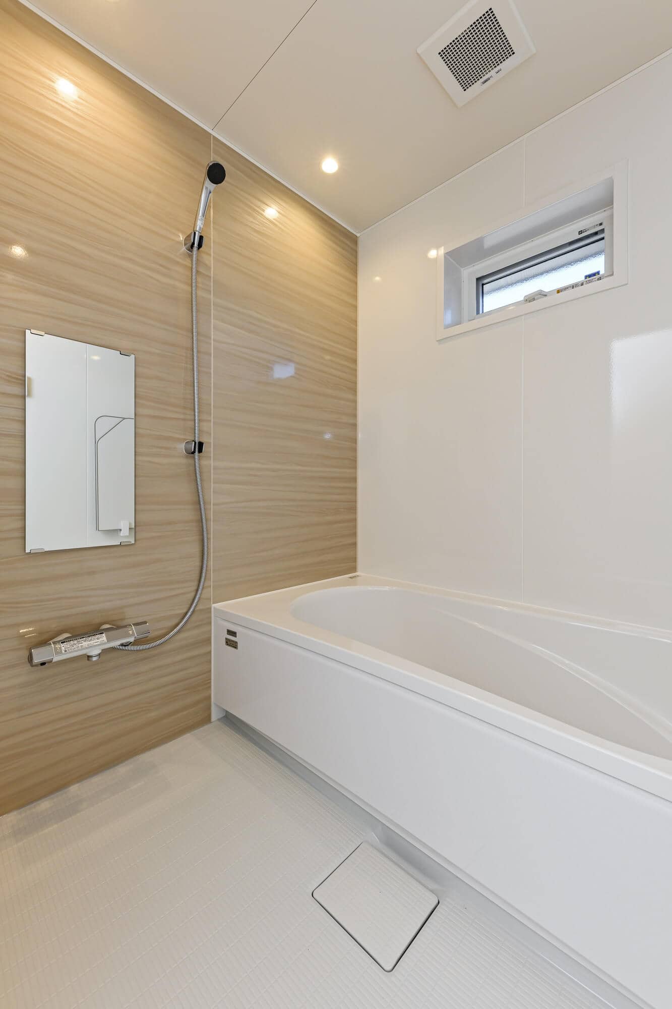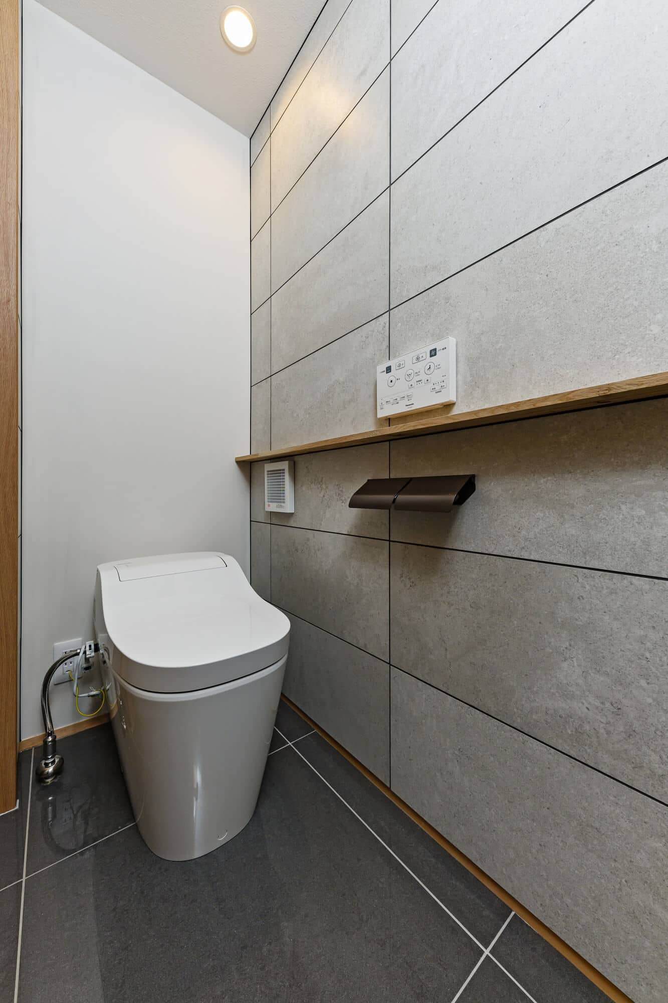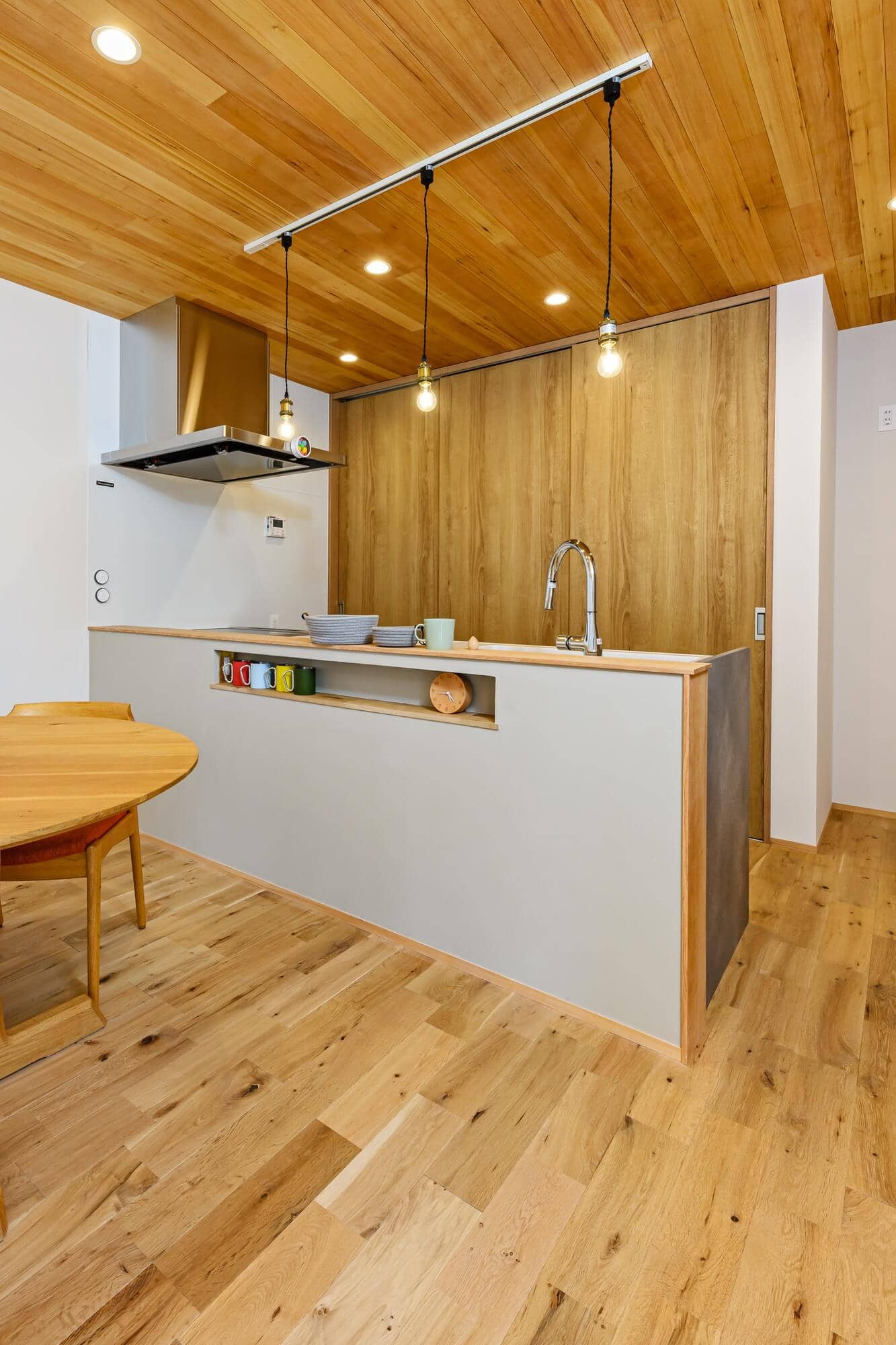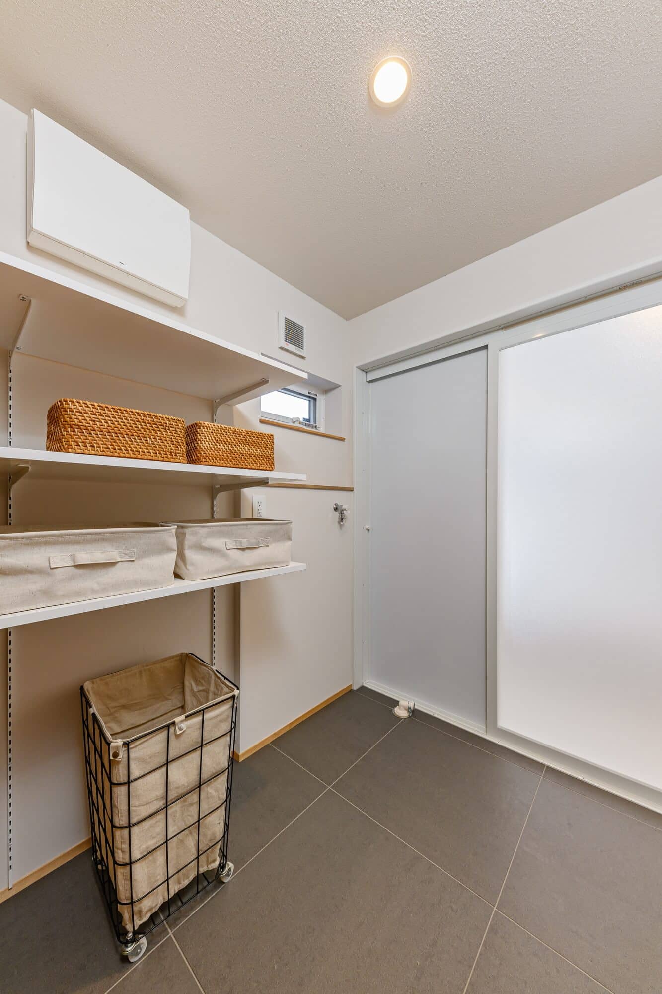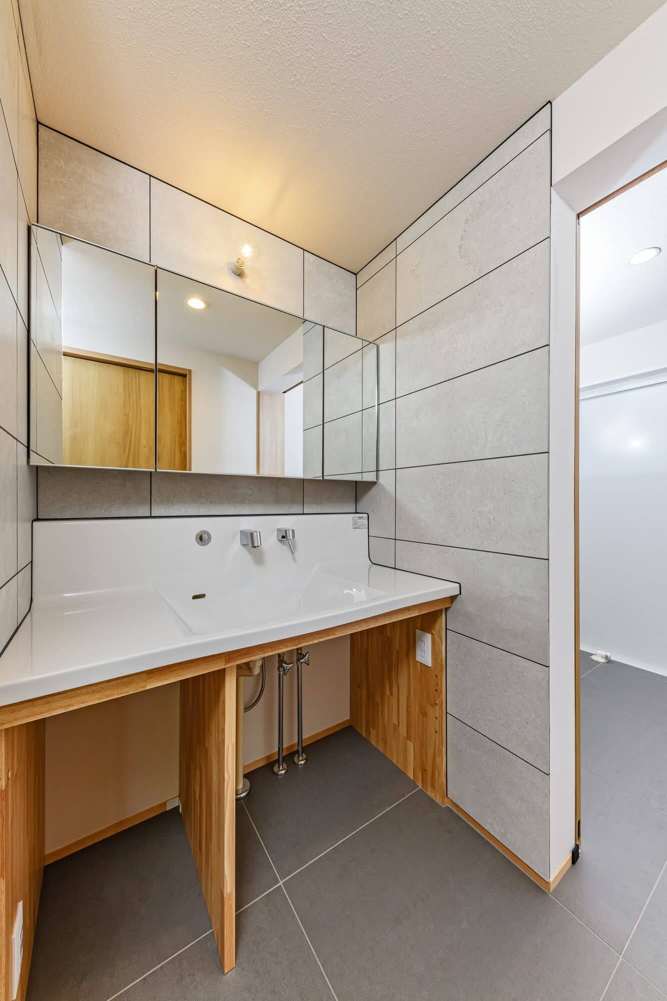 水廻りもリビングに隣接しており、洗面室は既製品洗面を組み合わせた造作洗面を採用しました。