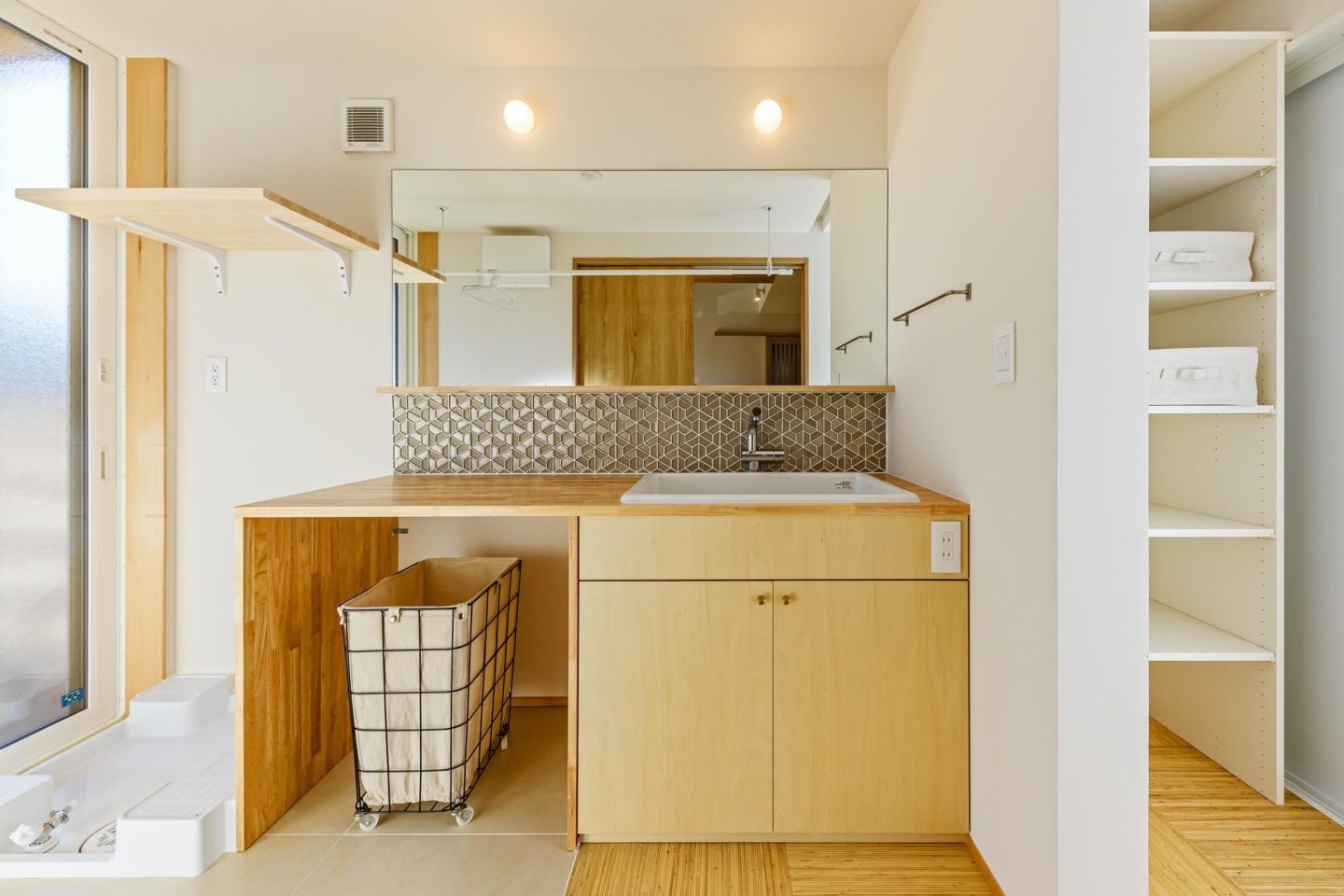 LDKの隣には水廻りを一直線に配置して生活のしやすい動線を実現。洗面室はサンルームも兼ねていて、外干しが出来るウッドデッキへの接続もバッチリです。