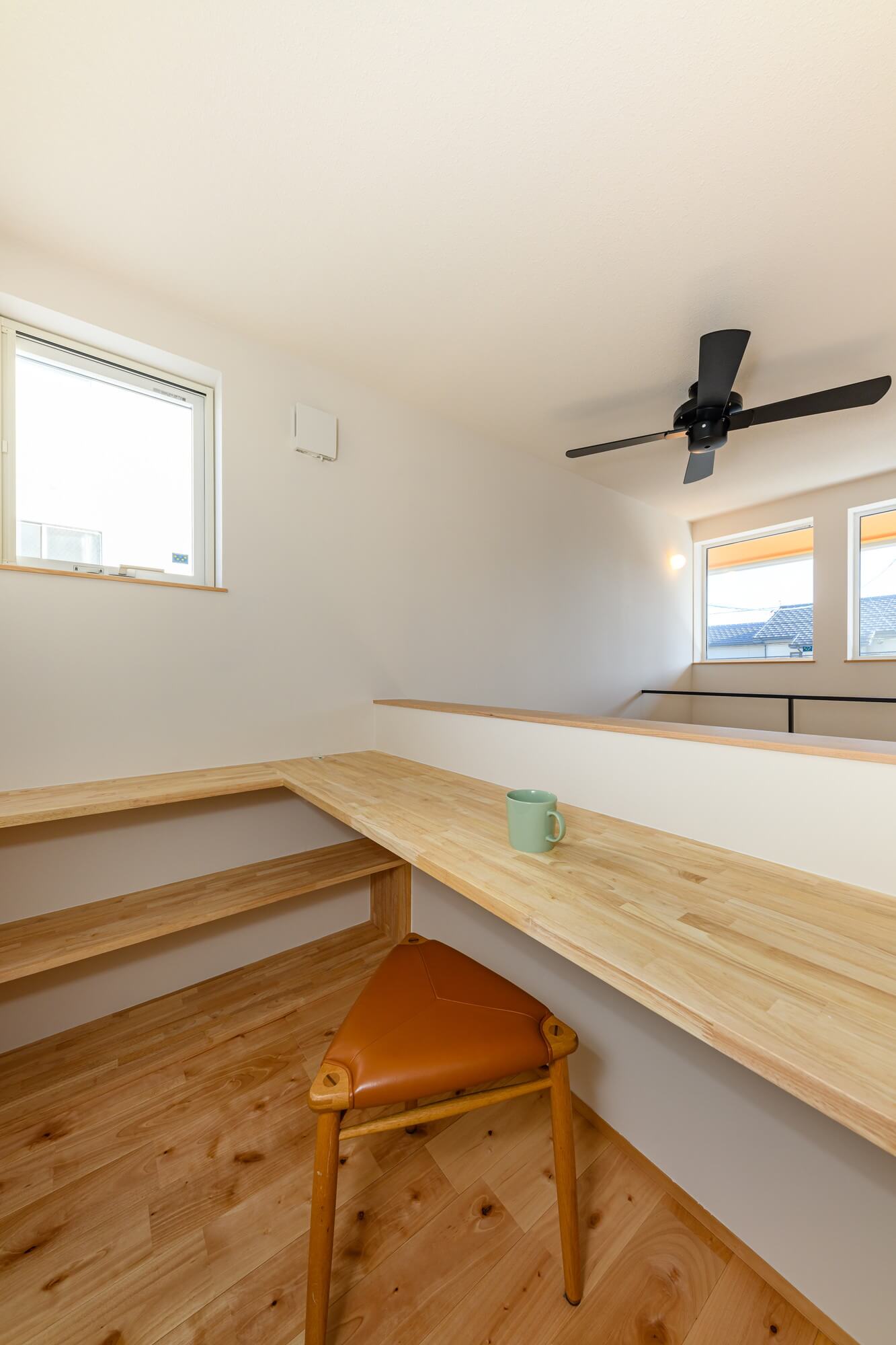 2階廊下にはワークスペースを設置し、リビングの家族の気配を感じつつも集中して作業ができます。