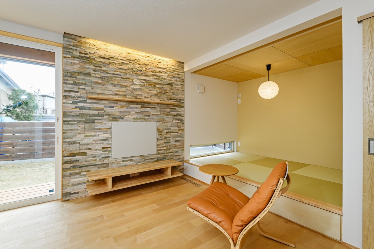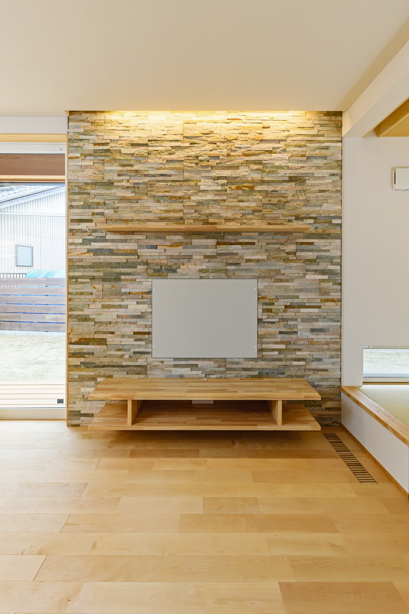 リビングには、こだわりのタイルに壁掛けテレビでお掃除のしやすさにもこだわりました。