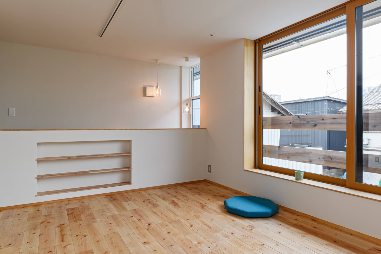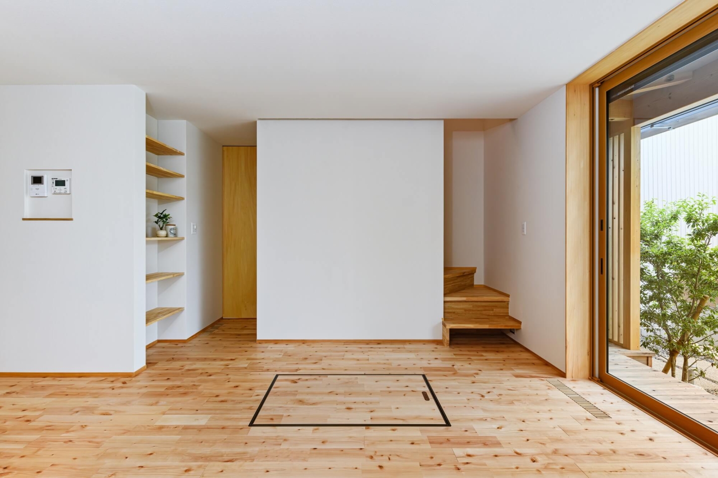 夏は二階のエアコンで全館冷房を目指して、暖かい空気が上に上がり、冷たい空気が下に降りる性質を利用した空気循環ガラリを採用。