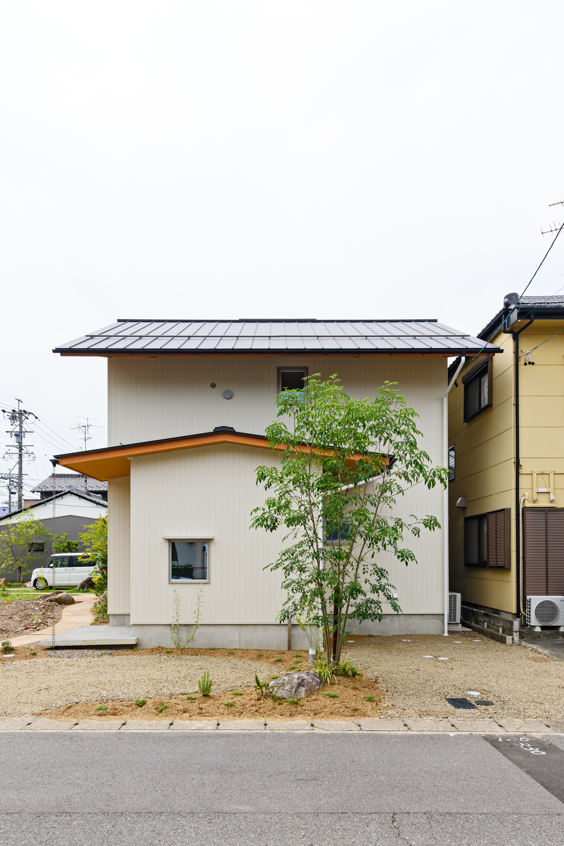 アイボリーのガルバリウム鋼板と植栽の緑のコントラストが美しいお住まいです。