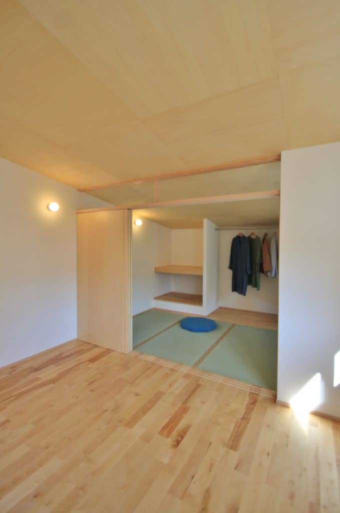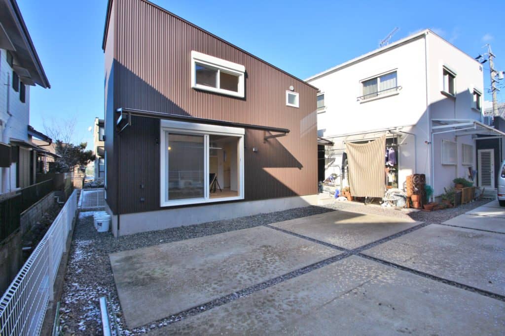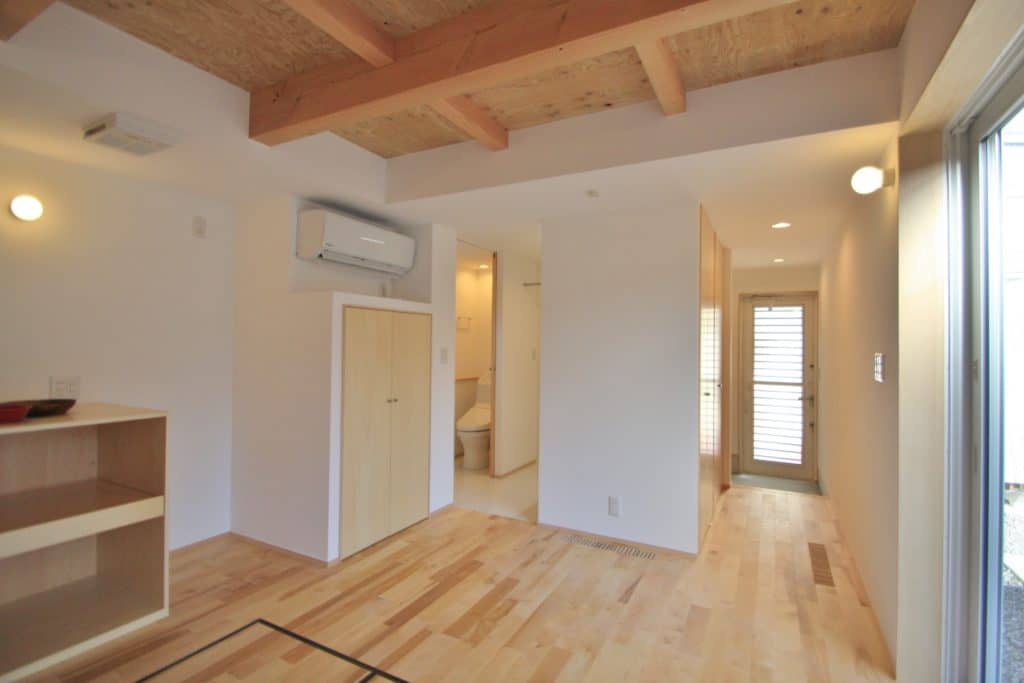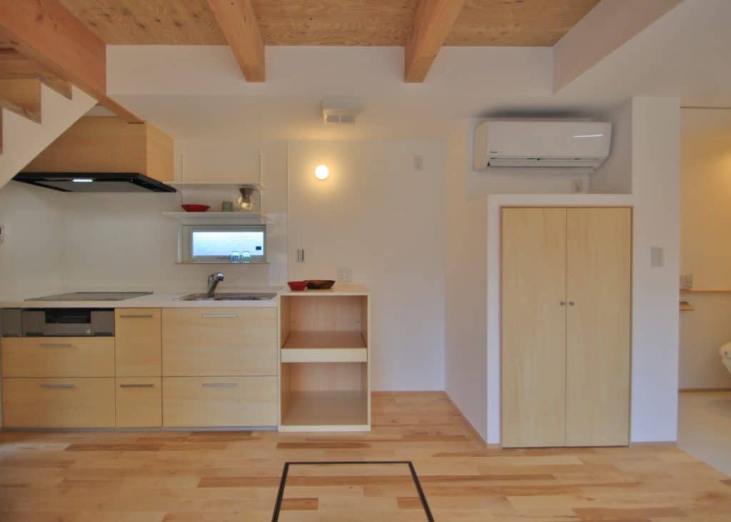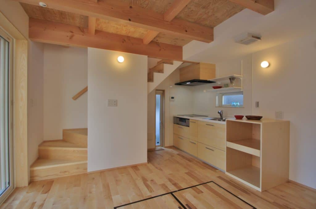 外壁はシンプルな形状を生かし、ガルバリウム鋼板としました。 水廻り設備はコンパクトながら使い勝手は必要充分です。 室内は全て塗り壁+無垢床とし、室内環境は快適です。