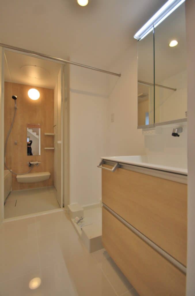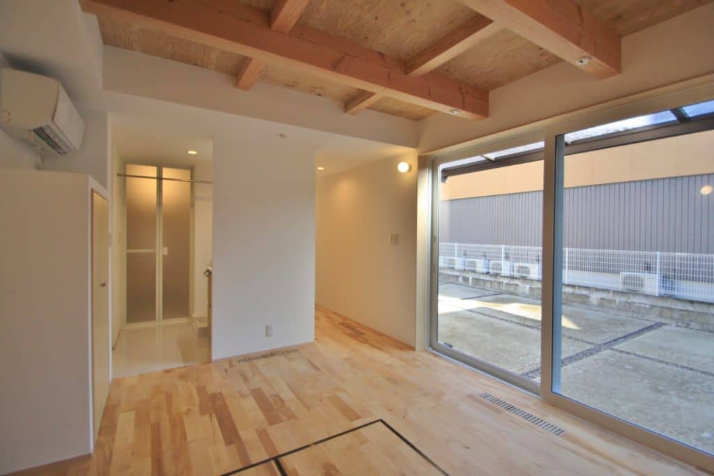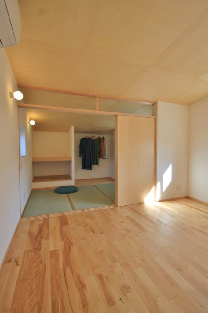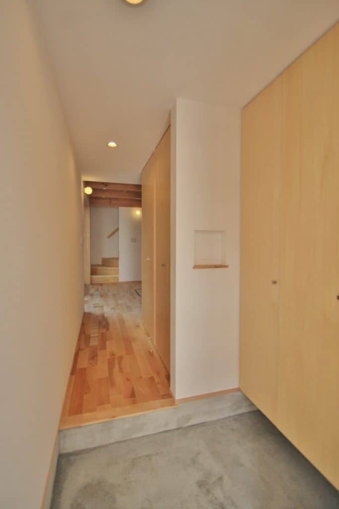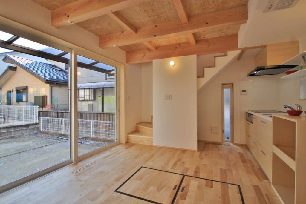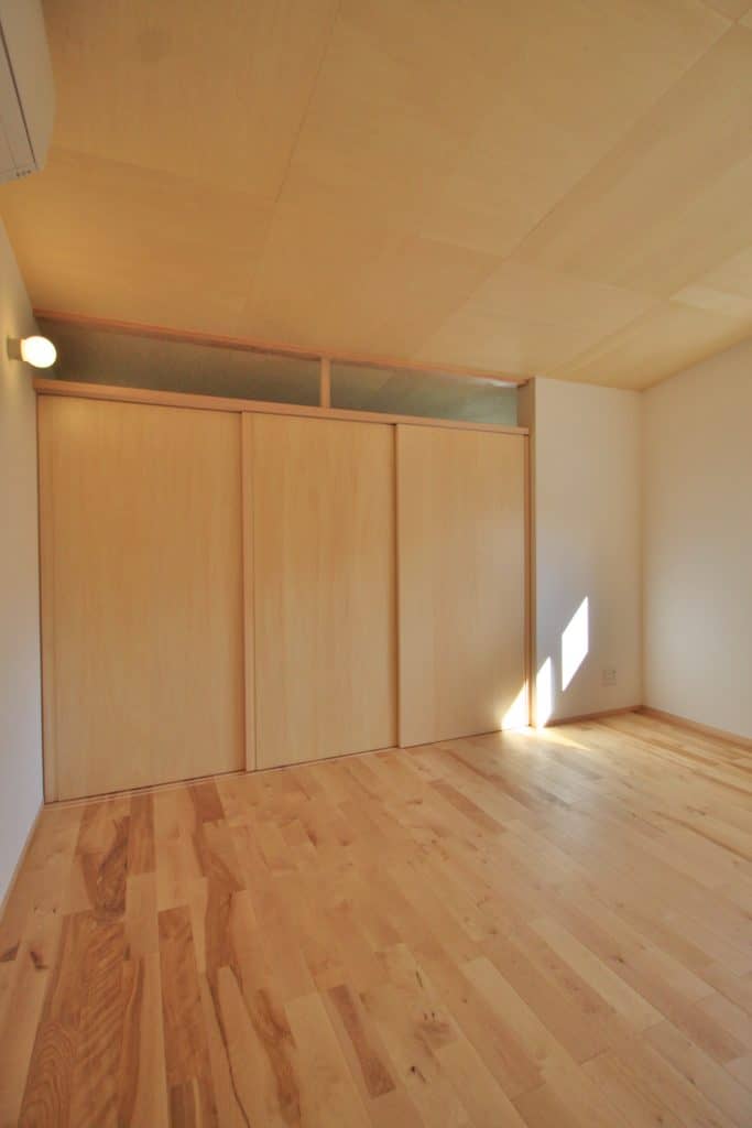 外壁はシンプルな形状を生かし、ガルバリウム鋼板としました。 水廻り設備はコンパクトながら使い勝手は必要充分です。 室内は全て塗り壁+無垢床とし、室内環境は快適です。