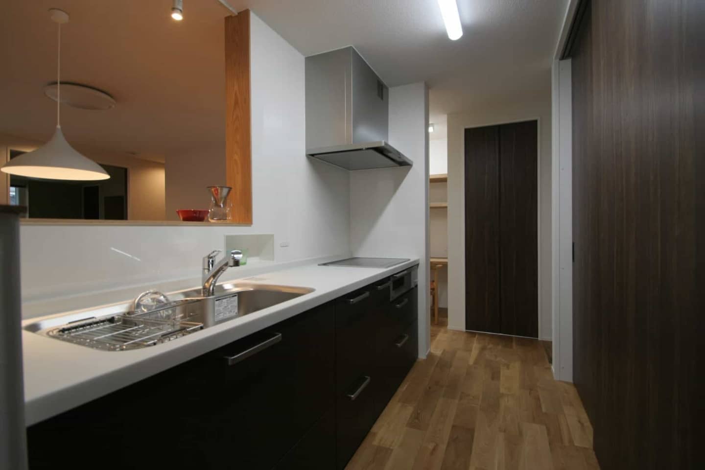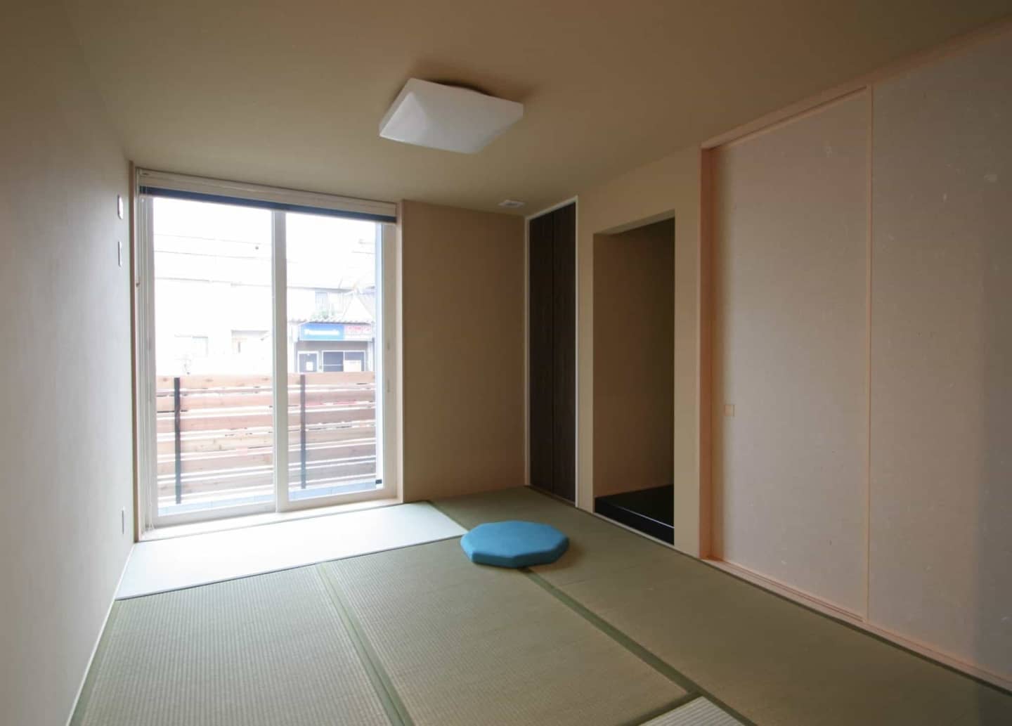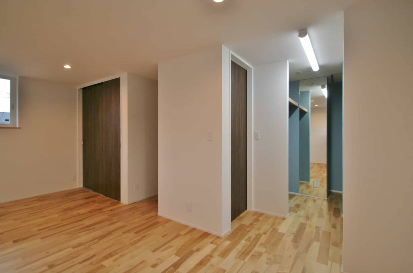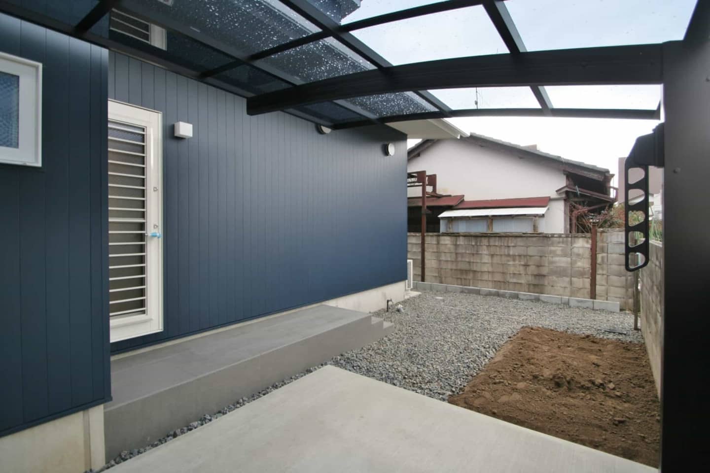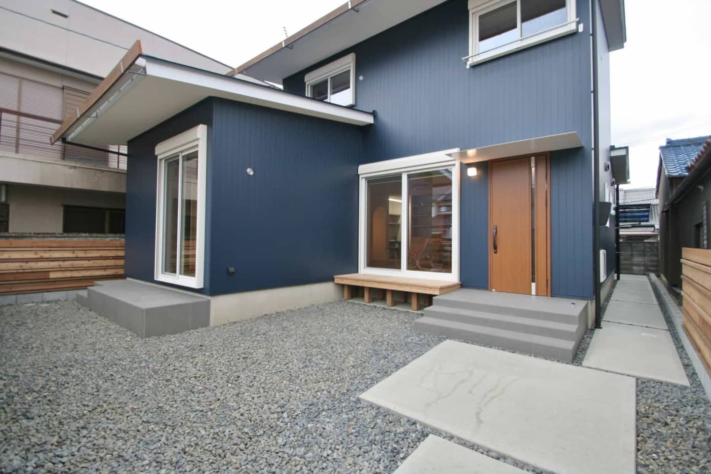 外壁はエムズ初のダークブルーのガルバリウム(スパン105溝なし)を使用。書斎には解体前のお住まいから持ち込んだ思い入れのある床柱を使用。水廻りを直線に配置することで将来ご両親のケアが必要になった時でも負担を減らすことができます。