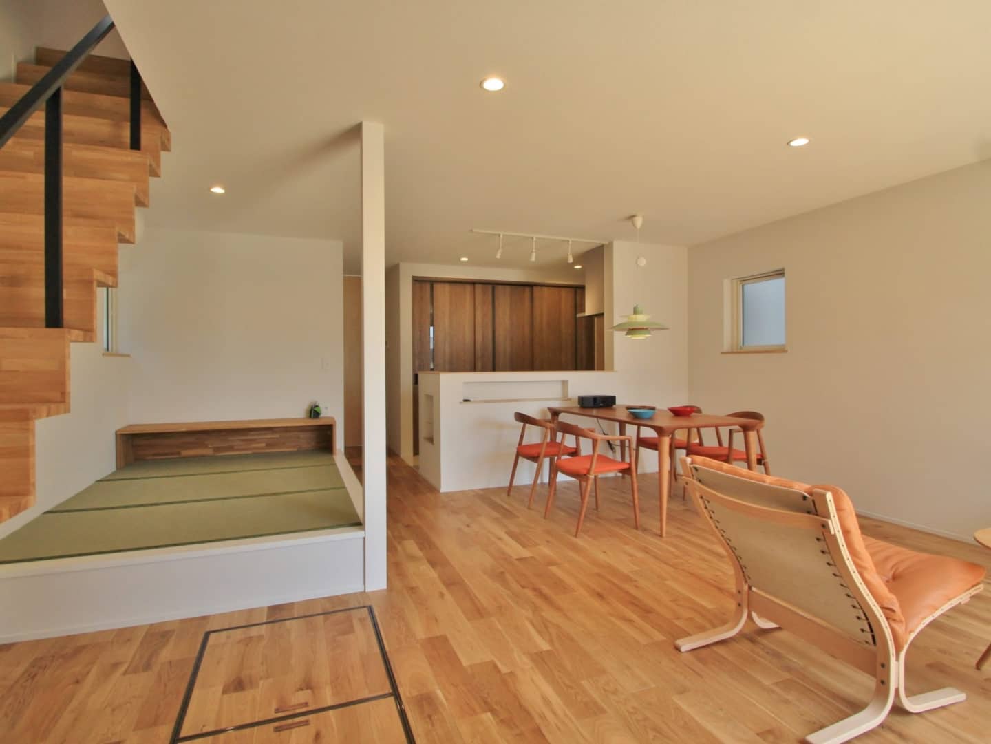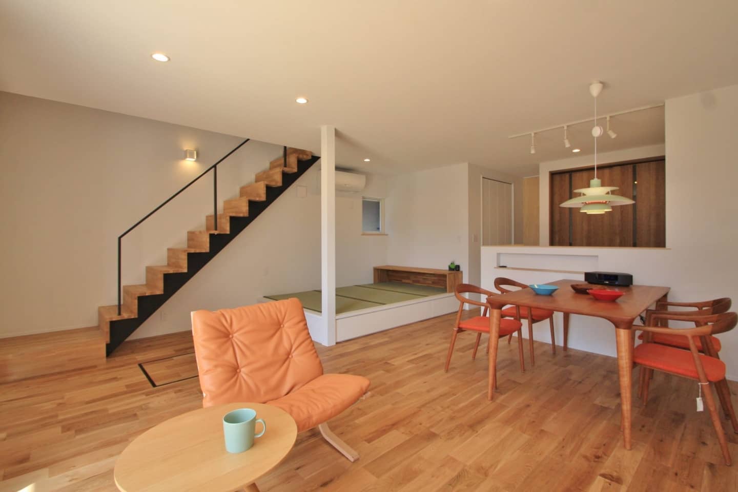 リビングにある階段はオープンにすることで圧迫感の無い開放的な空間にしました。キッチン横には大きめのパントリーがあり、移動距離もなく、荷物の出し入れがスムーズにできます。