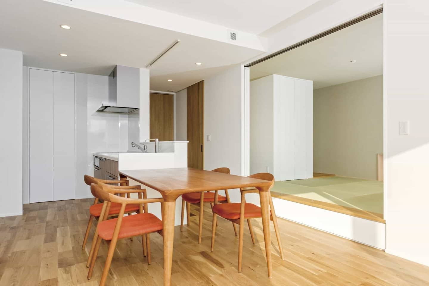 キッチンとダイニングを横並びに。これなら食卓へ回り込む必要がなく横移動だけで配膳、後片付けが出来ます。