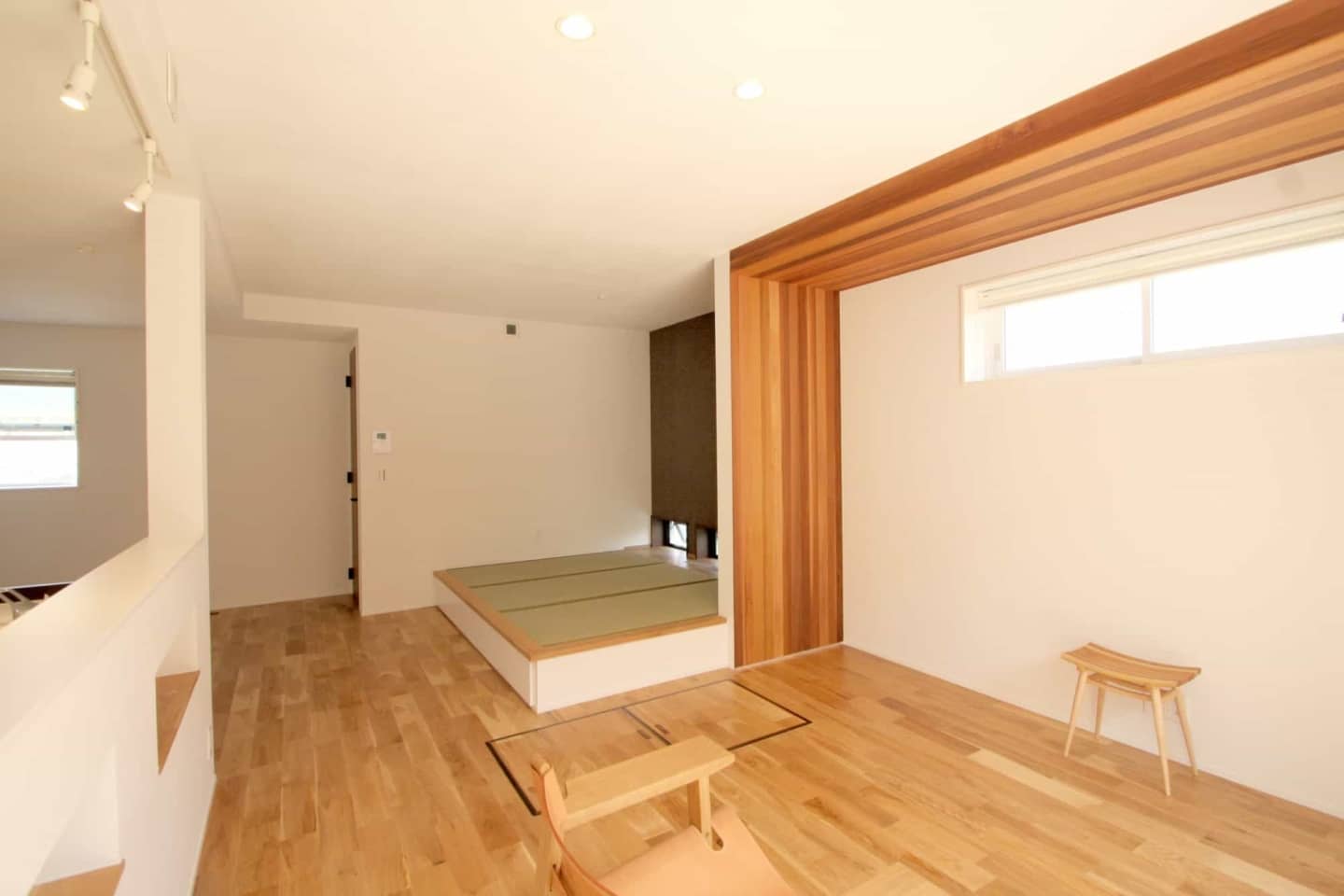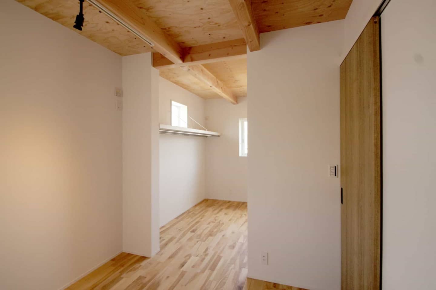 随所に設けられた造作棚はしまうものを想定し、使いやすい高さに設定。 2階は天井を貼らず、構造現しに。天井高が高くなり開放感があります。 床は1階がオークの無垢材、壁は全室塗り壁(ダイアトーマス)です。
