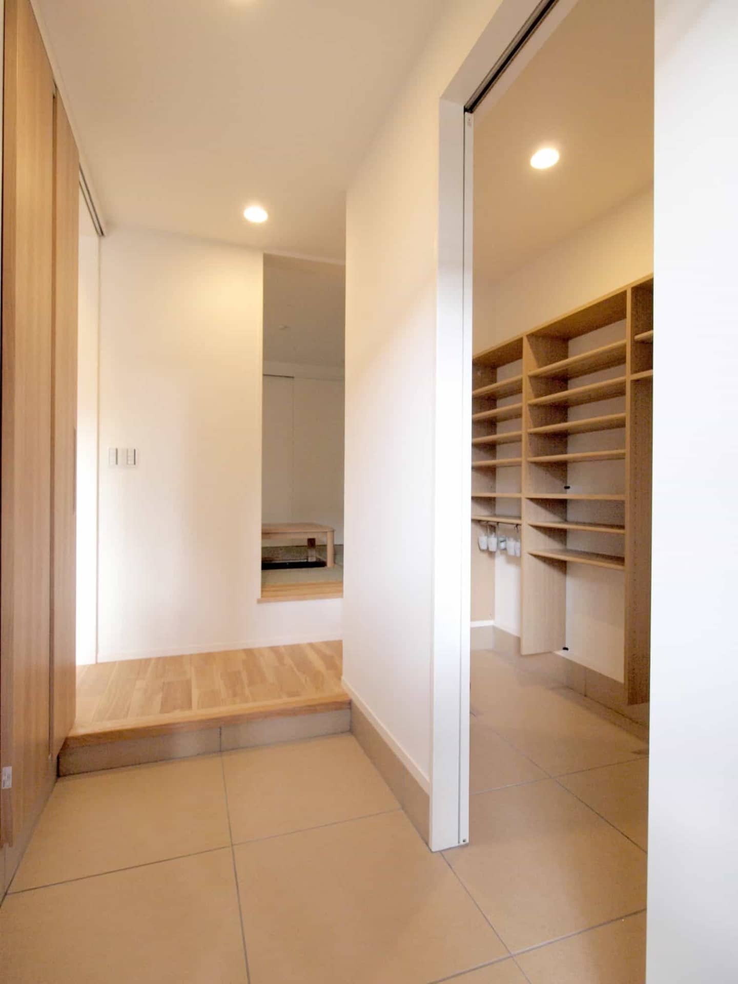 出来るだけ環境負荷を減らす住まいを設計。 玄関横には大容量のウォークスルーの玄関収納を配置。