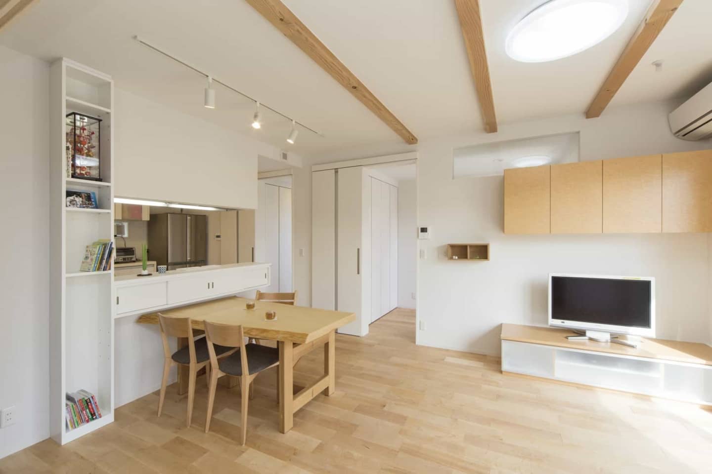 床はメープルの床材を使用。内部の壁は塗り壁(ダイアトーマス)仕上げです。